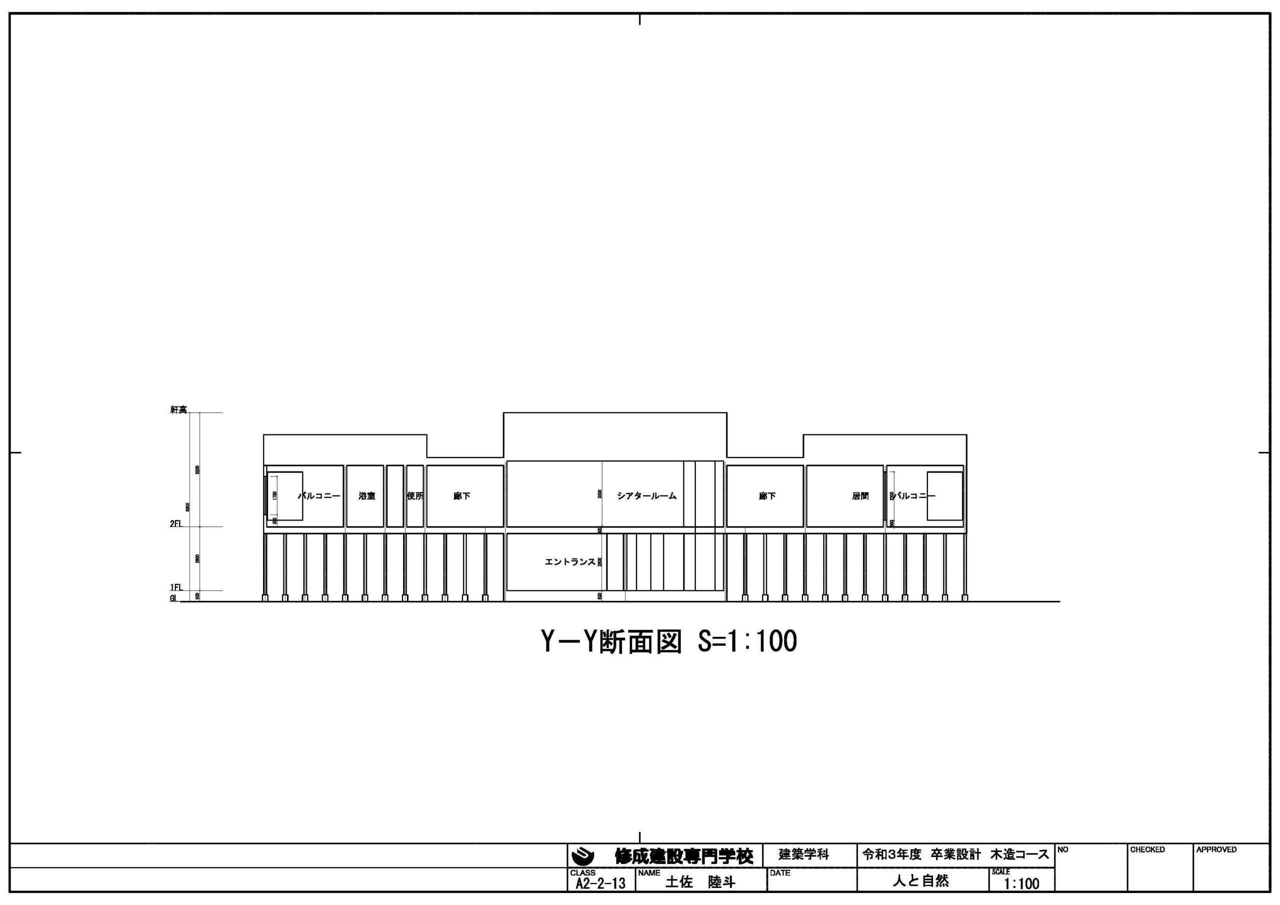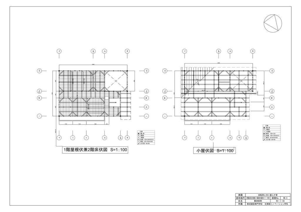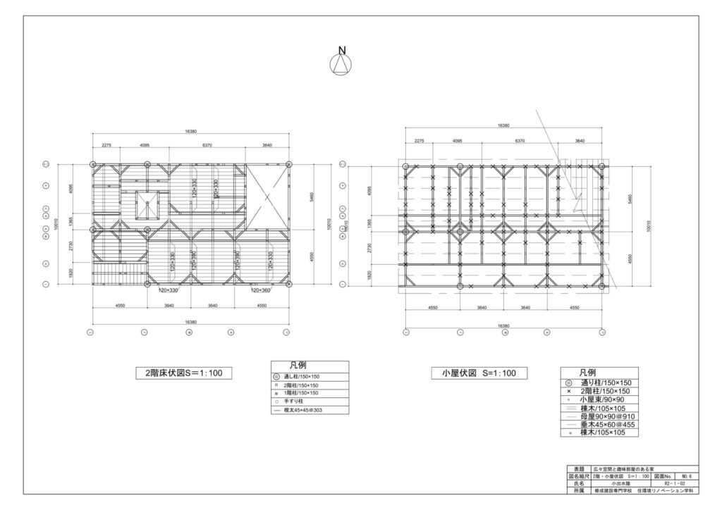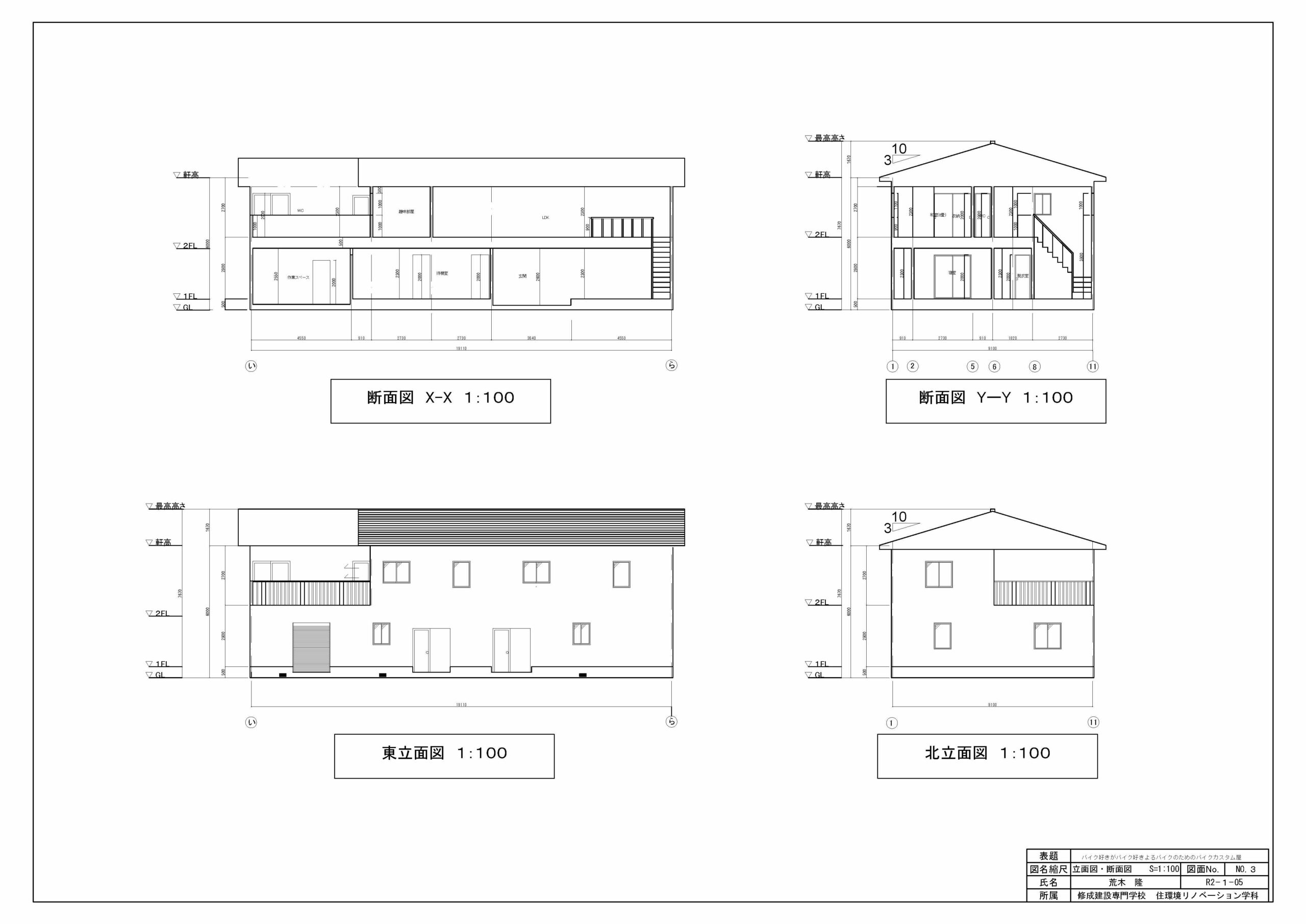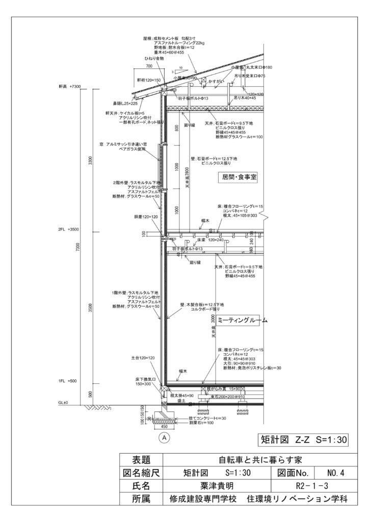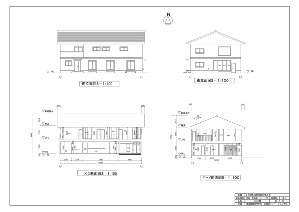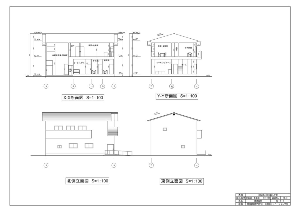彼はバイク好きでバイクを通して人との繋がりを形にした作品でした。カスタムバイク屋としての店舗、友人が集まれる集会所、プライベート空間を一つの建物の中に納める事に苦労していたが、彼自身の考えを形に出来たと感じた。構造図、矩計図を描く事で、構造部材や構造について理解が深まり2年間の学習の集大成になったのではないでしょうか。真面目に取り組んだ彼らしい作品でした。 <井上 嘉亮>