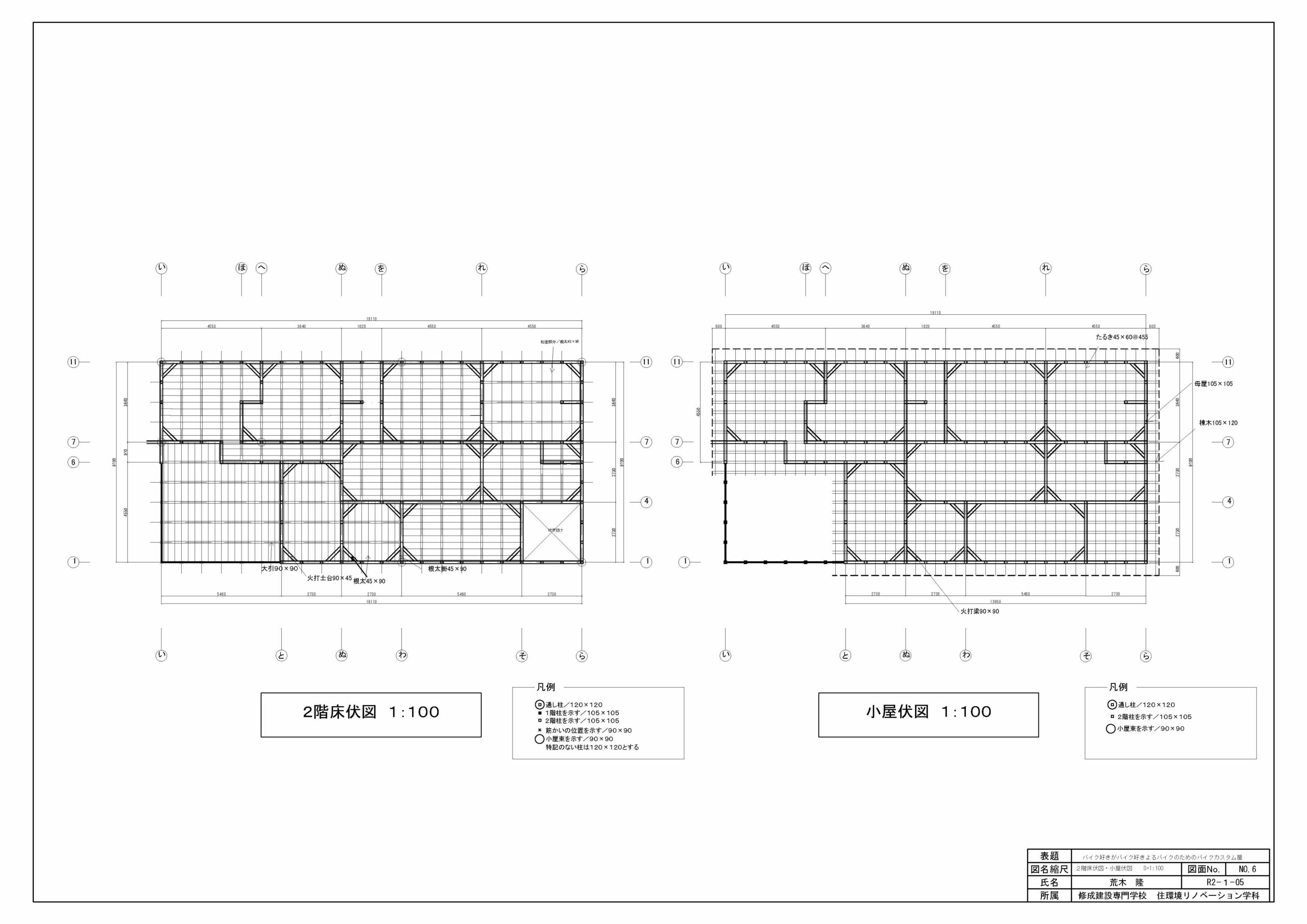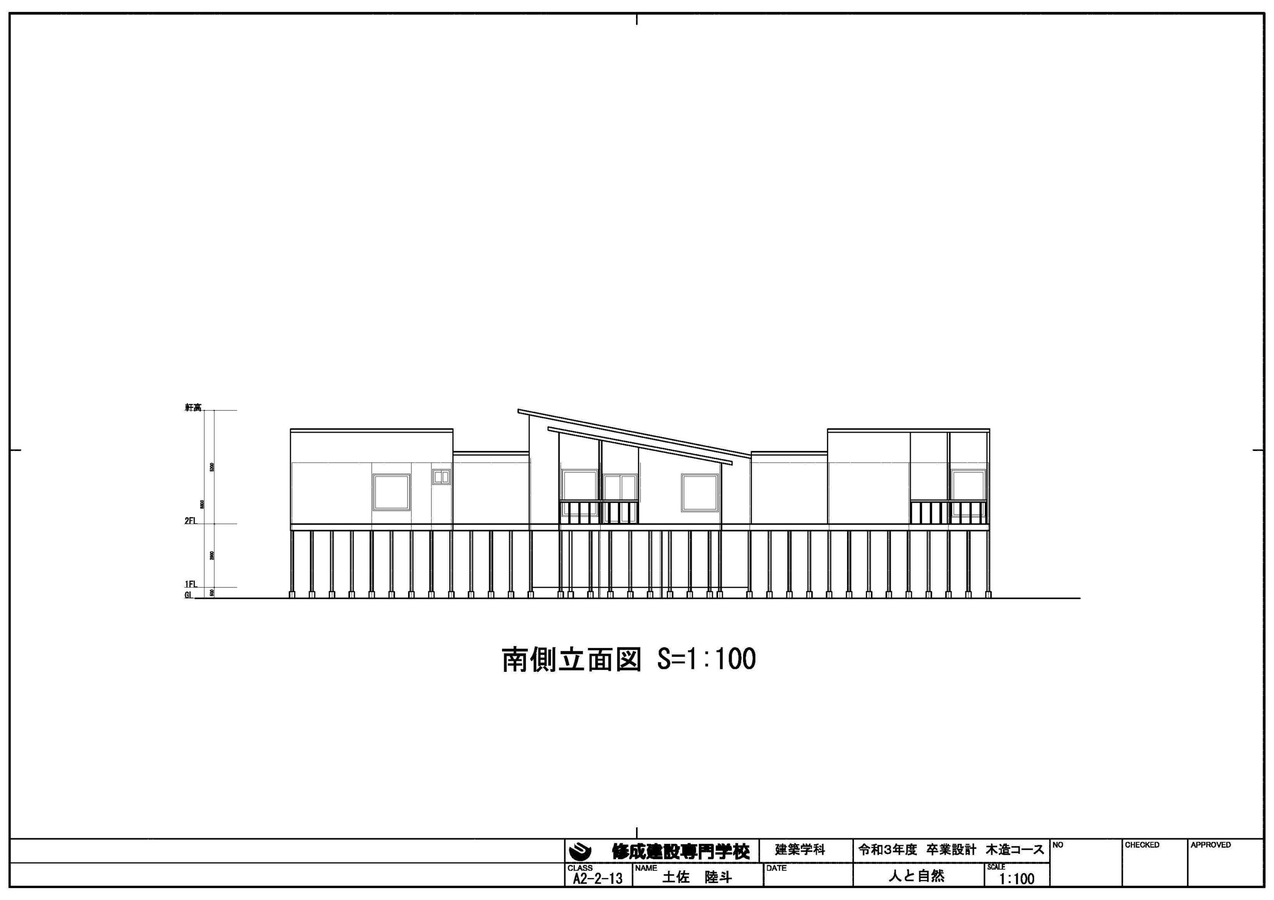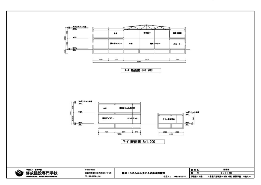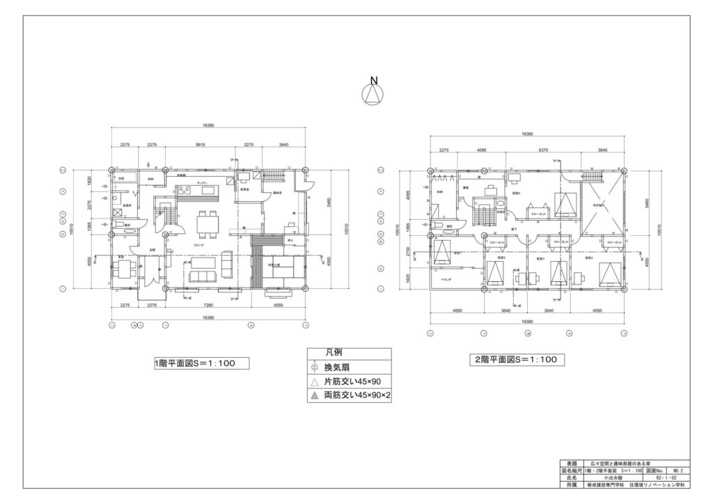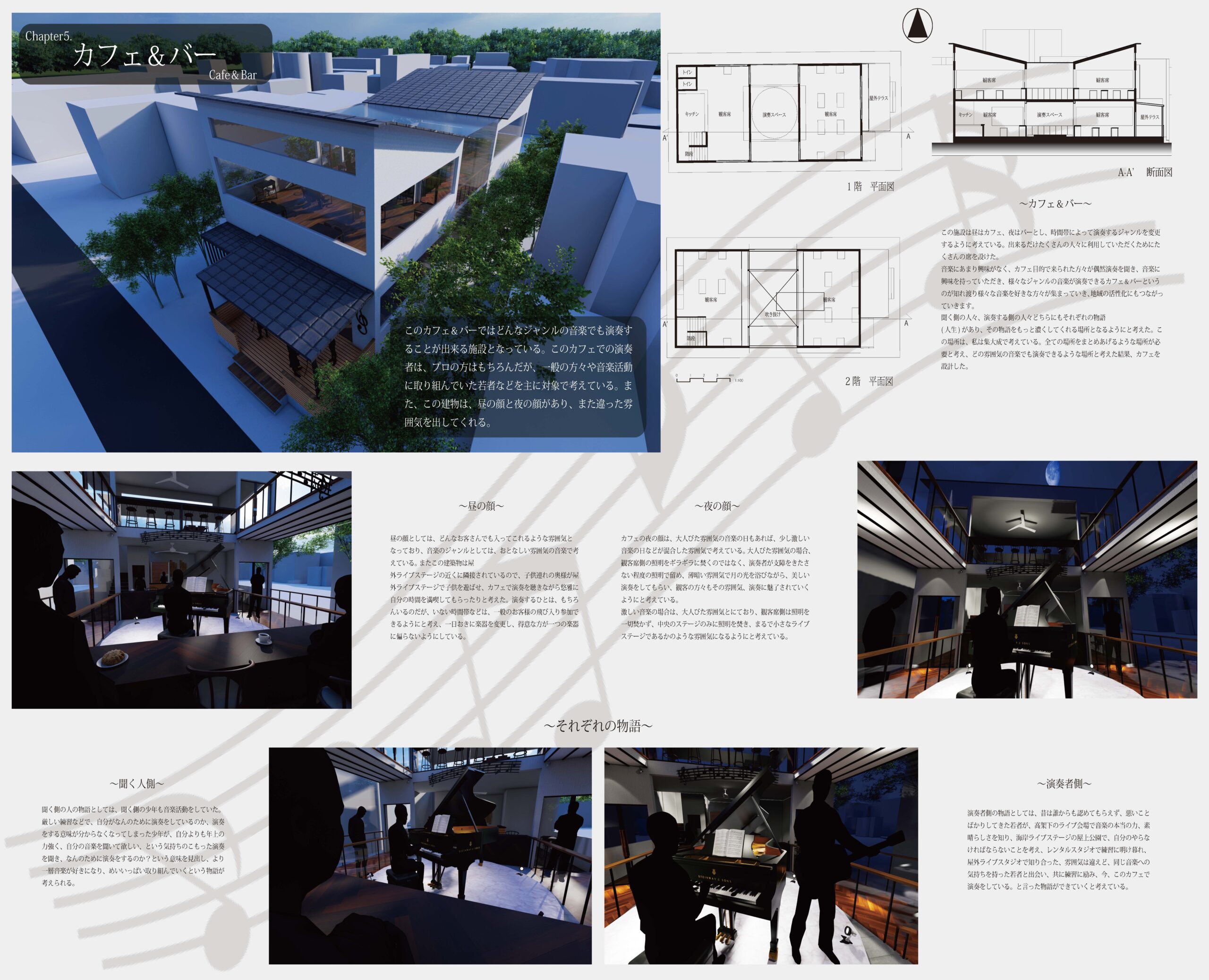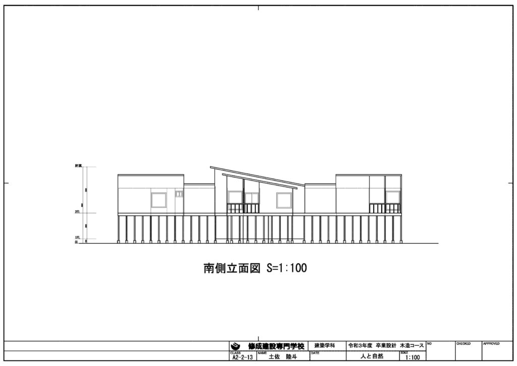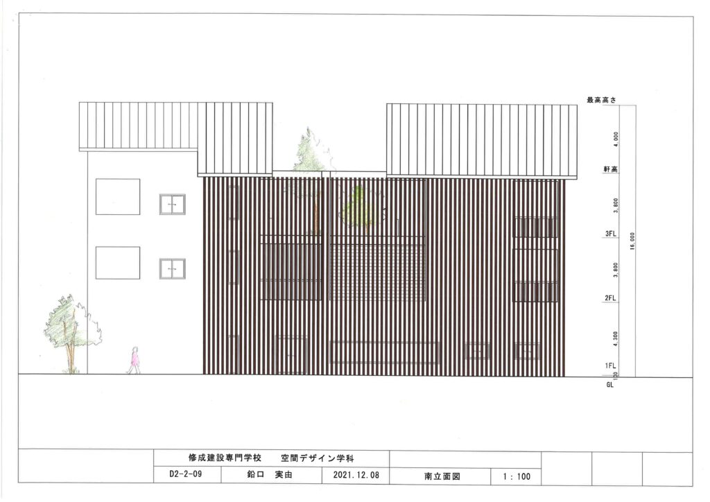 彼はバイク好きでバイクを通して人との繋がりを形にした作品でした。カスタムバイク屋としての店舗、友人が集まれる集会所、プライベート空間を一つの建物の中に納める事に苦労していたが、彼自身の考えを形に出来たと感じた。構造図、矩計図を描く事で、構造部材や構造について理解が深まり2年間の学習の集大成になったのではないでしょうか。真面目に取り組んだ彼らしい作品でした。 <井上 嘉亮>