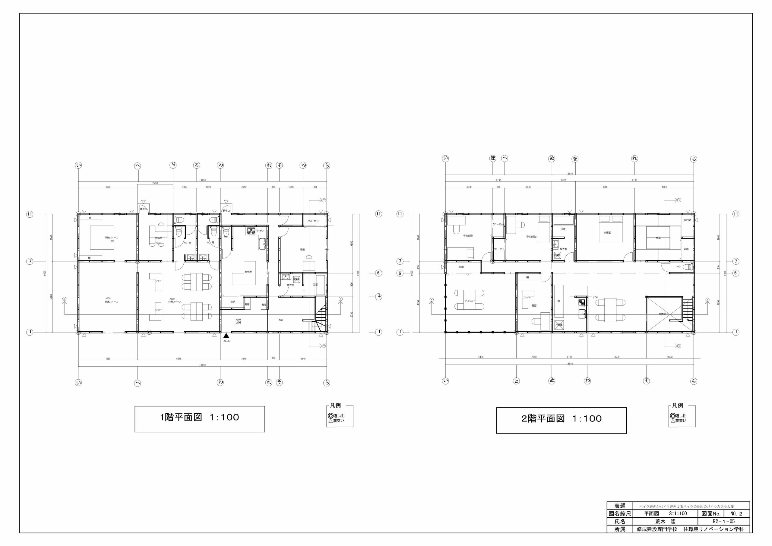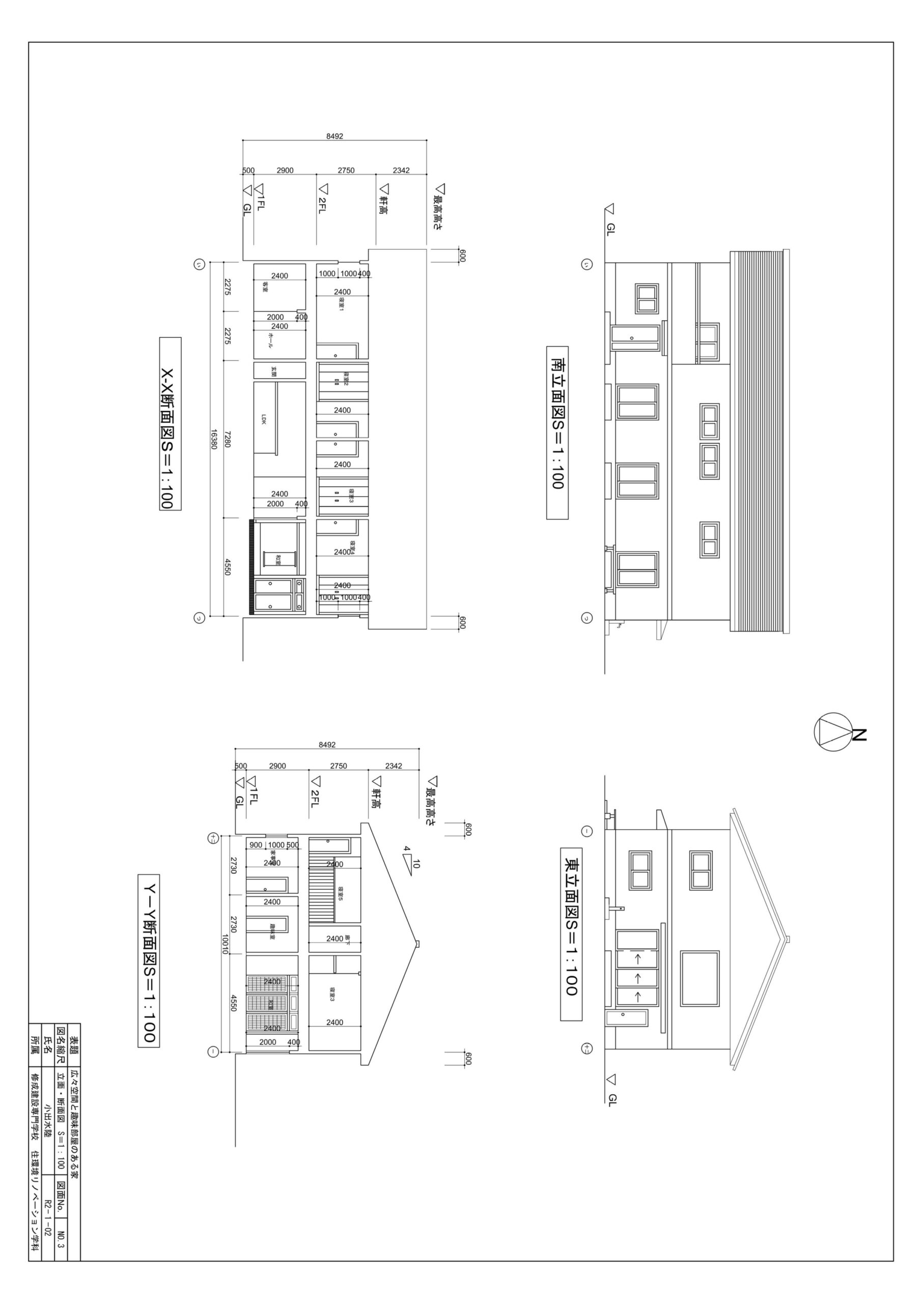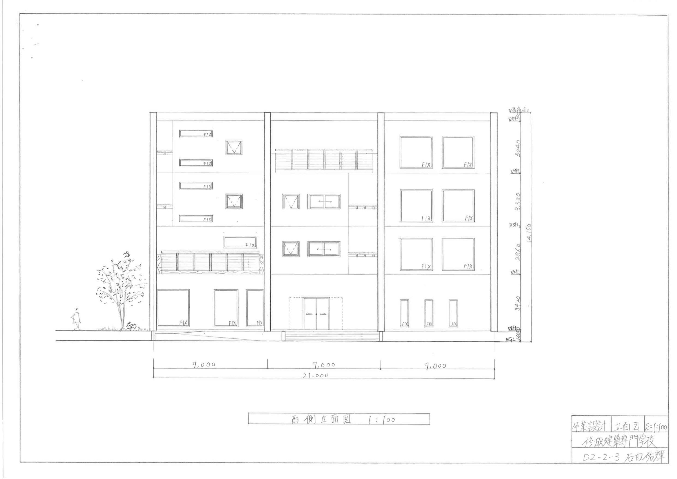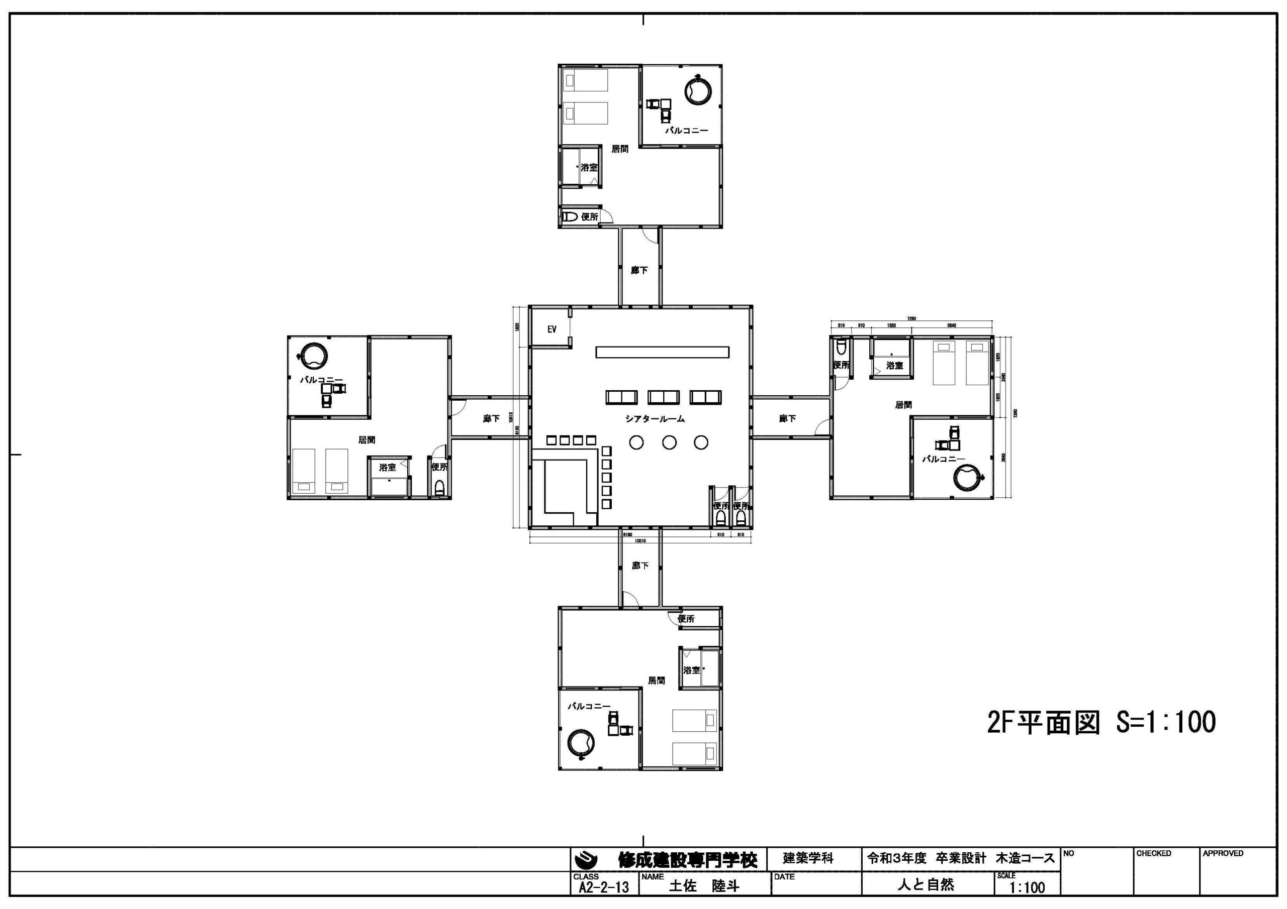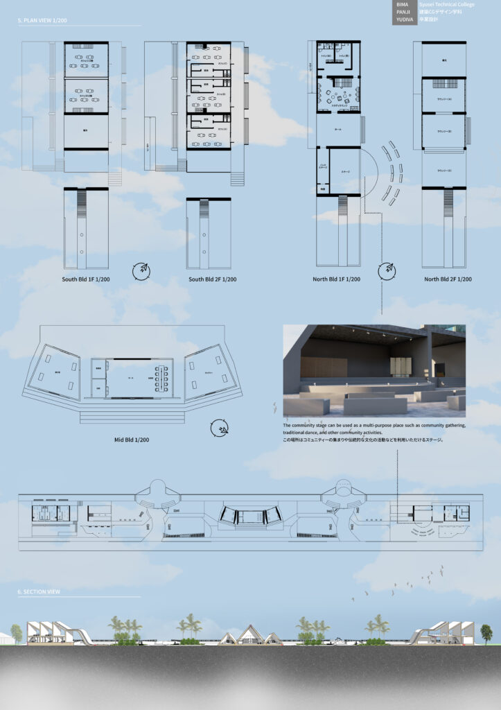 彼はバイク好きでバイクを通して人との繋がりを形にした作品でした。カスタムバイク屋としての店舗、友人が集まれる集会所、プライベート空間を一つの建物の中に納める事に苦労していたが、彼自身の考えを形に出来たと感じた。構造図、矩計図を描く事で、構造部材や構造について理解が深まり2年間の学習の集大成になったのではないでしょうか。真面目に取り組んだ彼らしい作品でした。 <井上 嘉亮>