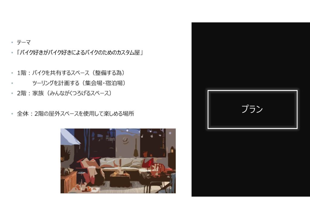 私のコンセプトは、バイク仲間が集まる住宅です。バイクに乗るのが趣味で、共通の趣味をもつ仲間たちと素敵な時間を過ごしたいと思い、設計しました。
