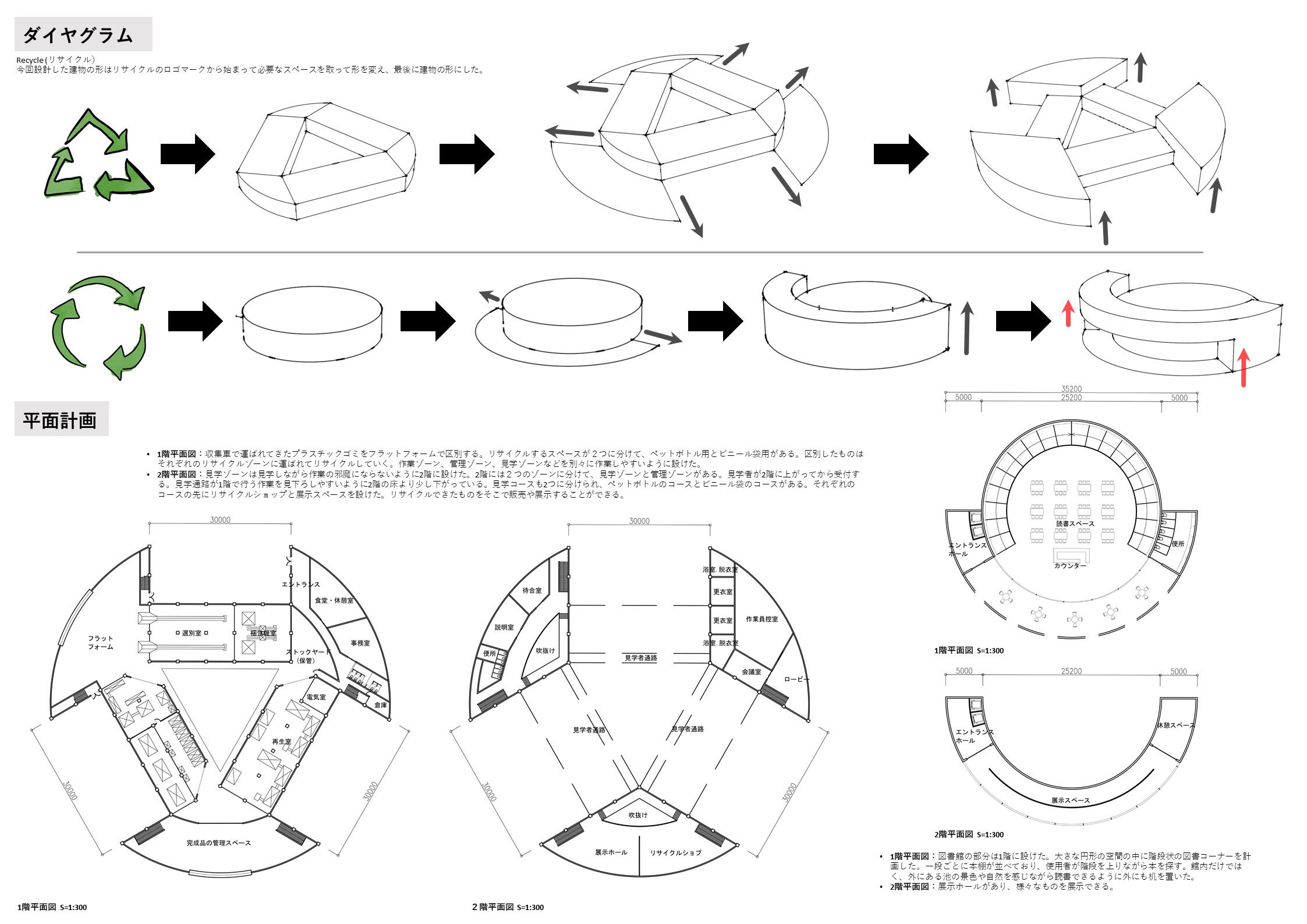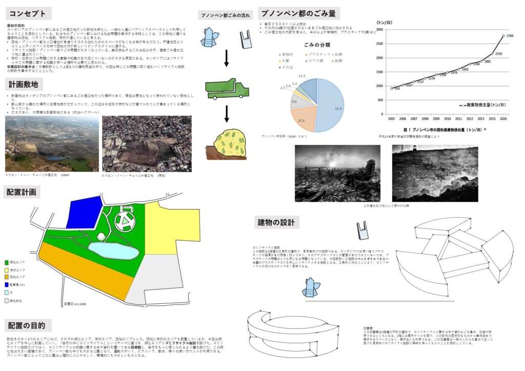 この作品はプノンペン都にある昔のゴミ埋立地だった敷地にゴミ問題に対してリサイクル施設を造ろうという提案です。カンボジアでのゴミ問題を解決する手段としてゴミリサイクルに関する知識や意識を住民に広げたいという目的です。
