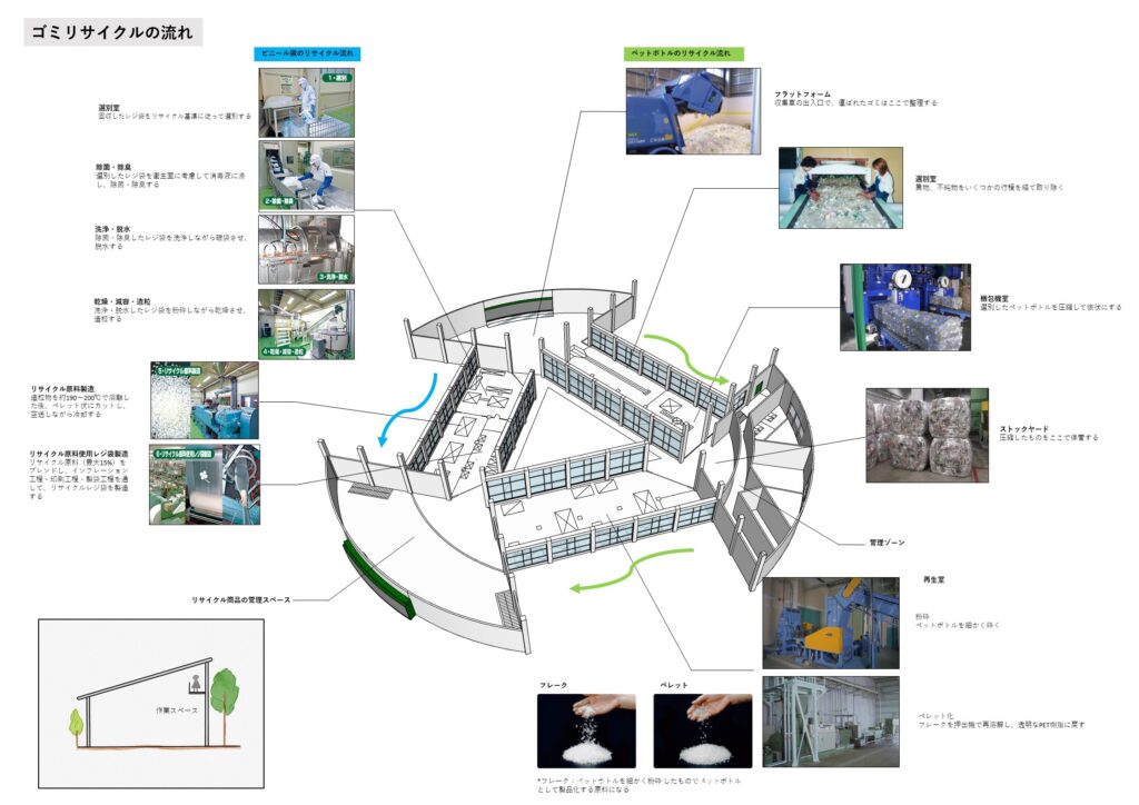 敷地の全体を緑化することによって大きな公園となり、この中に見学者向けのリサイクル施設を設けました。この施設を通じてゴミ問題に関して知識や意識を持って理解して頂ければと思います。