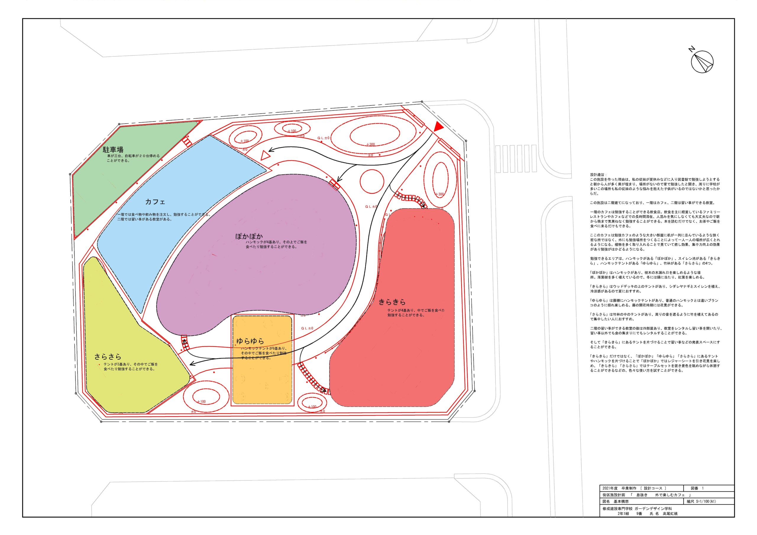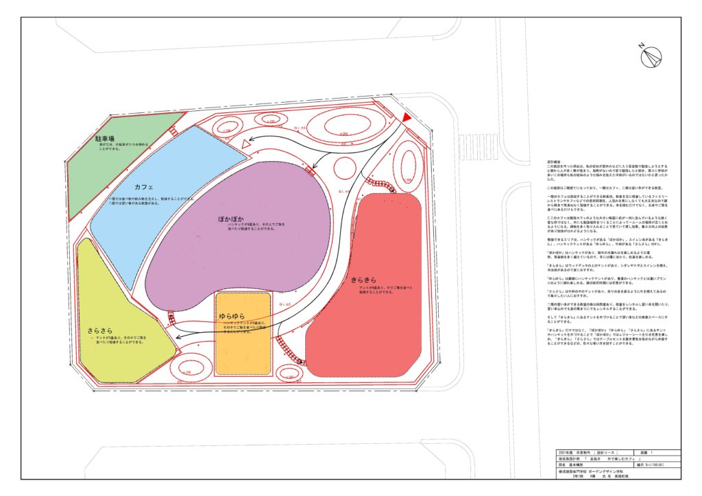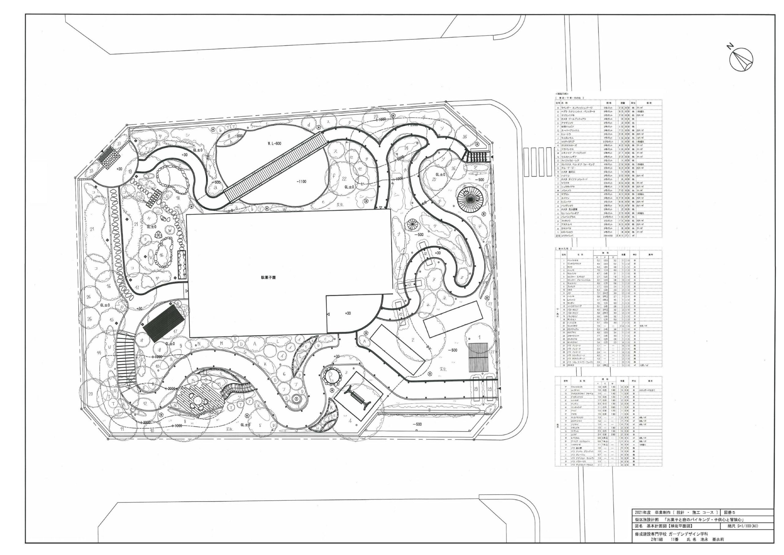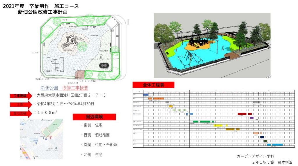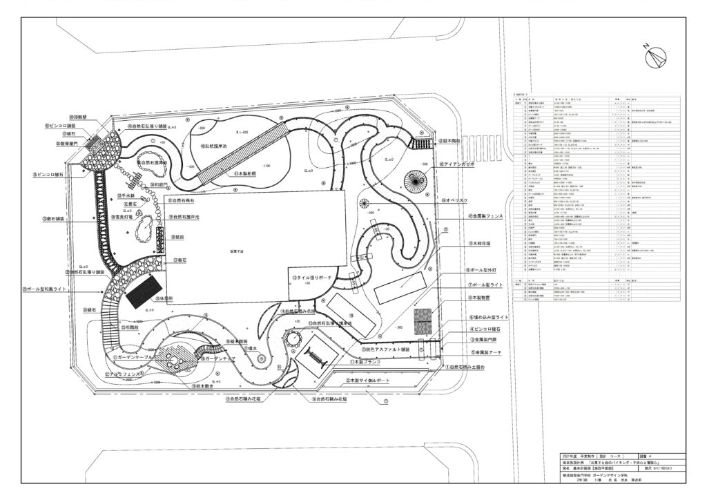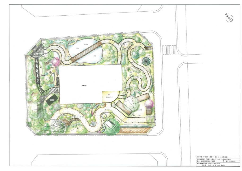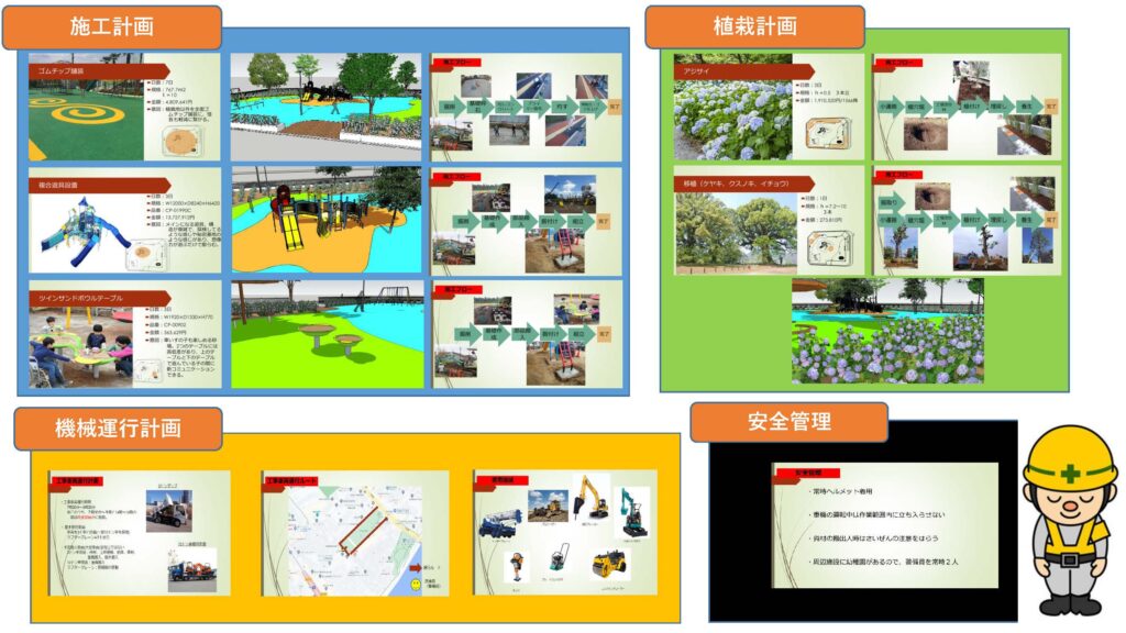 今年度の施工コースは、現況分析から計画主旨を検討し設計をした上で、施工計画を実務的な視点から確認しながら、取り組んでいきました。 子ども利用者が多いことから複合遊具の設置、障害のある子どもも遊べる遊具、安全面を考慮した舗装など、利用者のニーズに対応した計画となっています。