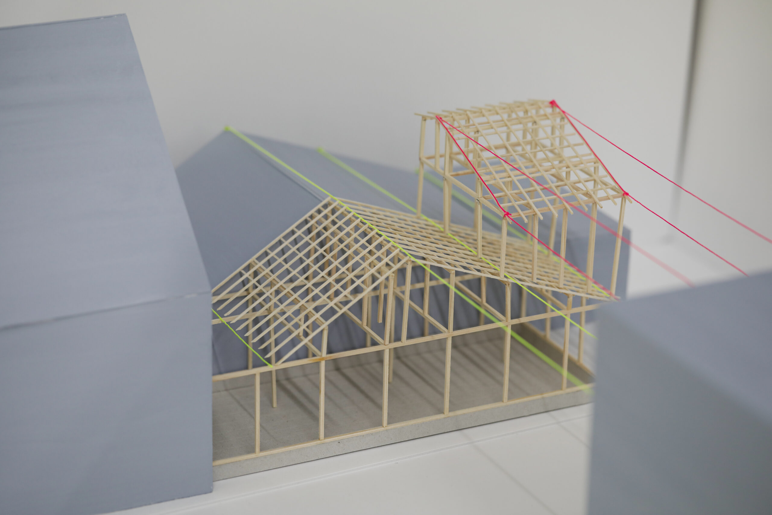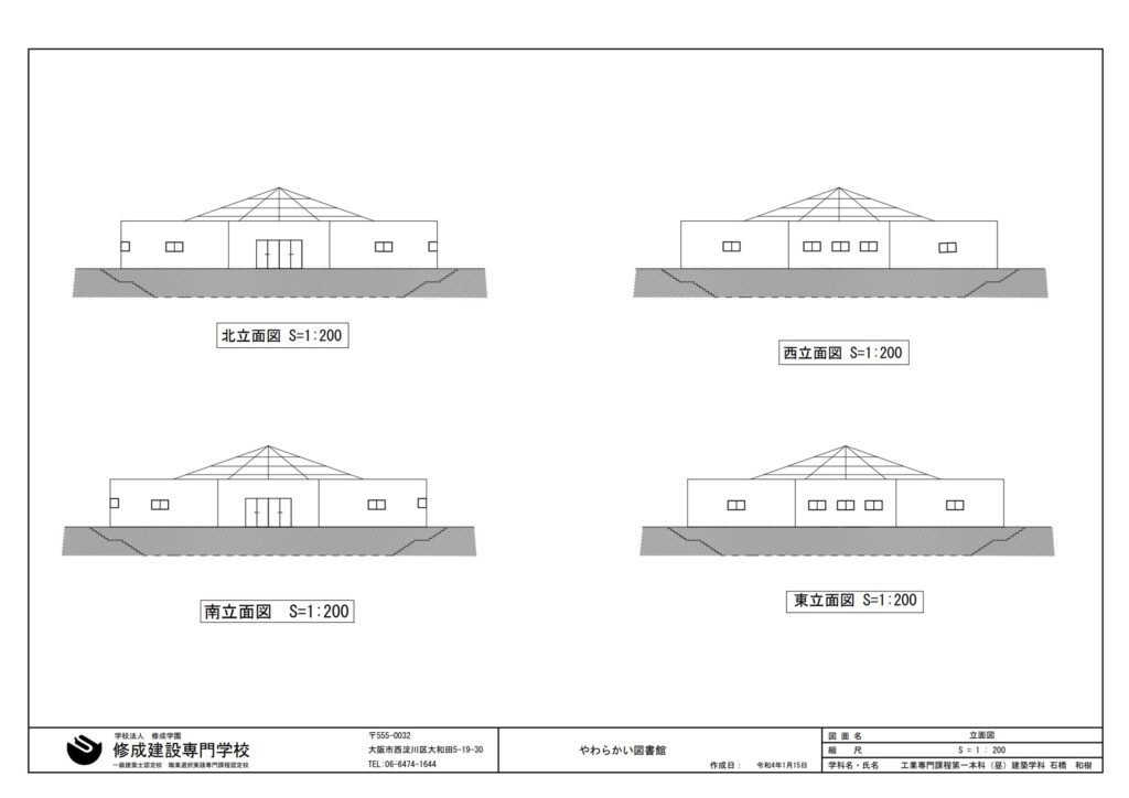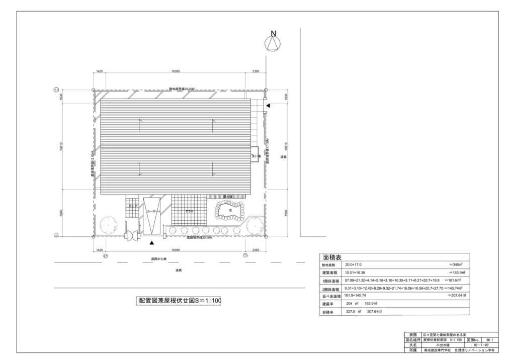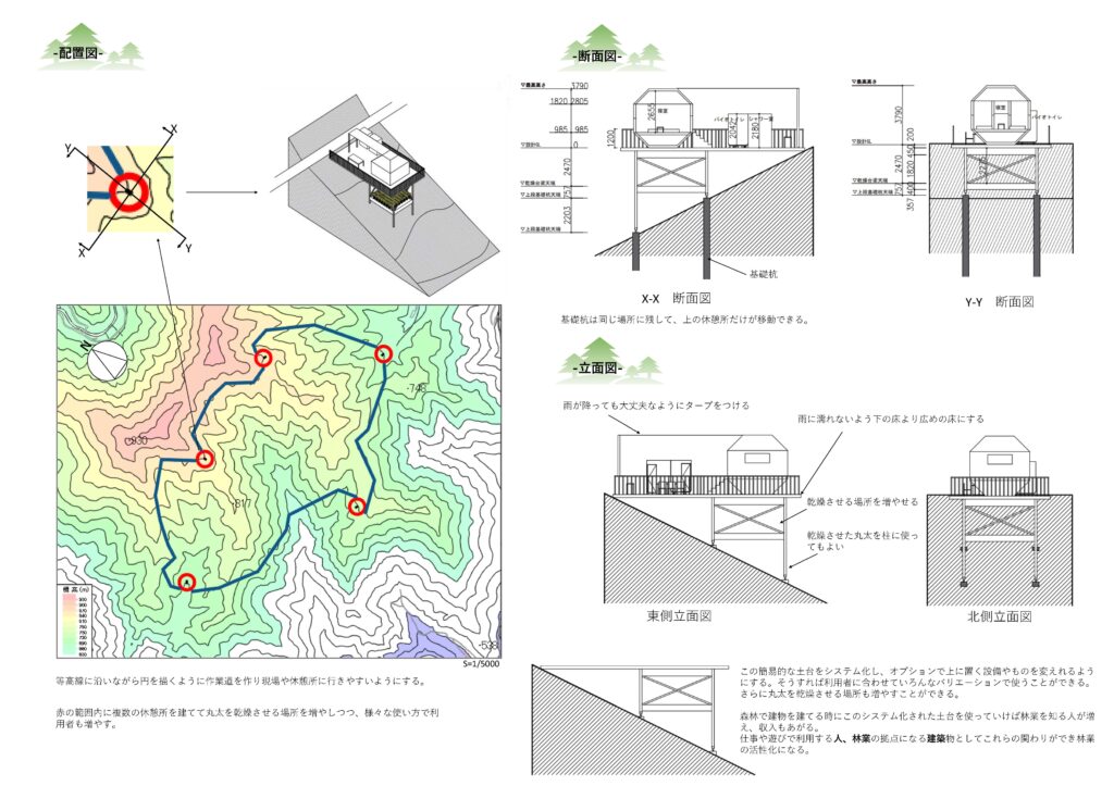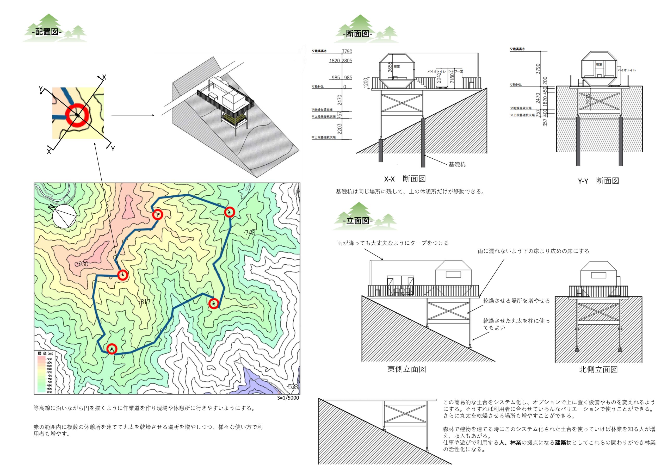 打合せ当初から彼は自分を素直に表現しておりました。先ず敷地調査から考えを実施し、彼なりの建築への考えが素直に表れた作品となった。計画の建物については計画予定地に沿ったイメージを用いて動線を始め本人の想いが詰まった計画となったと思います。図面もさることながら、構造等を理解していき、必要な形状と部材等も図面及び期間もきちんと厳守し完成させた作品です。私はこの作品を通して彼の学校生活を含めた人間模様があらわれていると思います。 <山本 順也>