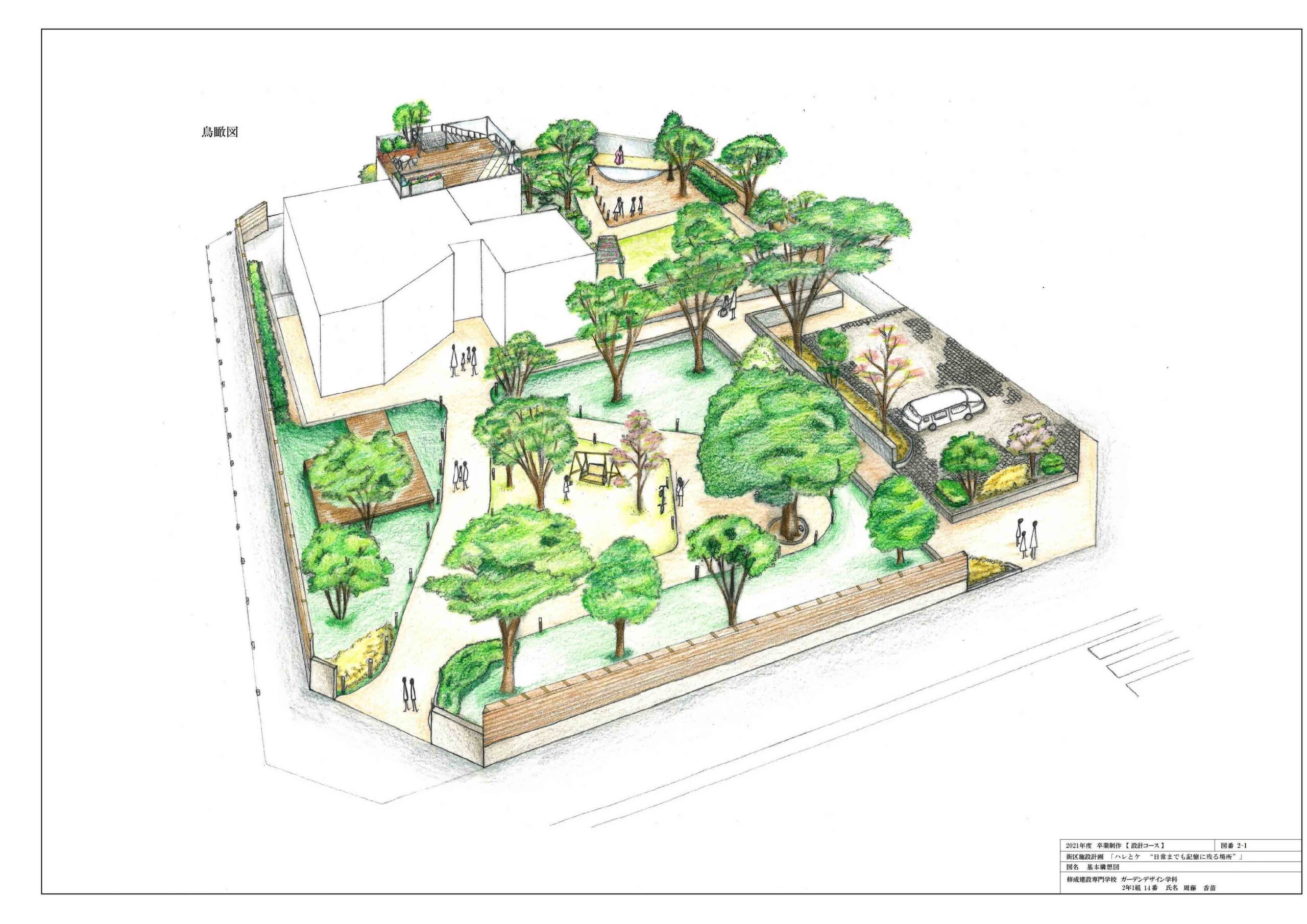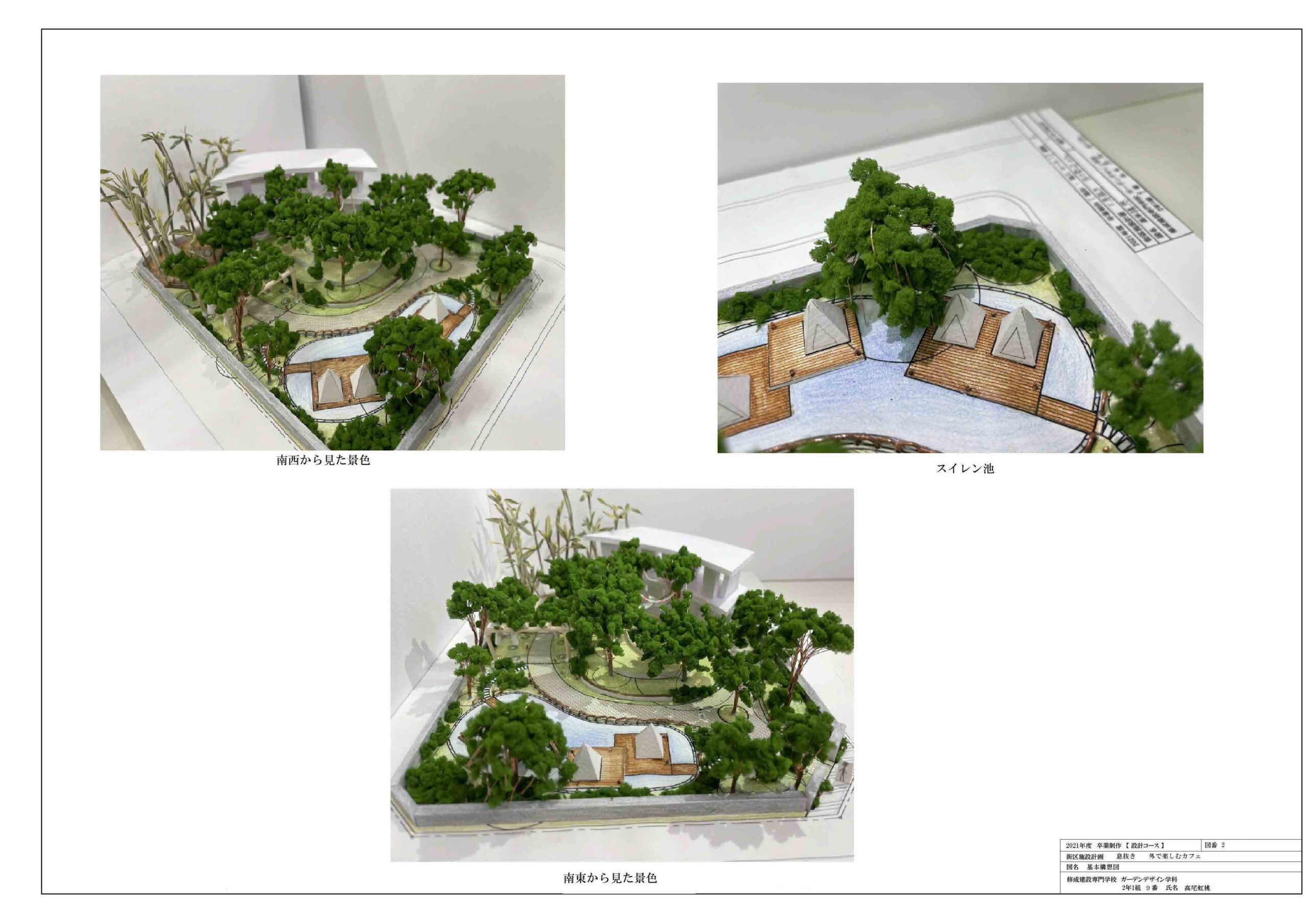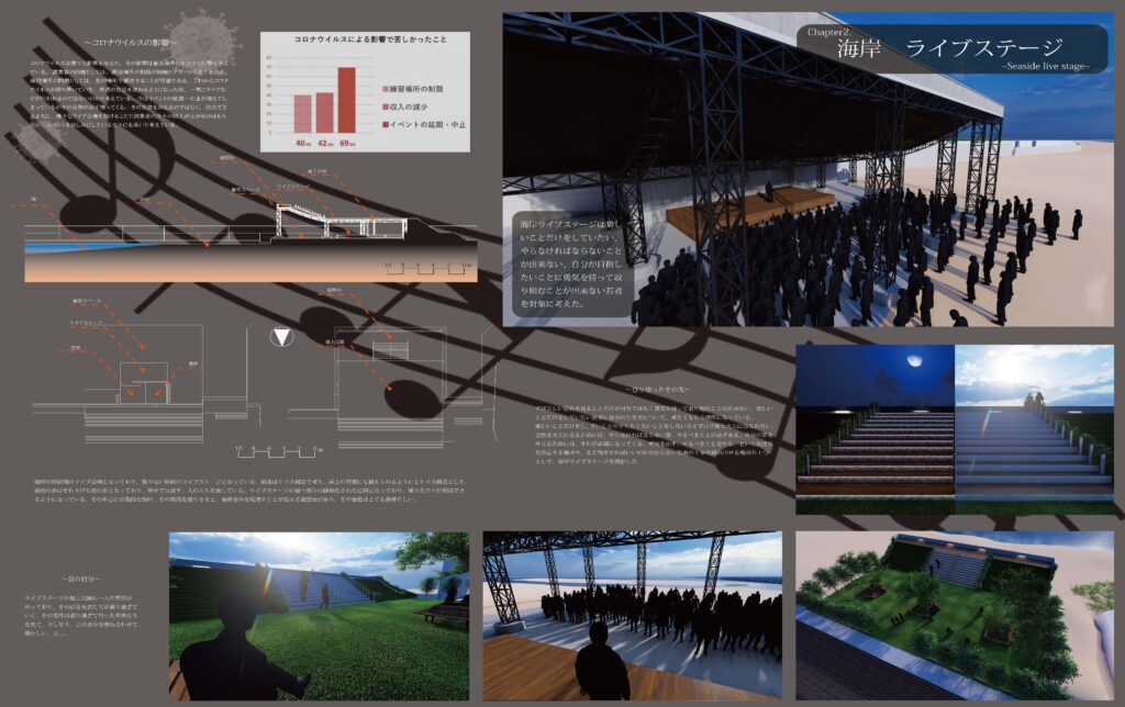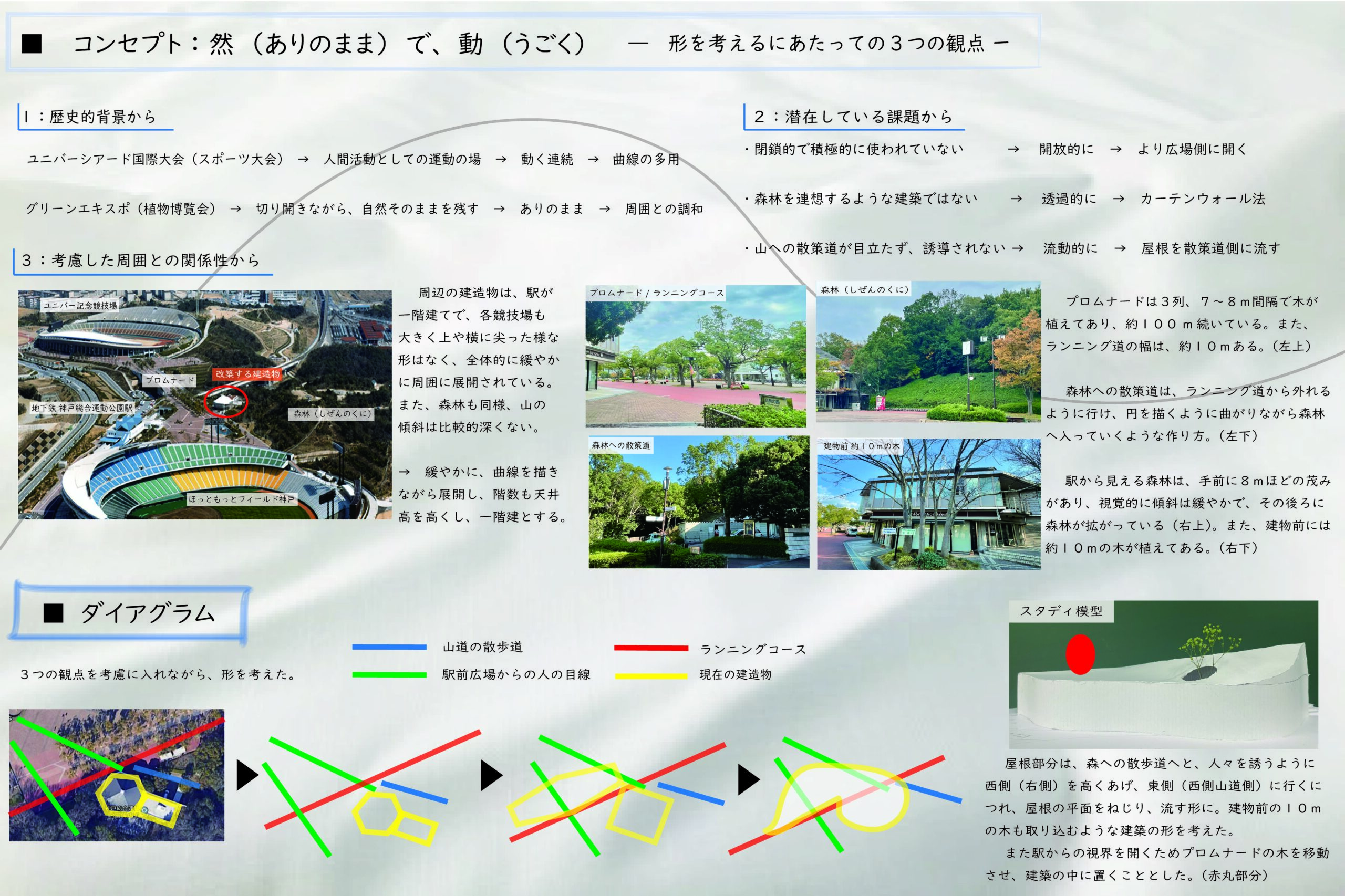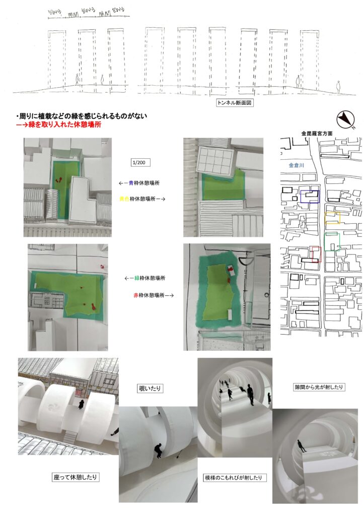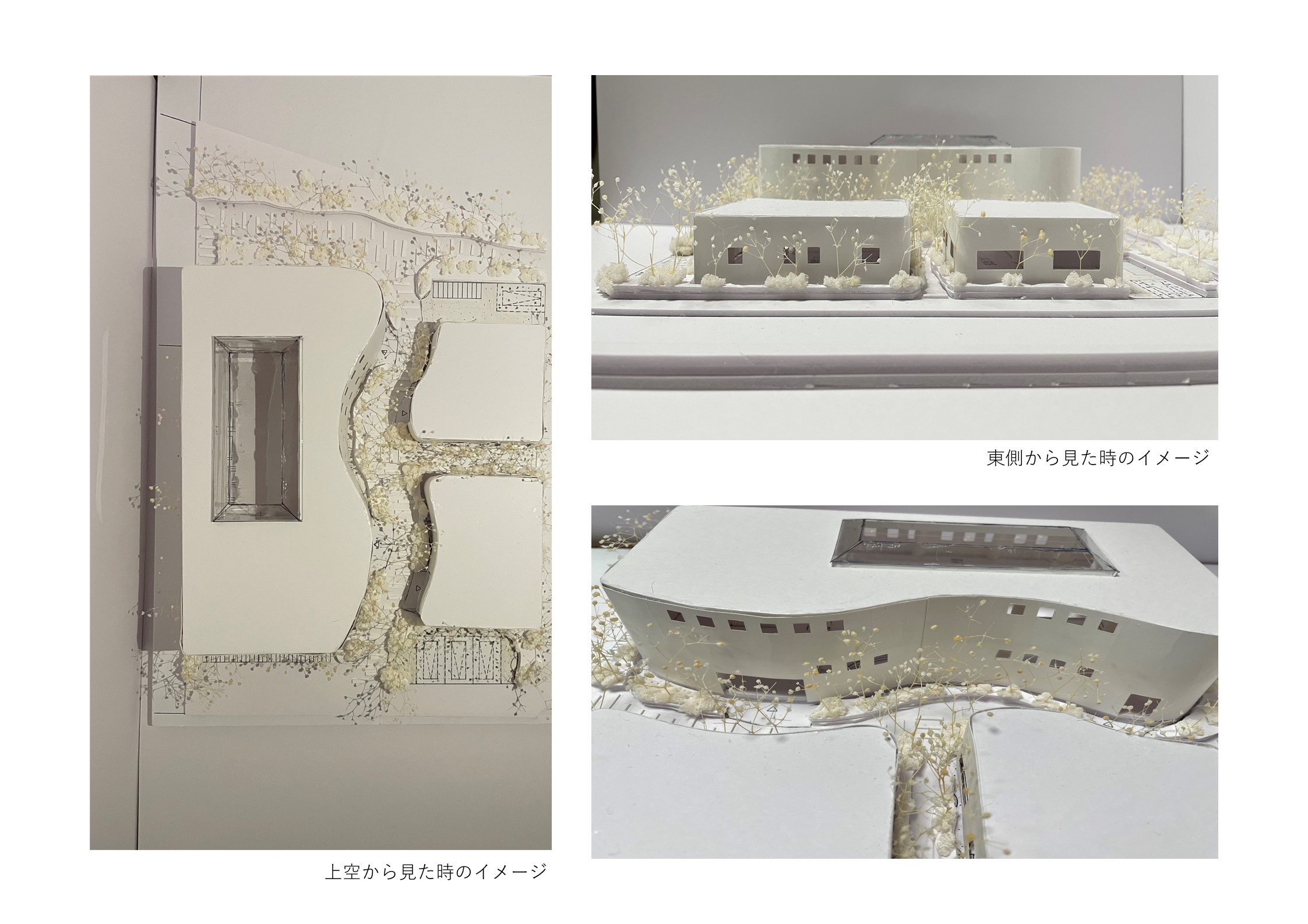 アフターコロナの建築デザインは「箱からの脱失」で、ランドスケープデザインが重要視される。基本設計コースには珍しく、模型製作まで挑戦した表現提起は秀逸である。<青砥 聖逸>