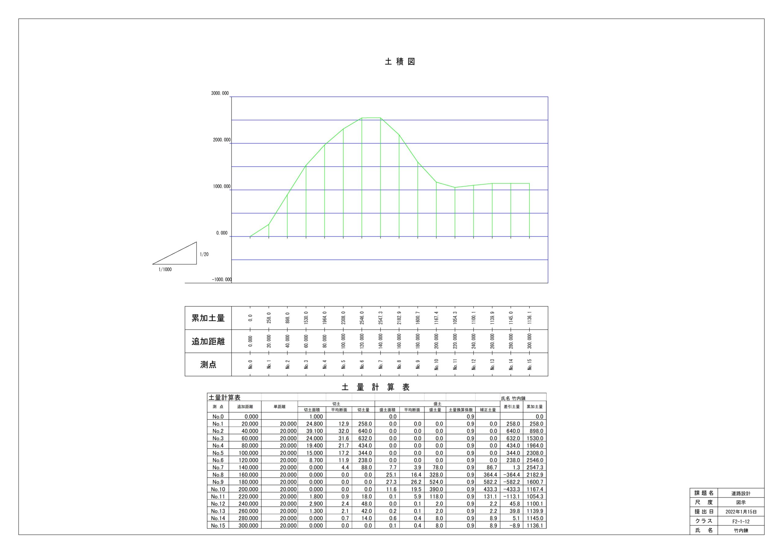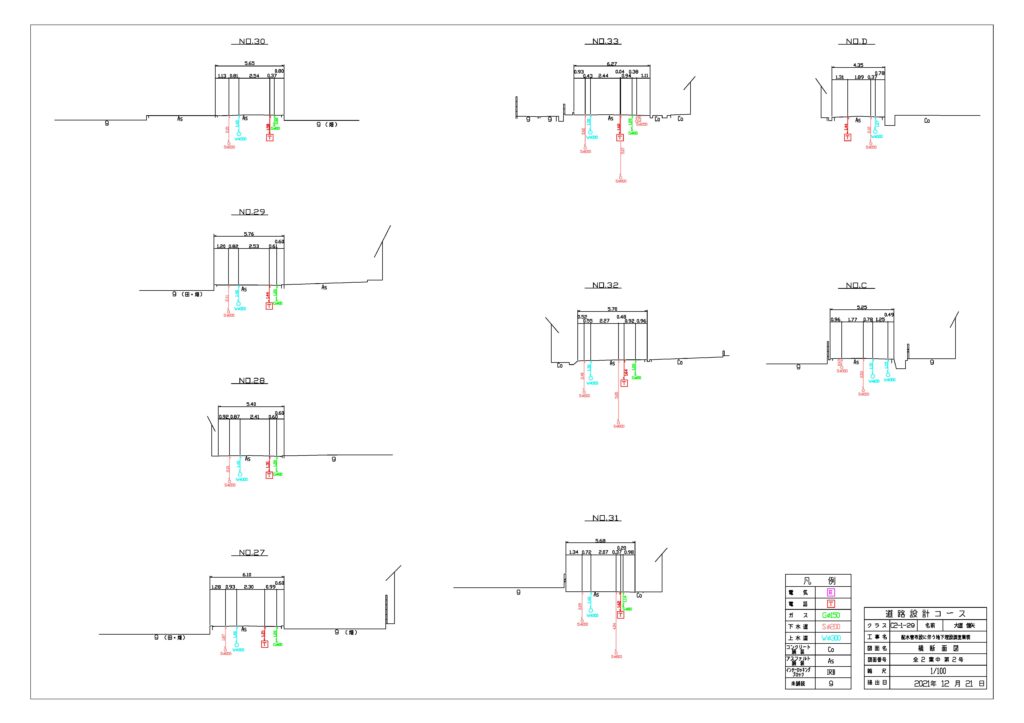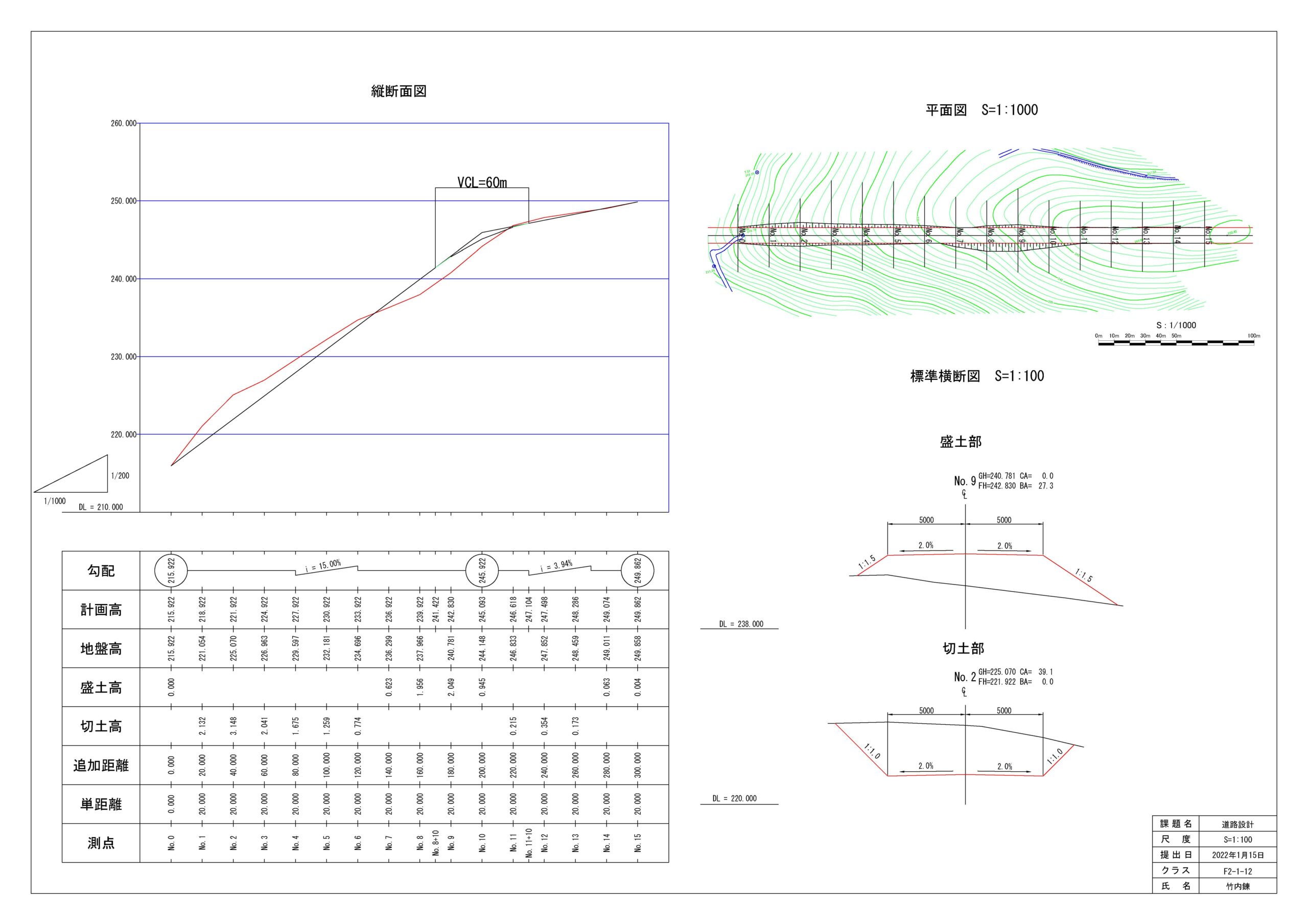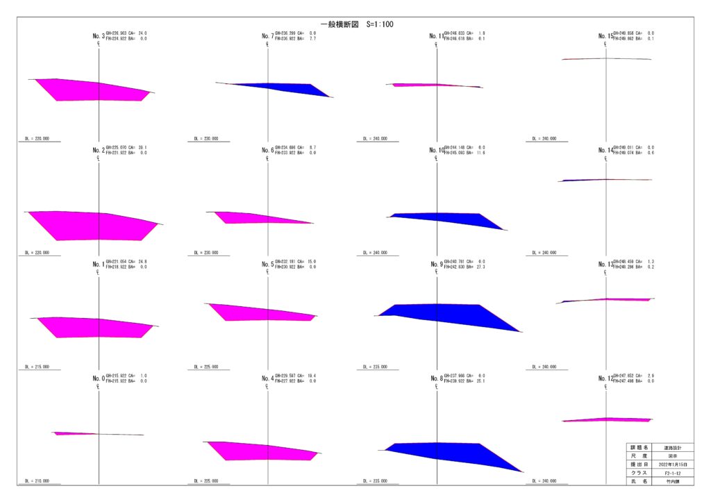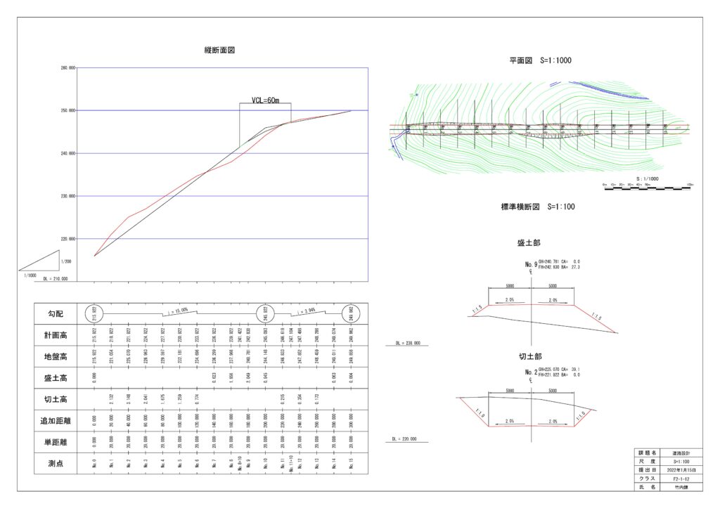道路設計コースの道路路線設計は、入学してから学んだCAD製図、測量学、施工学などの知識を基に、地形図をもとにペーパーロケーションで等高線を読みながら、縦横断測量から土量計算までの一連の流れを実施している。この設計はこれまでの学習成果である知識を活用し、直線の道路ではあるがAuto CADやエクセルの計算機能を活用し道路を計画し図面にまとめている。 <野瀬 孝男>