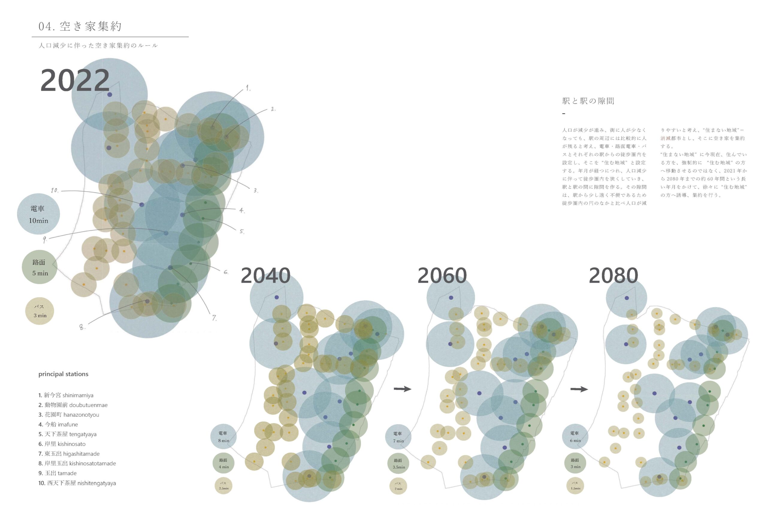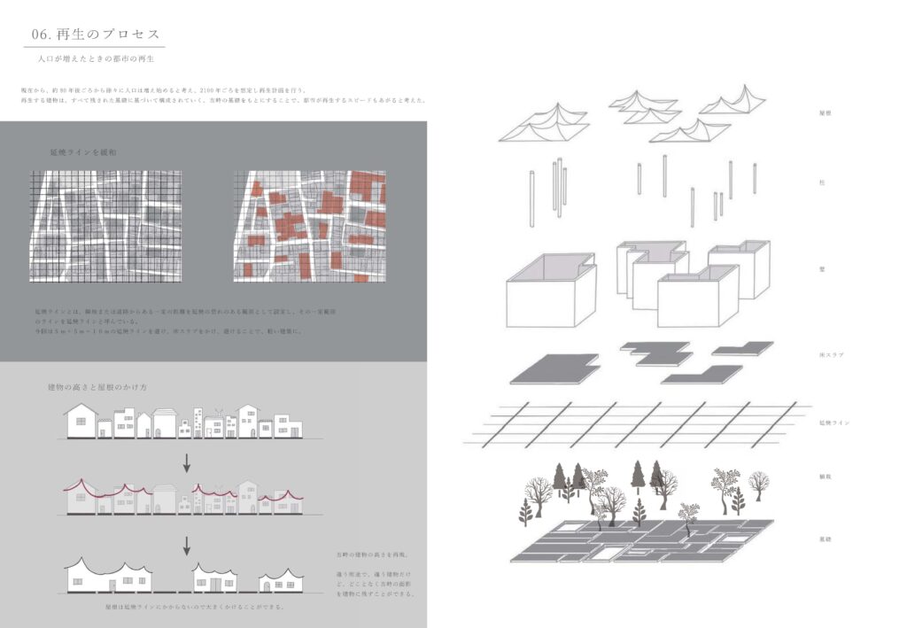 日本には消滅可能性都市が存在します。自分の暮らす街が消滅してしまうかもしれないというあまりに非現実的で、おぞましいことが 数年後には起こりうる世界で 私たちは生きています。ですが、消滅都市を 一度受け入れ、あえて消滅を行うことで 再生の取っ掛かりになるのではないかと考え計画しました。自分自身で課題を見つけ設計に落とし込むのは 難しく、苦戦する日々でしたが、 担当の先生のご指導もあり 自分なりの答えを表現することができたと思います。