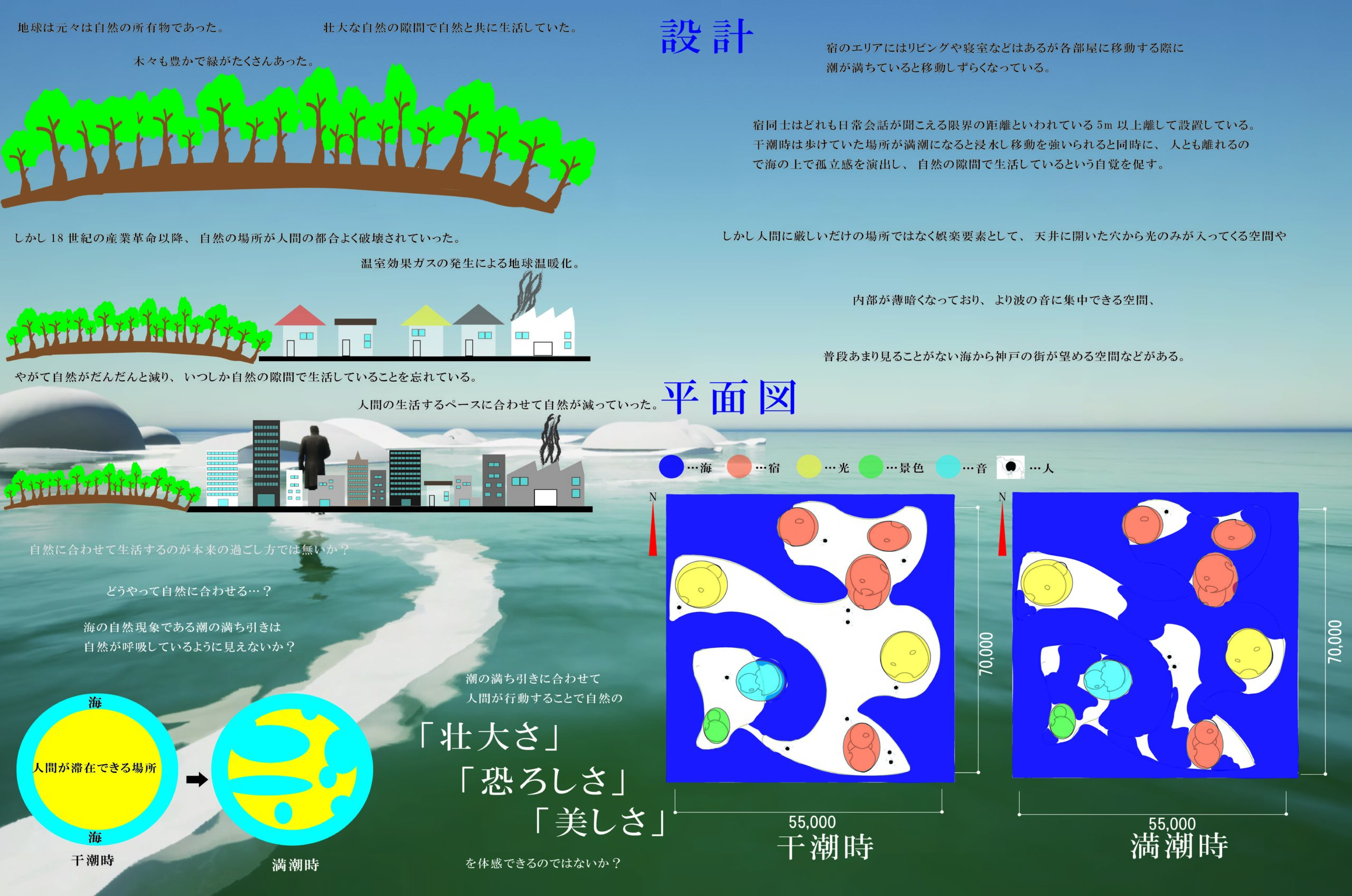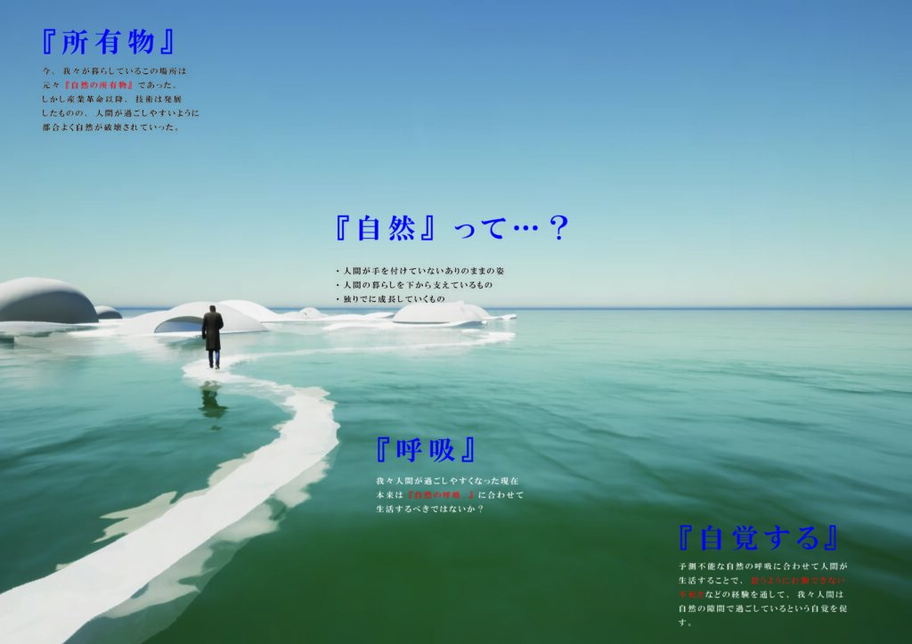 今回の卒業設計を通して人間はどうやって自然と生きていくべきなのか、本来はこうあるべきではないのかということに重きを置き考えていきました。