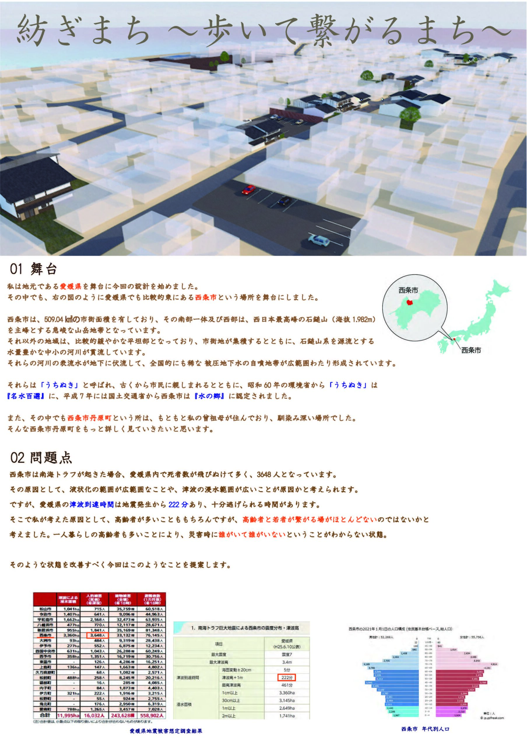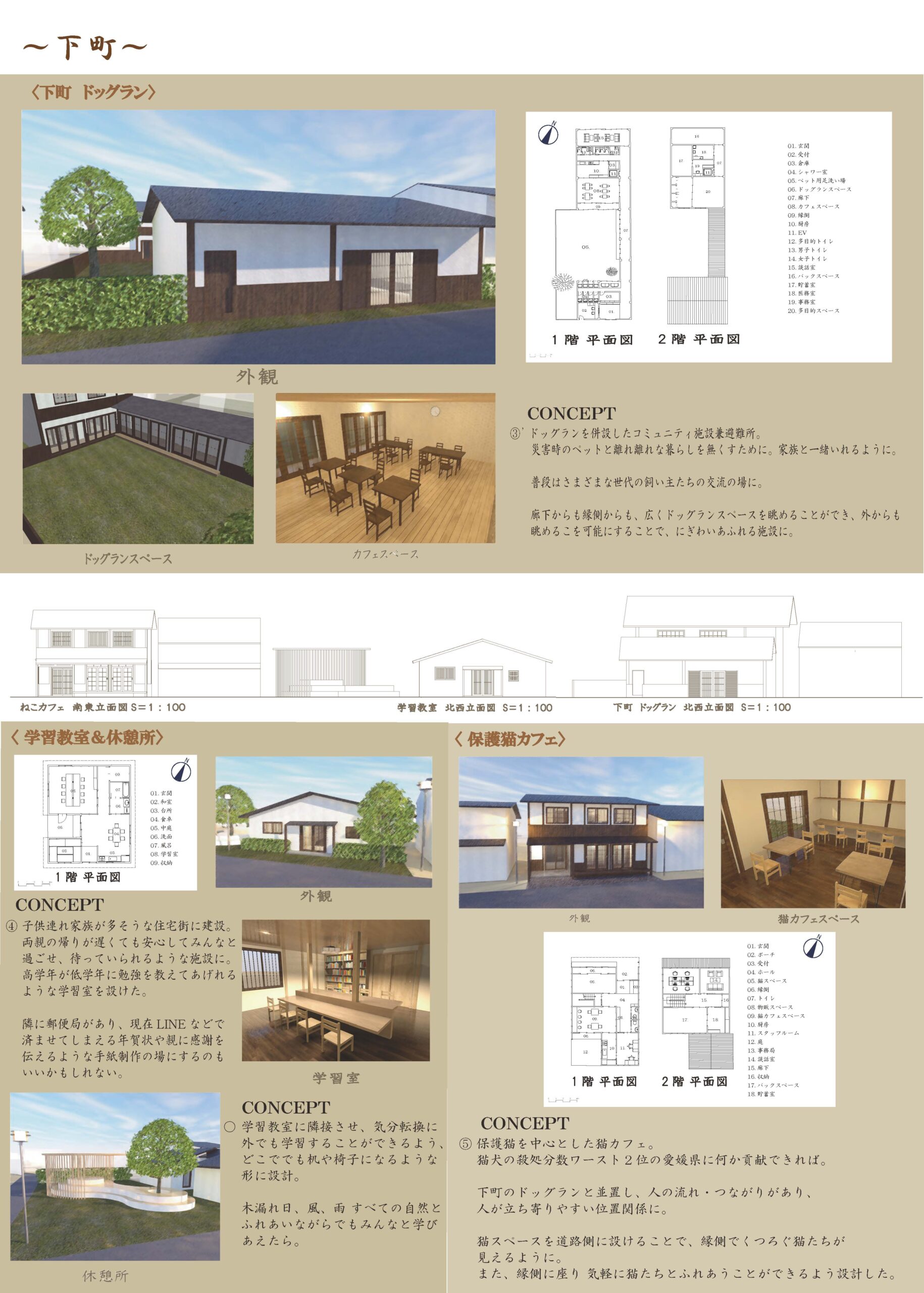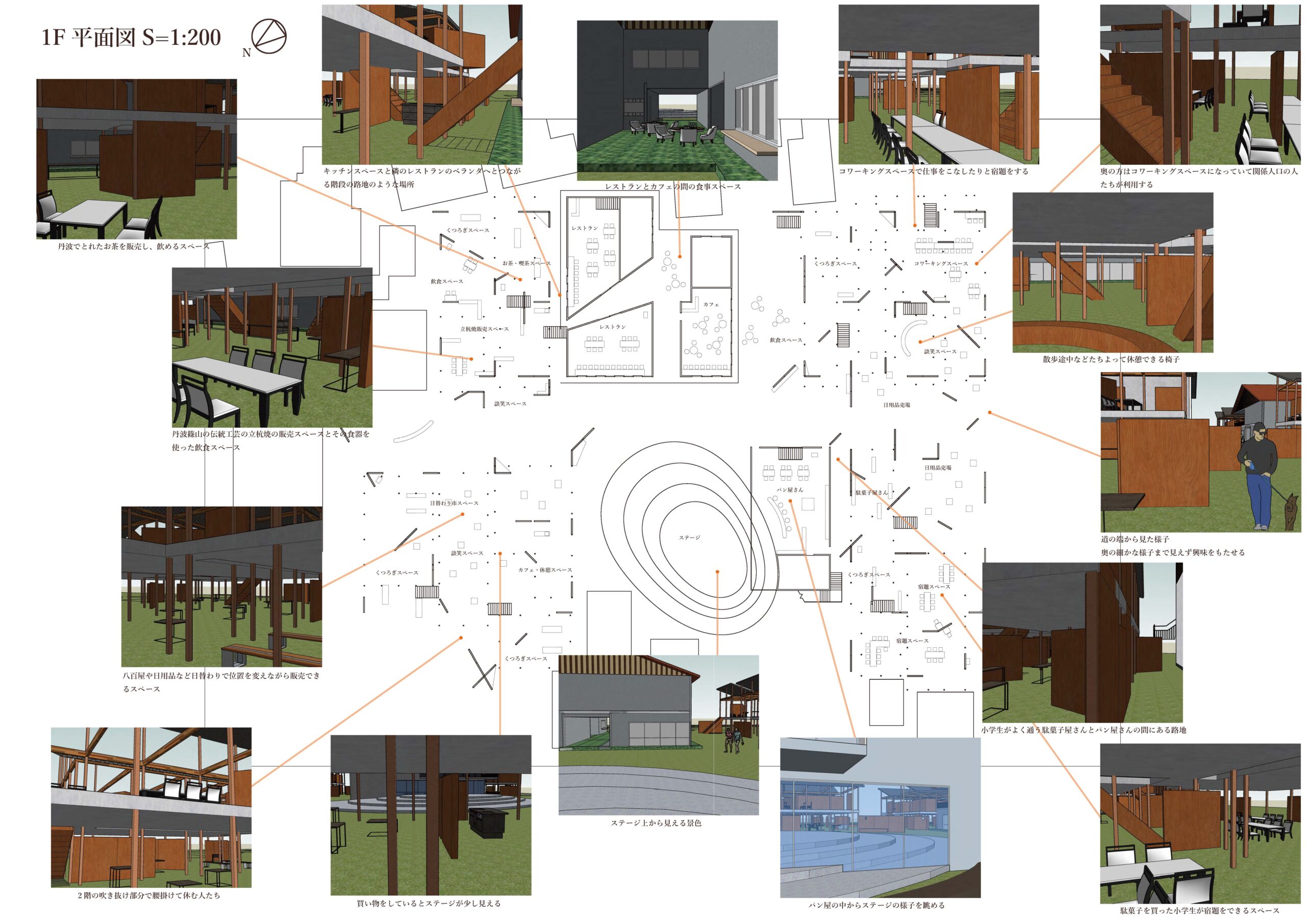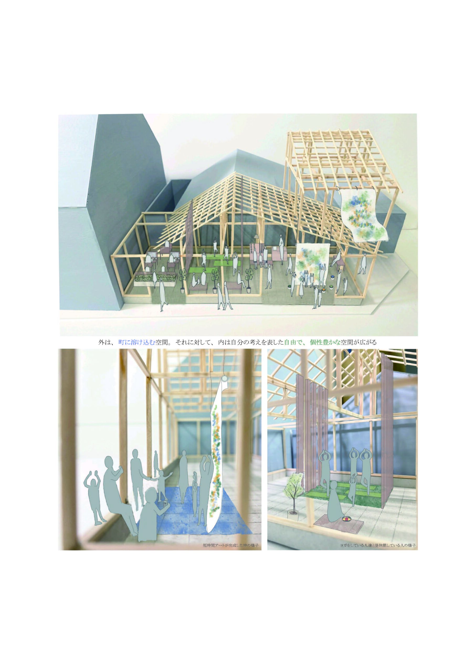これからの時代にどのような方法が活性化につながるか様々な角度から検討してくれました。試行錯誤の中うまく進まないこともありましたが、最後まで減速せずにやりきってくれました。この卒業設計の試行錯誤がこれからの設計につながっていくと思います <吉田 秀栄>