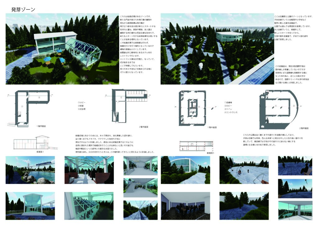 子育て世代の移住が目覚しい西淀川区内の計画地に、子供たちをターゲットとした学びの場を提案。コロナ禍でも人気の高い屋外キャンプやグランピングの要素を取り入れ、ソーシャルディスタンスを保ちながら、緑の中で安心・安全に、そして静かにゆったりと勉強や読書が楽しめる庭園空間は、立地条件や周辺環境をしっかりと把握しているものであり、多くのニーズに上手く答えるものとして、西淀川区の新しいスポットになるに違いない。 <明石 祥子>