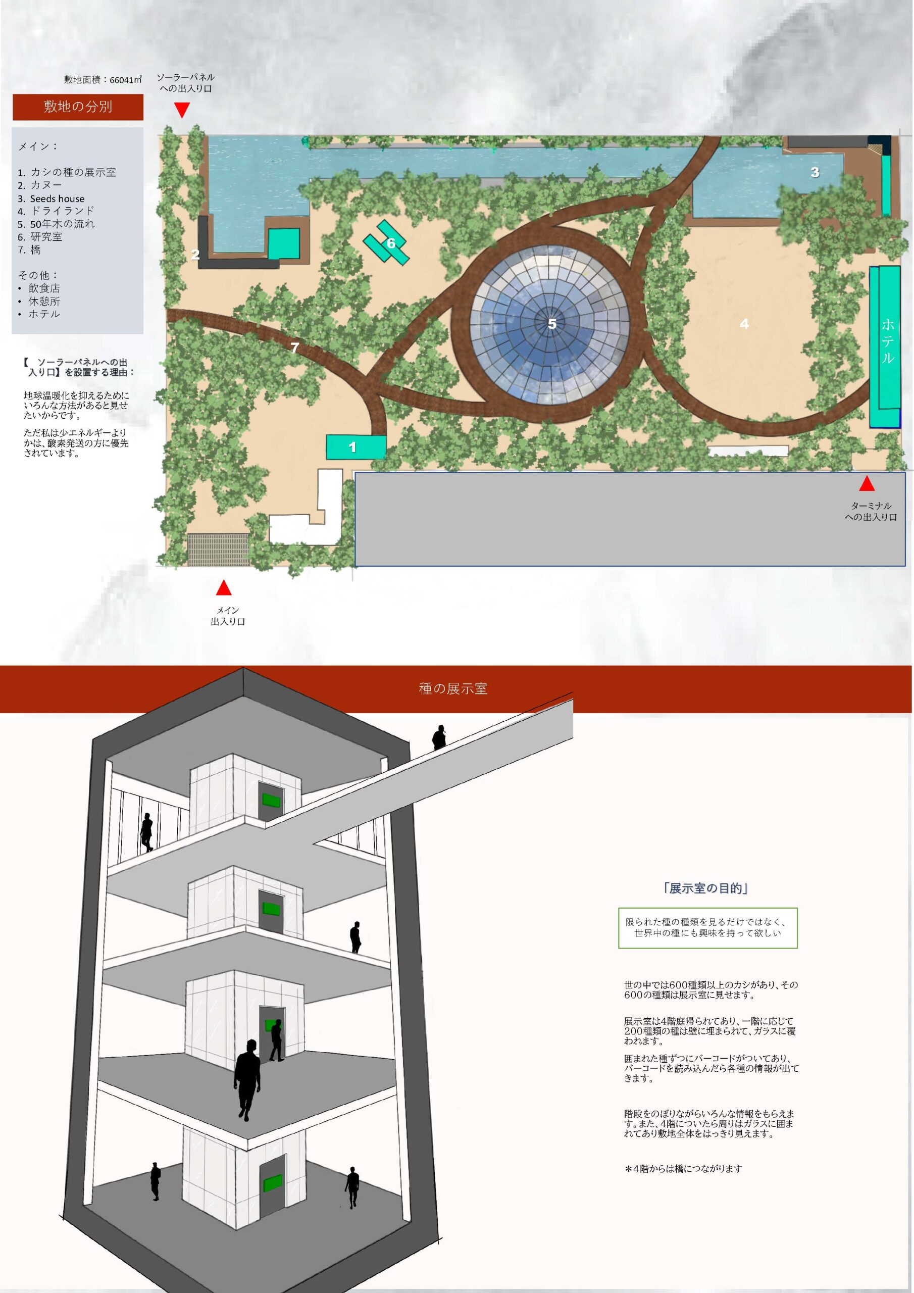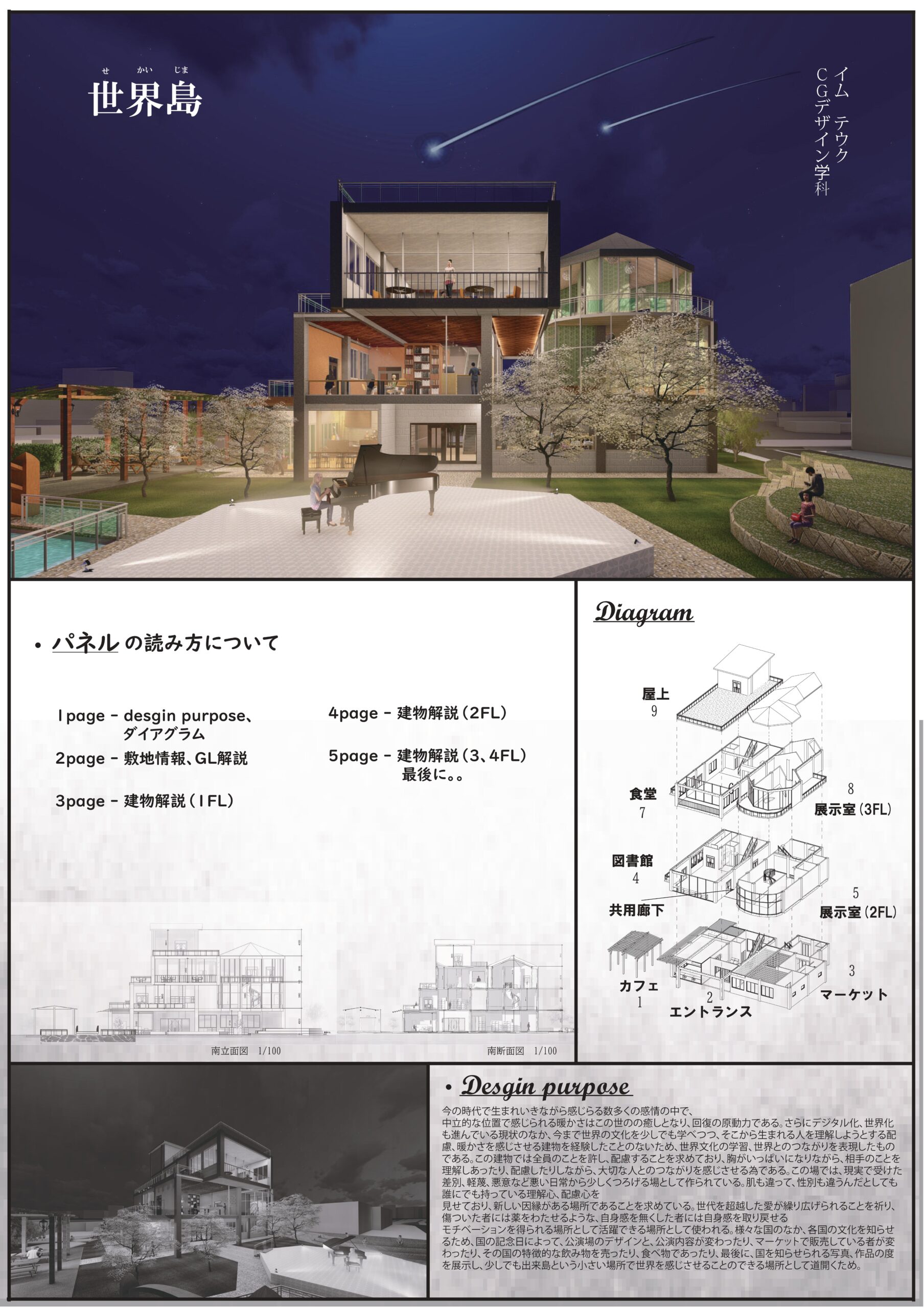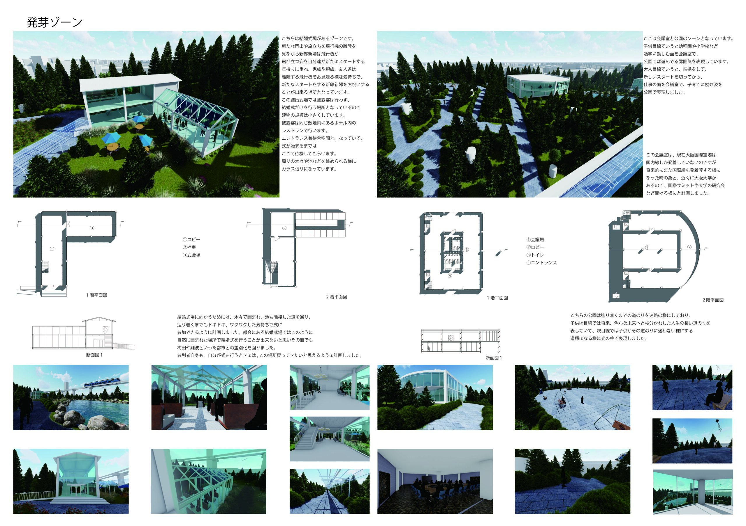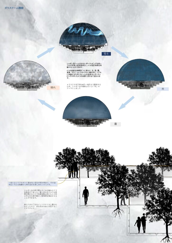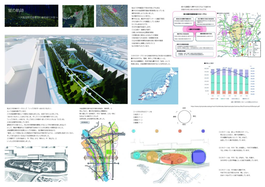2025年大阪万博を契機に来場する世界の人々に改めて環境問題に目を向けて欲しいという想いで提案された作品。広大な敷地設定の中に地球環境の変化を時系列に見て取れる施設計画がなされています。現実と未来を同時に見つめながら深刻な地球環境を受け止める事が出来、誰もが出来る植樹という行為により、種を世界中に広げ100年先の環境を豊かにする構想が描かれています。インドネシア出身の彼女が見る未来の地球環境に対し、学ぶ・知る・生かす事がテーマとなった計画です。1本の木が貢献できる環境改善は微々たるものですが、世界規模での広がりが及ぼす影響は計り知れず、複雑さを取り払いシンプルな行為による長期的視点が温かみを感じさせてくれる作品となりました。 <阪本 剛史>