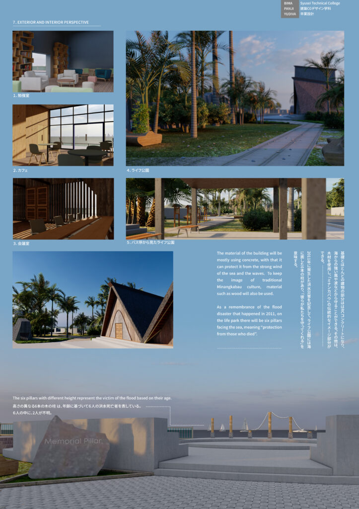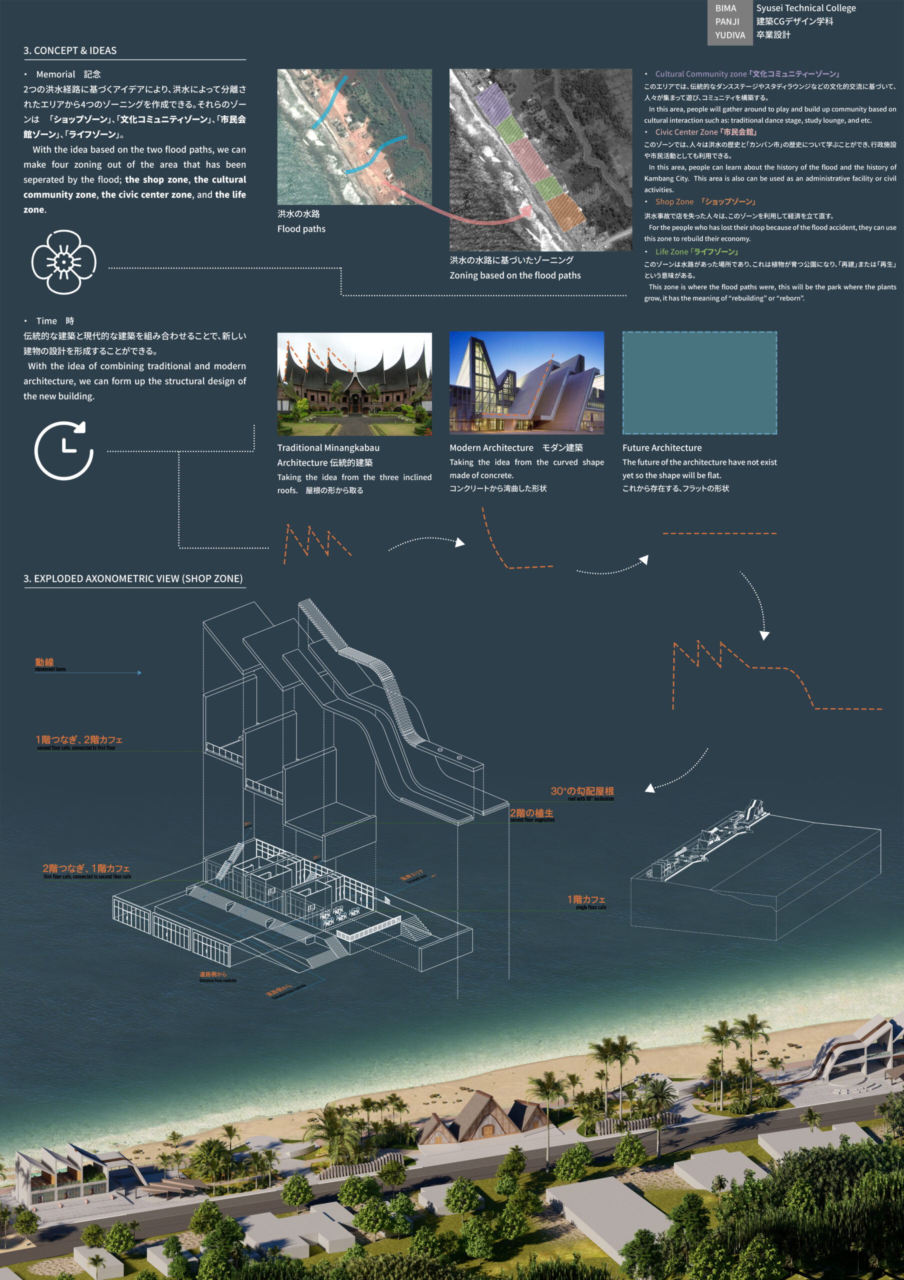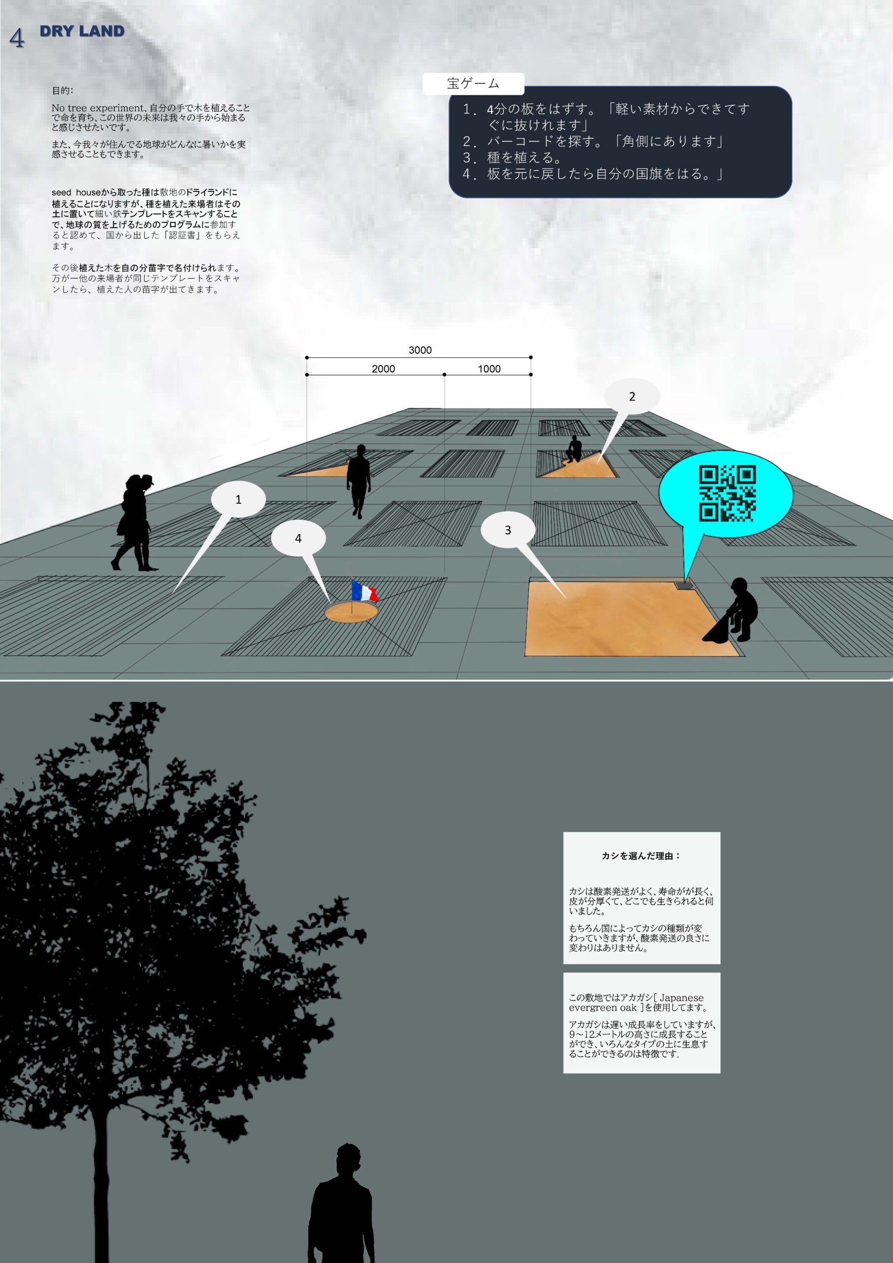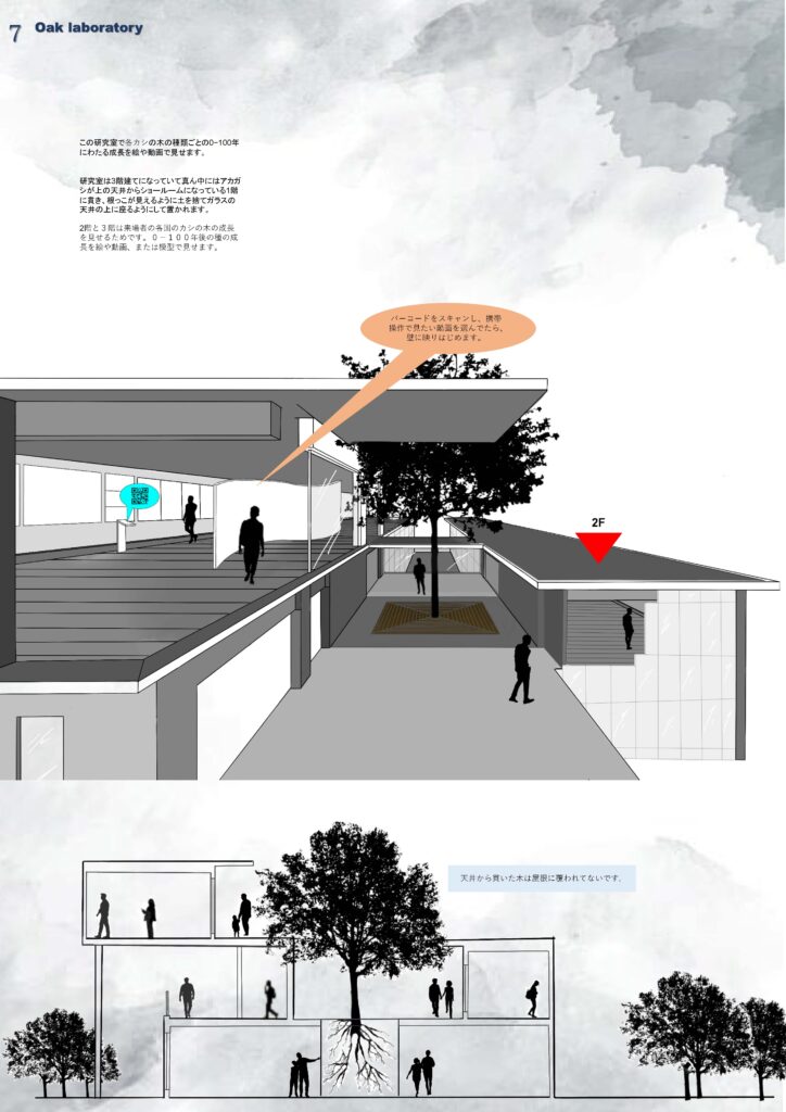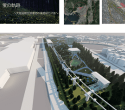 2025年大阪万博を契機に来場する世界の人々に改めて環境問題に目を向けて欲しいという想いで提案された作品。広大な敷地設定の中に地球環境の変化を時系列に見て取れる施設計画がなされています。現実と未来を同時に見つめながら深刻な地球環境を受け止める事が出来、誰もが出来る植樹という行為により、種を世界中に広げ100年先の環境を豊かにする構想が描かれています。インドネシア出身の彼女が見る未来の地球環境に対し、学ぶ・知る・生かす事がテーマとなった計画です。1本の木が貢献できる環境改善は微々たるものですが、世界規模での広がりが及ぼす影響は計り知れず、複雑さを取り払いシンプルな行為による長期的視点が温かみを感じさせてくれる作品となりました。 <阪本 剛史>