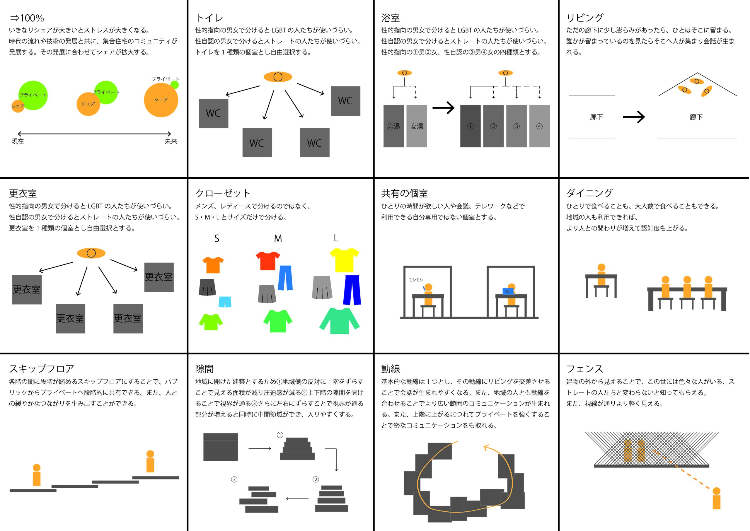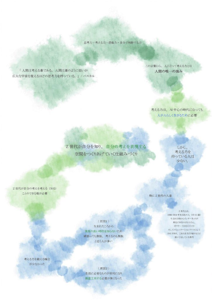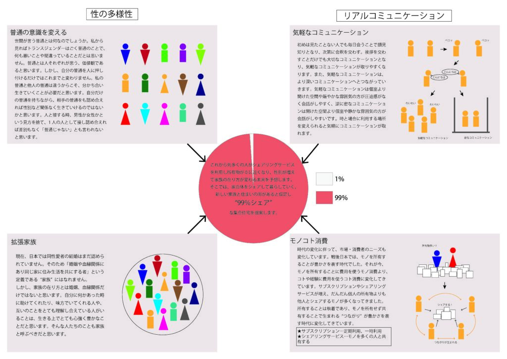 「多様性を認める社会」はとても素晴らしいことですが、人の心の器は小さい人も少なくありません。人の違いを押し付けることなく理解しあえる場所はどのようなものかを考えてくれました。哲学的で芯をもつことがかなり難しかったと思います。本人の強い思いがこの難しいテーマを完成まで導いてくれたかと思います。 <吉田 秀栄>