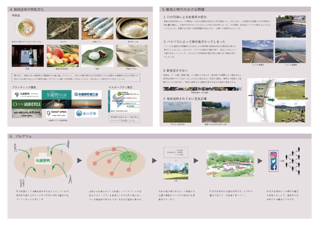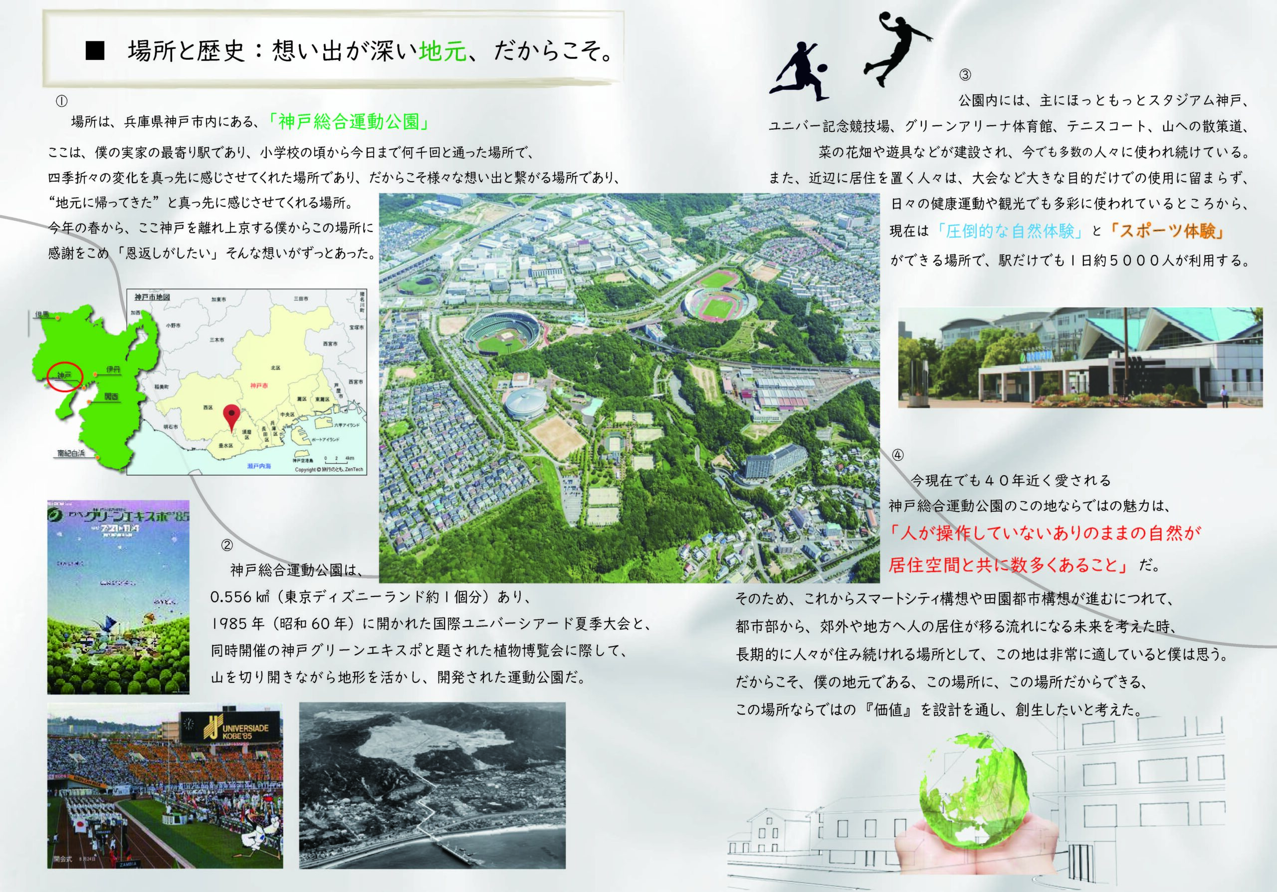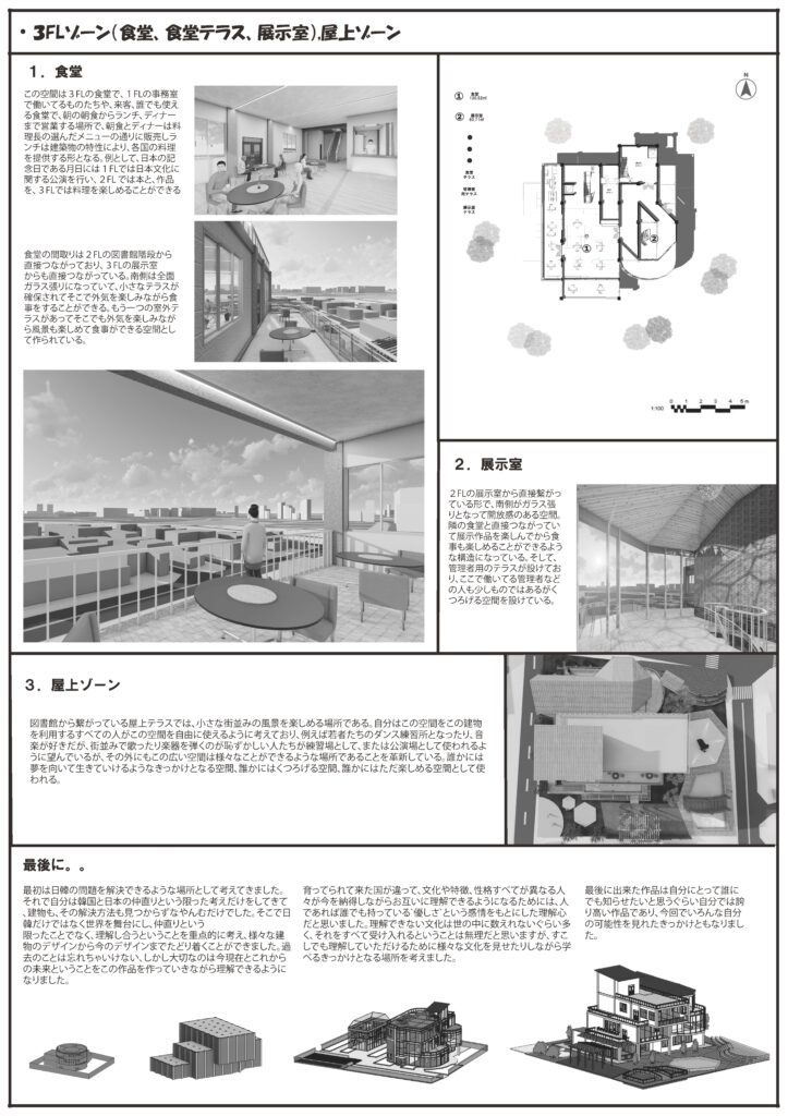 カンボジアと日本の実情を知る留学生ならではの視点で、両国の文化の違い、習慣の違い、意識の違いを感じ取り、解法を提示すると共に、急速に高密度化している都市を緩和させる緑地と共存させるなど、現存する問題の解決に向けて意欲的に取り組む姿勢が見られます。 <福山 亮介>