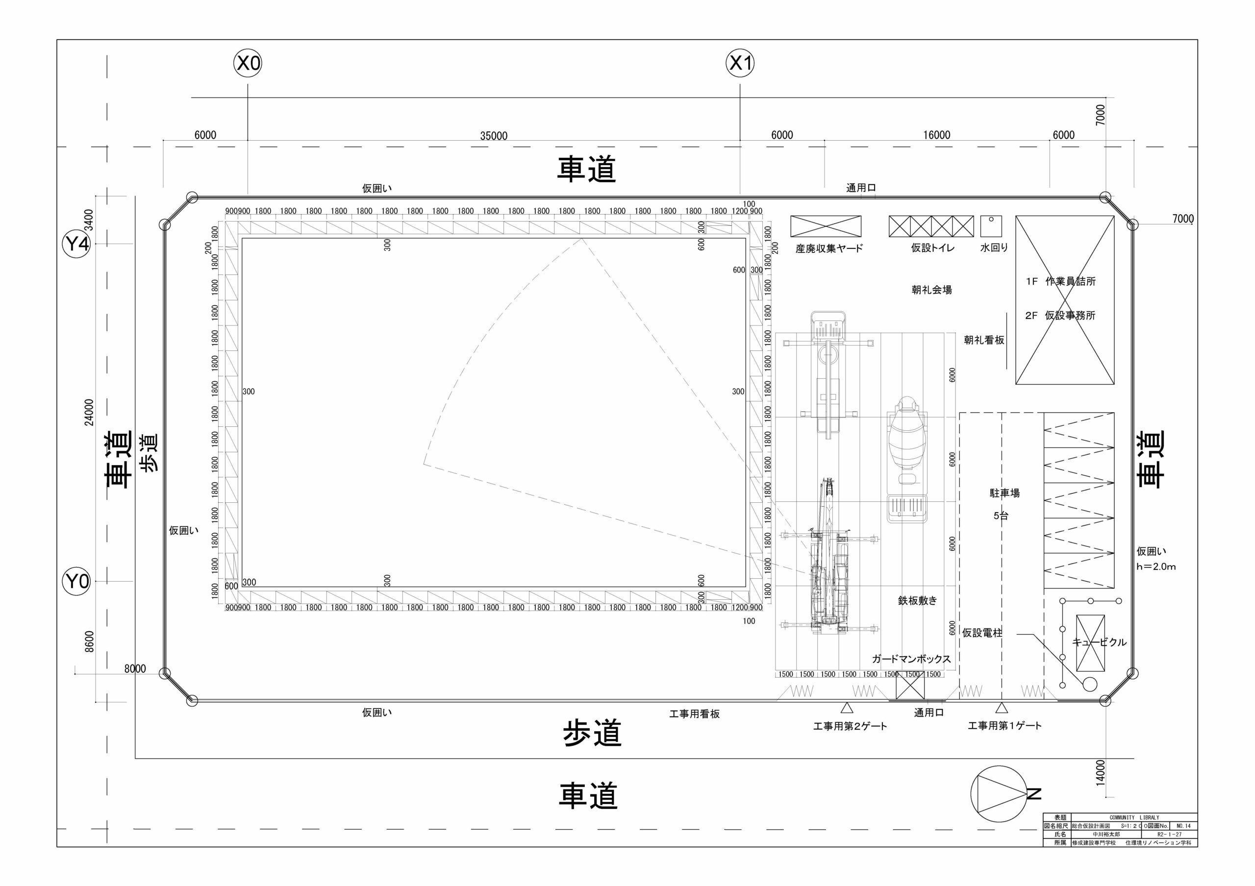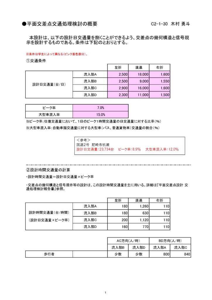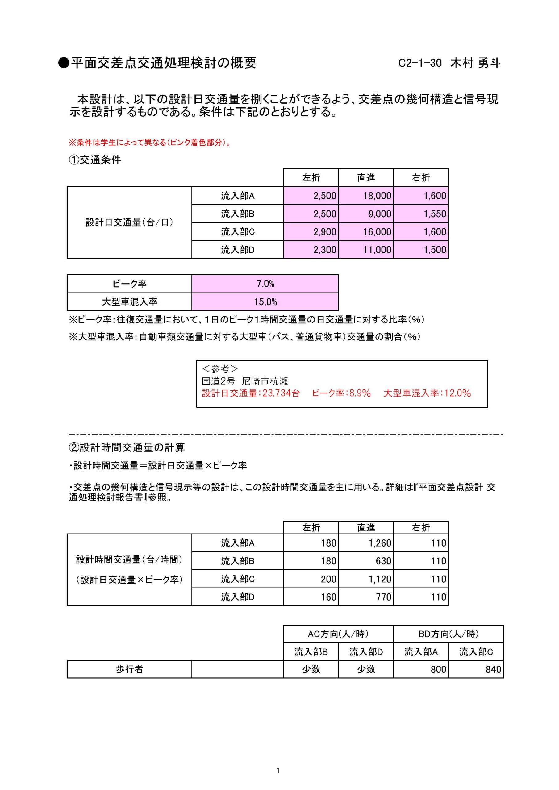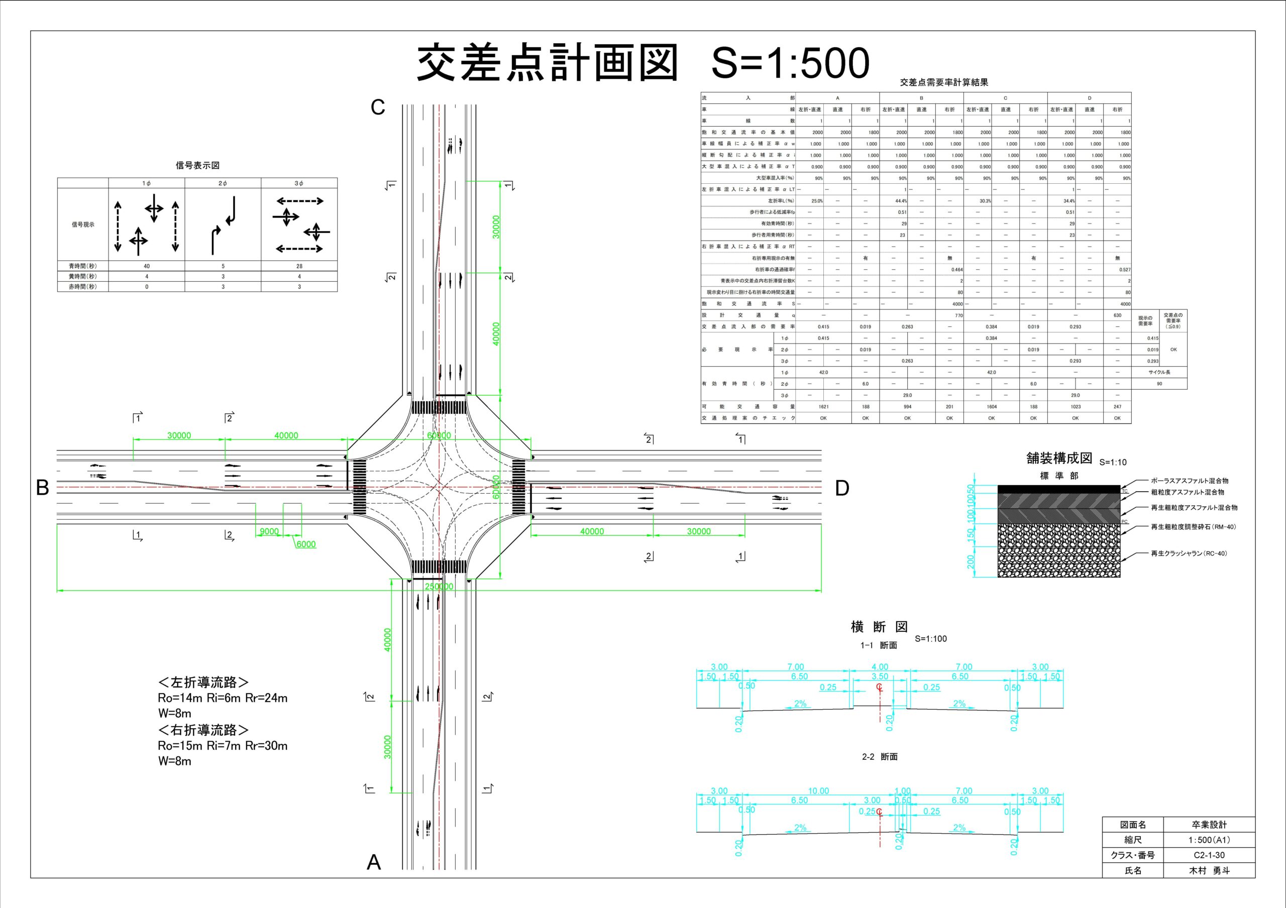 この作品は、ある交通流を想定し、その交通流を捌くことができるような交差点を設計するという、土木のソフト面である「交通工学」をメインとしたものである。信号現示をトライアル計算により調整し、需要率を下げて交通流を捌くことができる交差点が設計されている。一方で、ハード面についても、道路幾何構造は道路構造令に準拠されており、苦労した導流路も正確に描かれている。ハード面とソフト面の両方が考慮された、現実の設計に近い作品であった。 <広瀬 一樹>