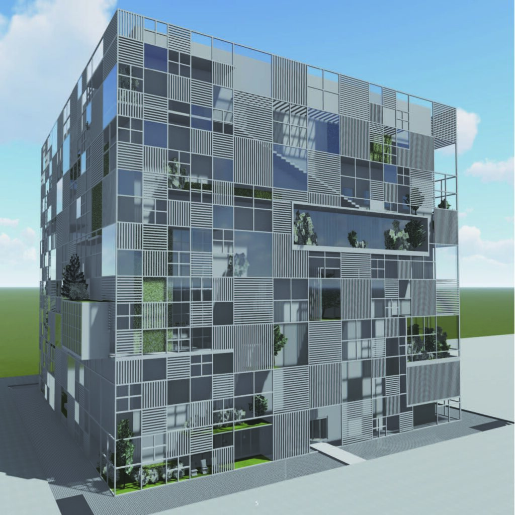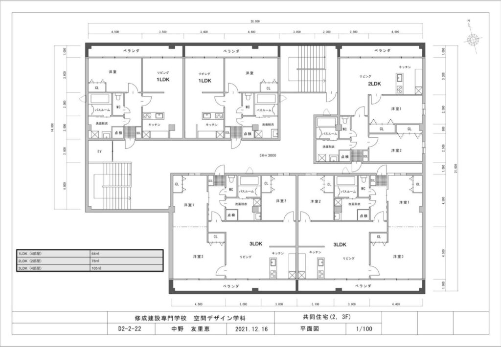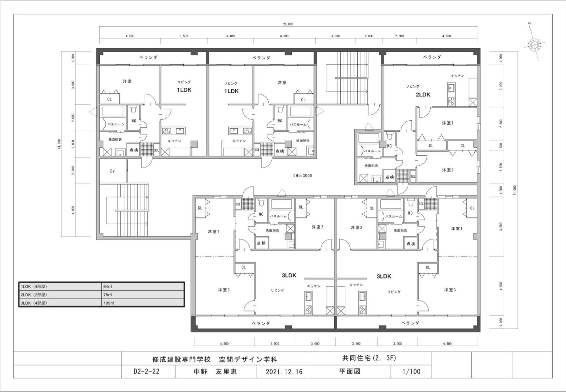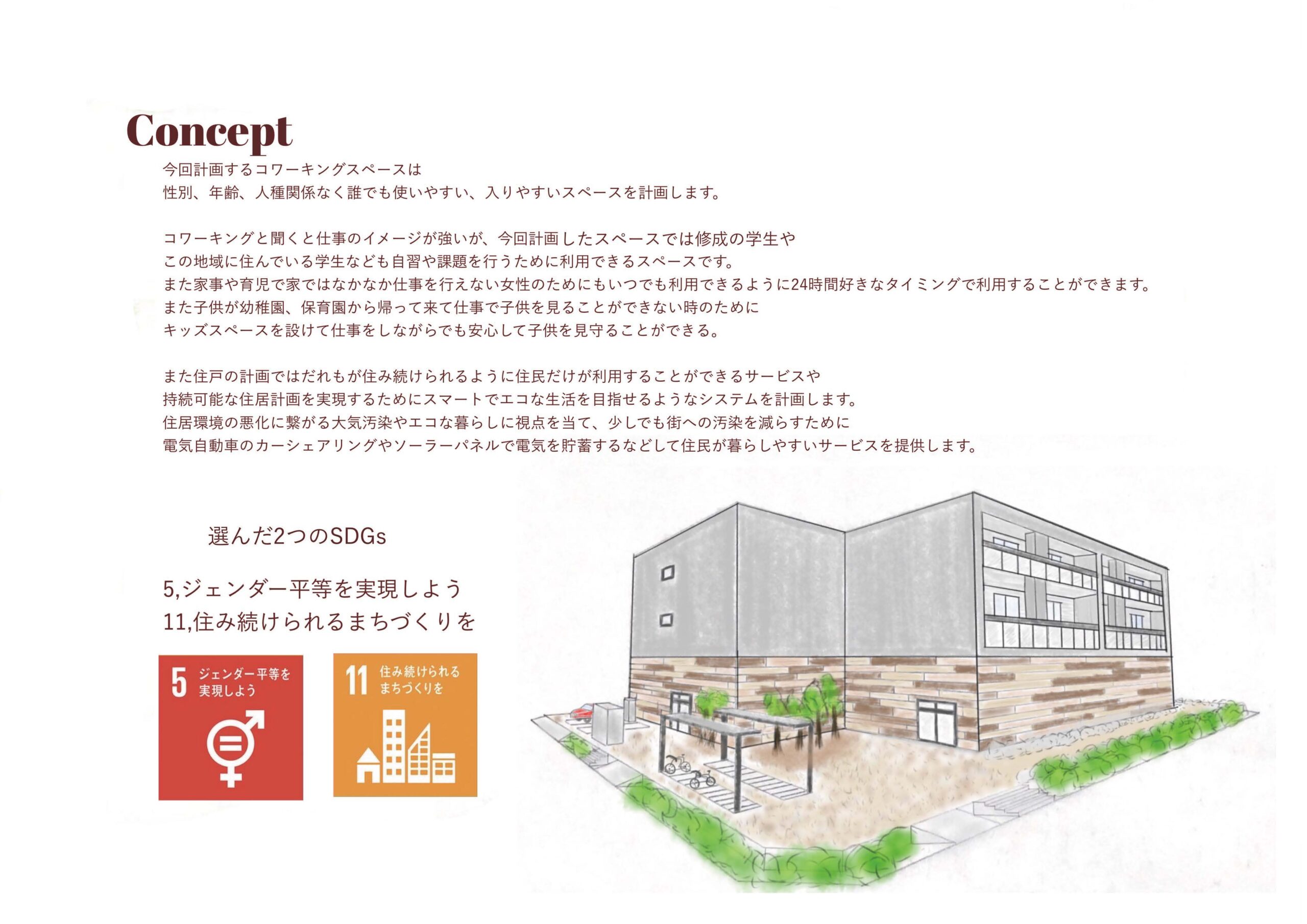 「SDGsの実現に配慮し、多様な住戸タイプとコワーキングスペースを持つ集合住宅」という課題指定での設計案。