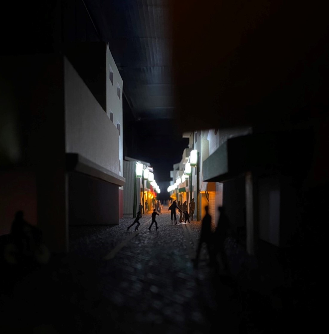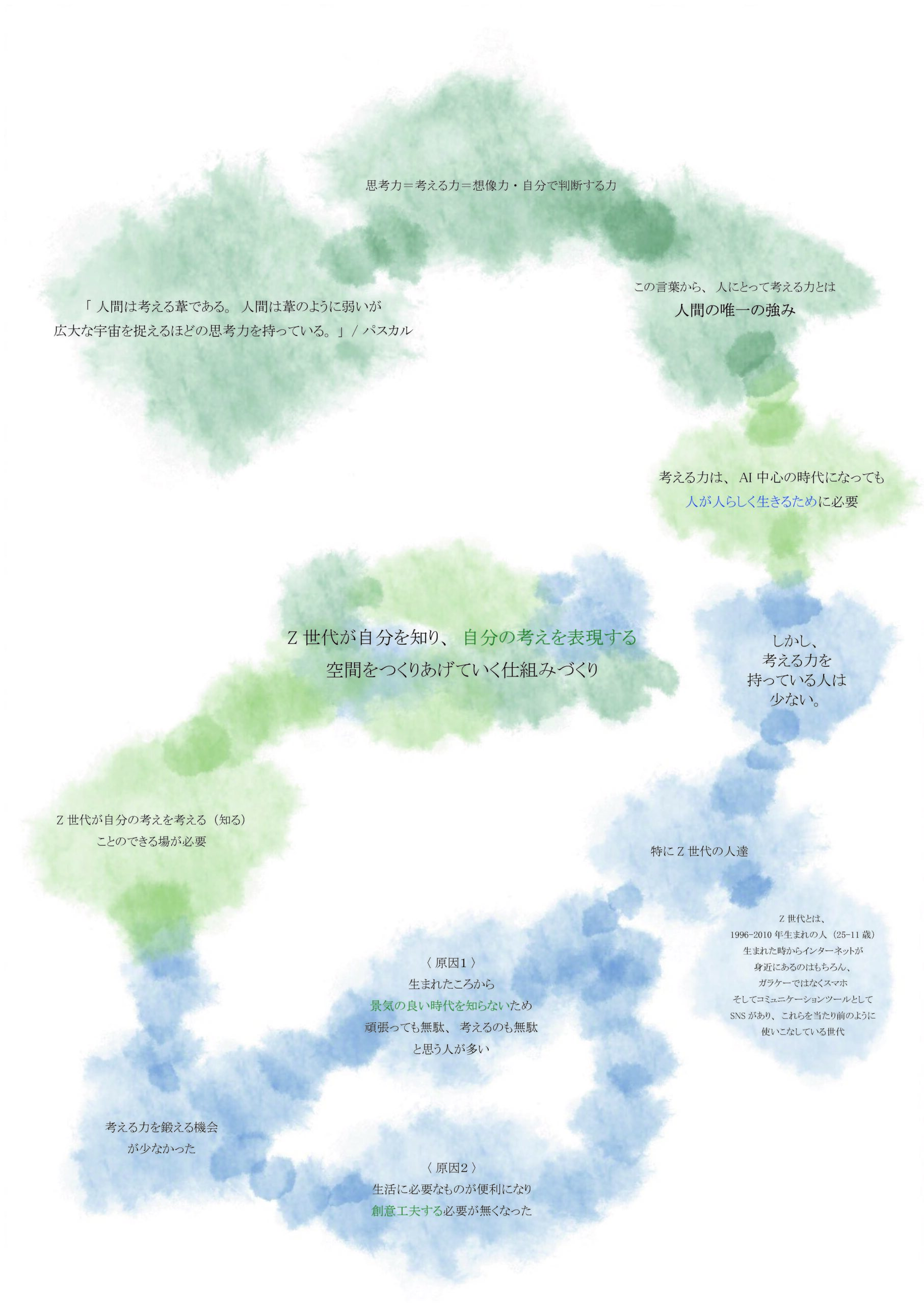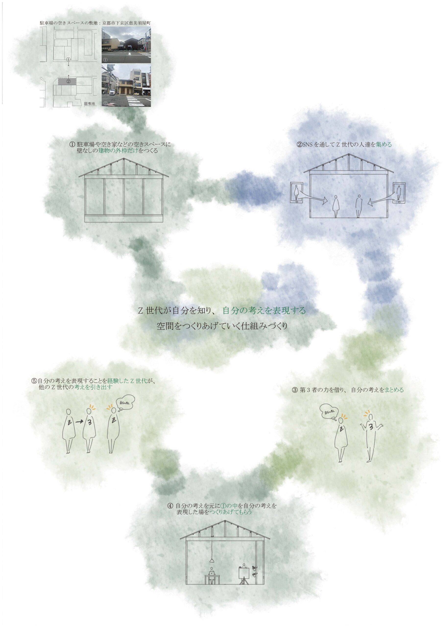 学生自身が置かれた時代の中で『考える力』を養うために建築空間が寄与できることは何かを考えた作品。Z世代と言われ選択肢が多く、そして不安定な世代がそれぞれの主張をどのように示し、社会と関わる機会をどう作り出すかを考えています。建築空間の成り立ちとして既存の街(周辺建物)のアウトラインを投影する手法は秀逸で、剥き出しの建物構造が持つモジュールを空間形成の手掛かりにしている。展開するモノ・コトを利用者に一方的に任せるのではなく、空間構造が可能性を示す事でより柔軟な考えを生み出す仕組みの提案です。 <阪本 剛史>