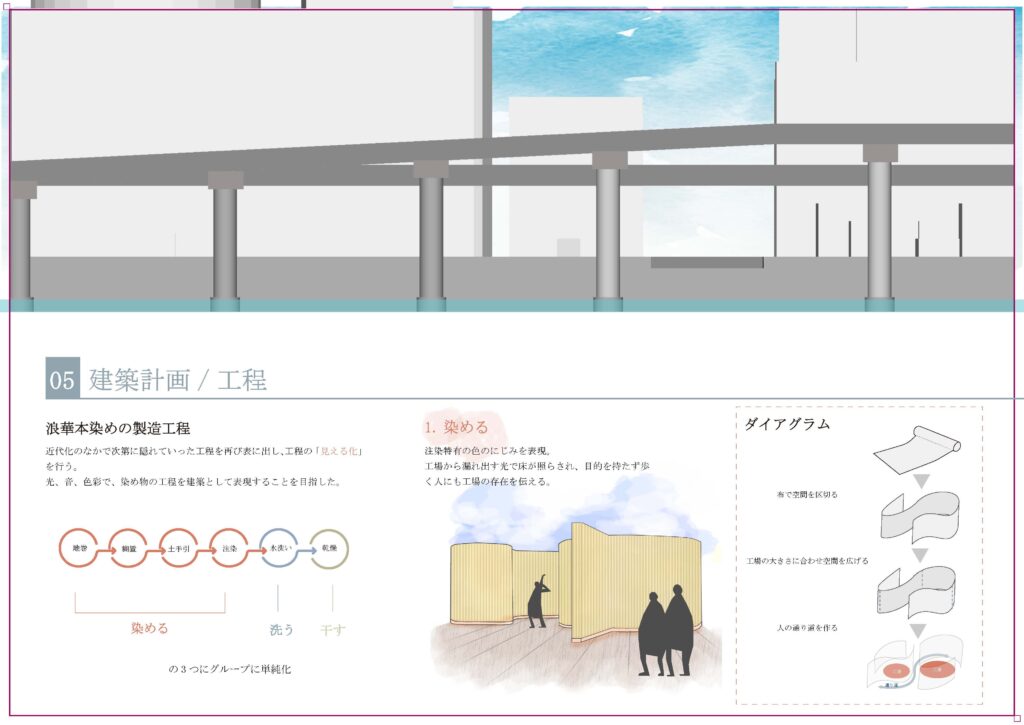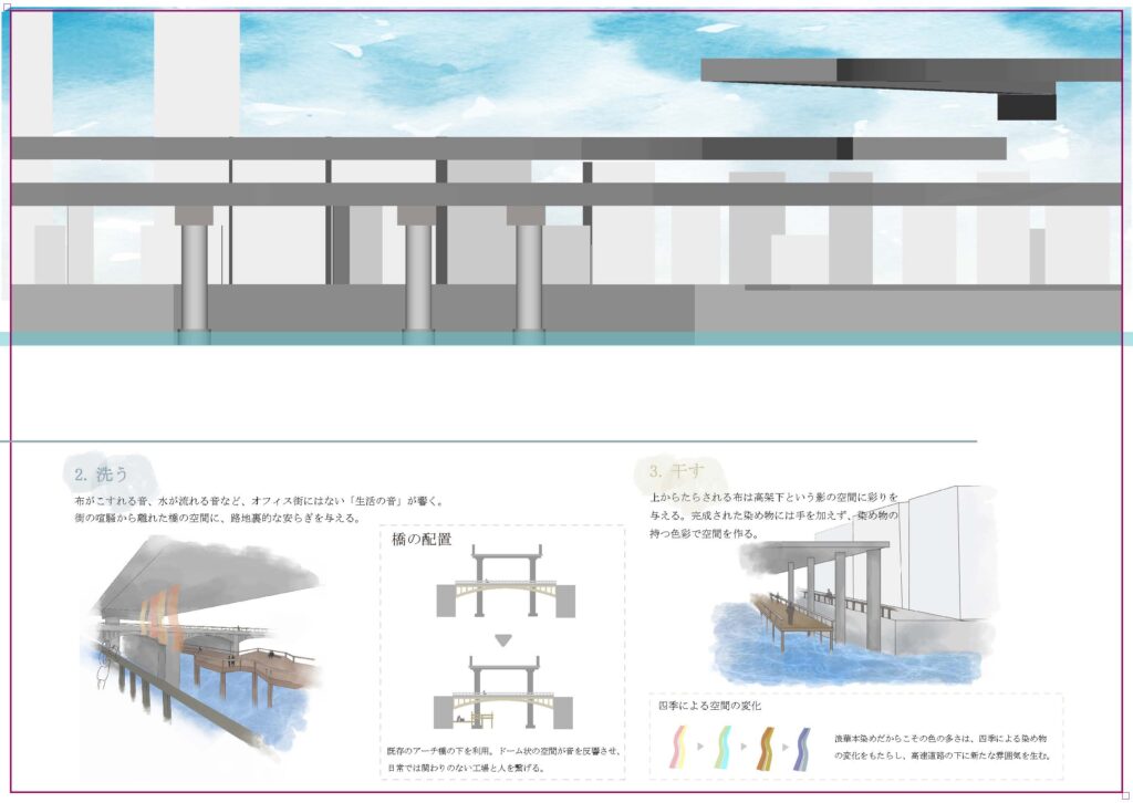 大阪府の伝統工芸品である『浪花本染め』と、浪花本染めが生まれた土地である『東横堀川』をテーマにした作品です。消えつつある伝統工芸品を街に必要な存在にすることで、土地や人の記憶に残り続ける物にしたいと考えました。
