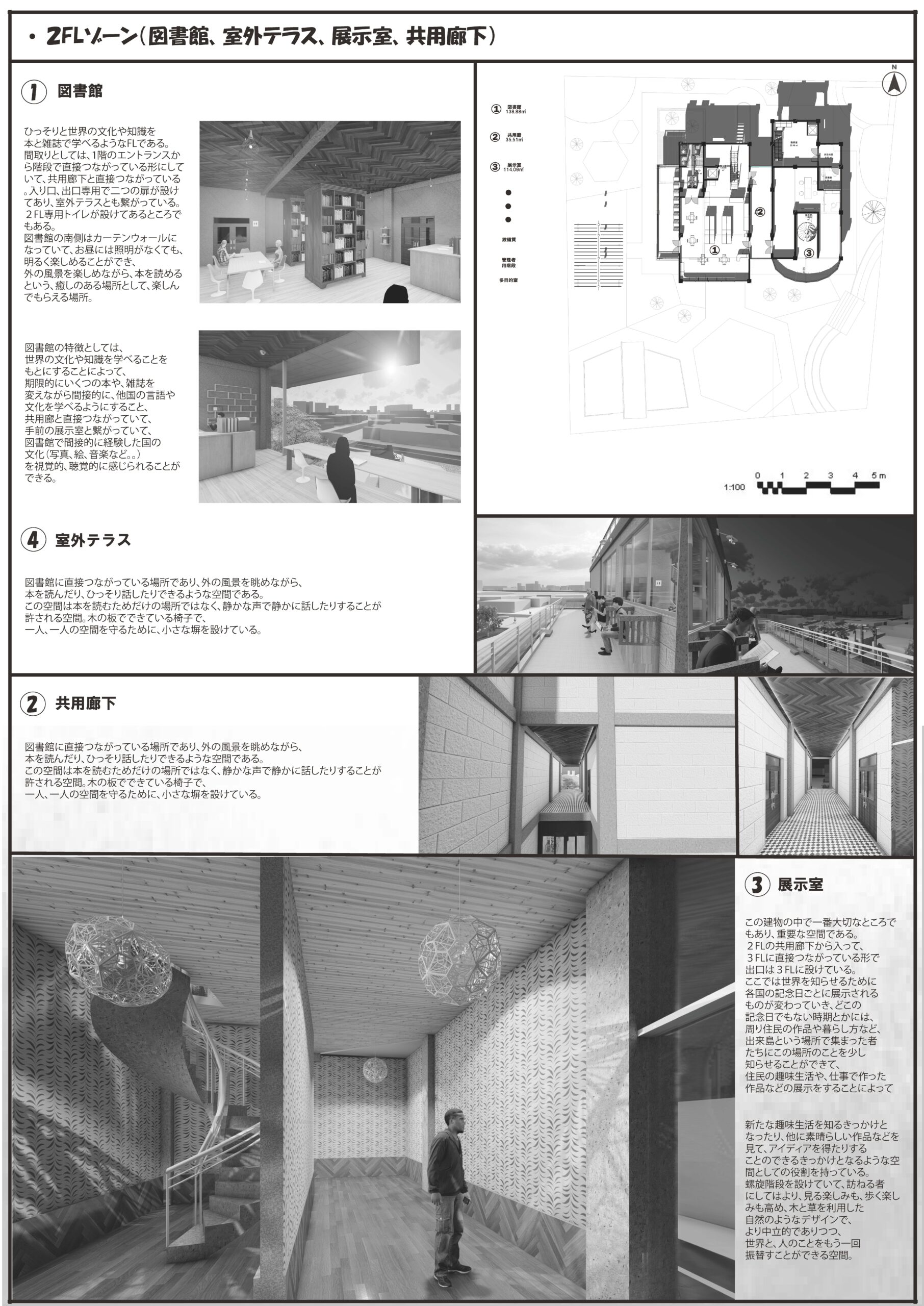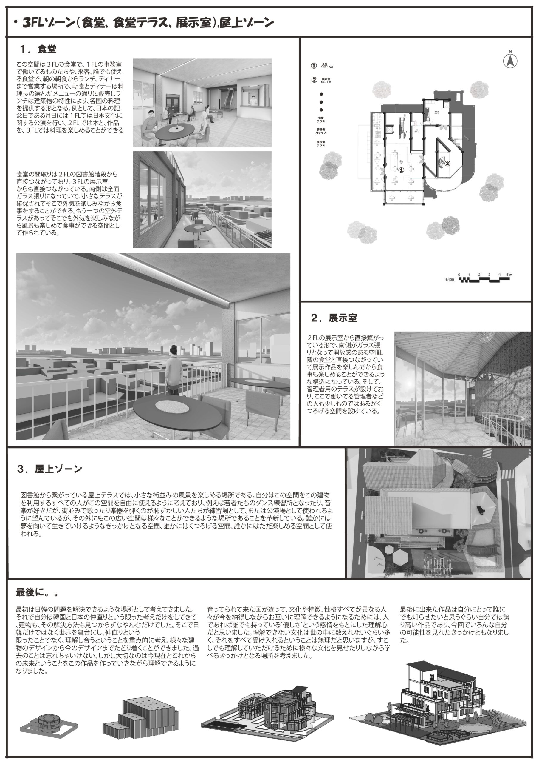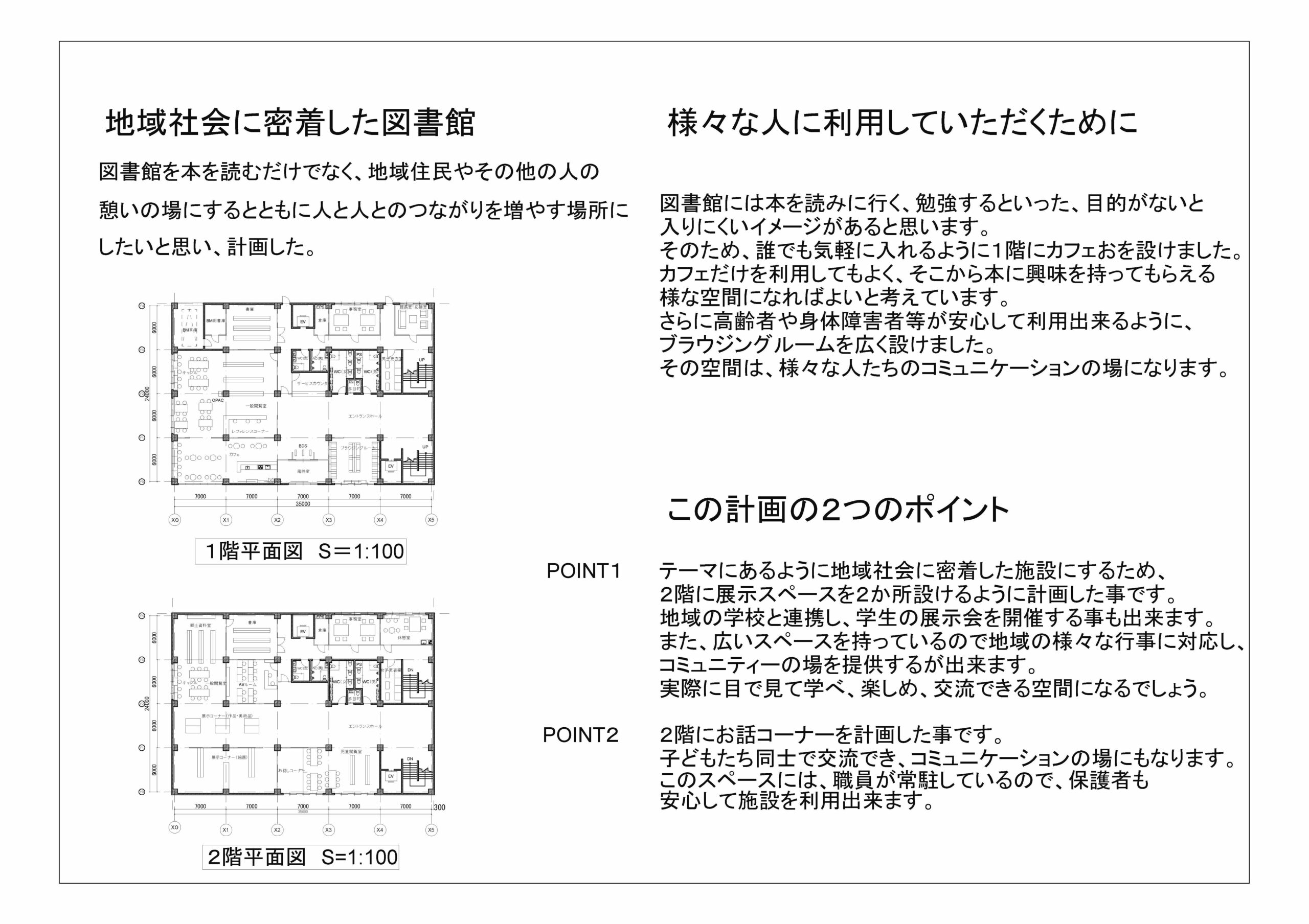 「図書館を中心としたコミュニティーの形成をどのようにするのか?」という問に、彼が出した答えがこの作品である。コミュニティーをどのように形成していくのか、図書館に必要な機能や施設はどのような施設があるのかを、1から自分で調べ形にした。現場で使用される施工図も見やすく描くように気配りをするなど、温厚で親しみやすい彼らしい作品として仕上がっている。今後、現場監督として活躍していく姿に期待したい。 <井上 嘉亮>