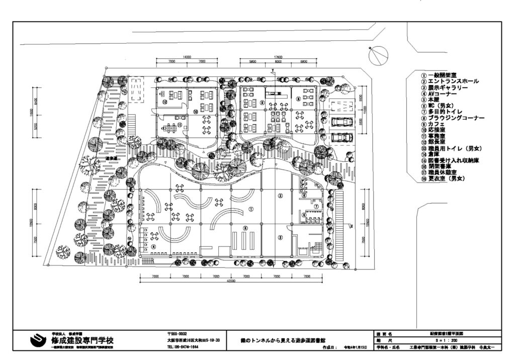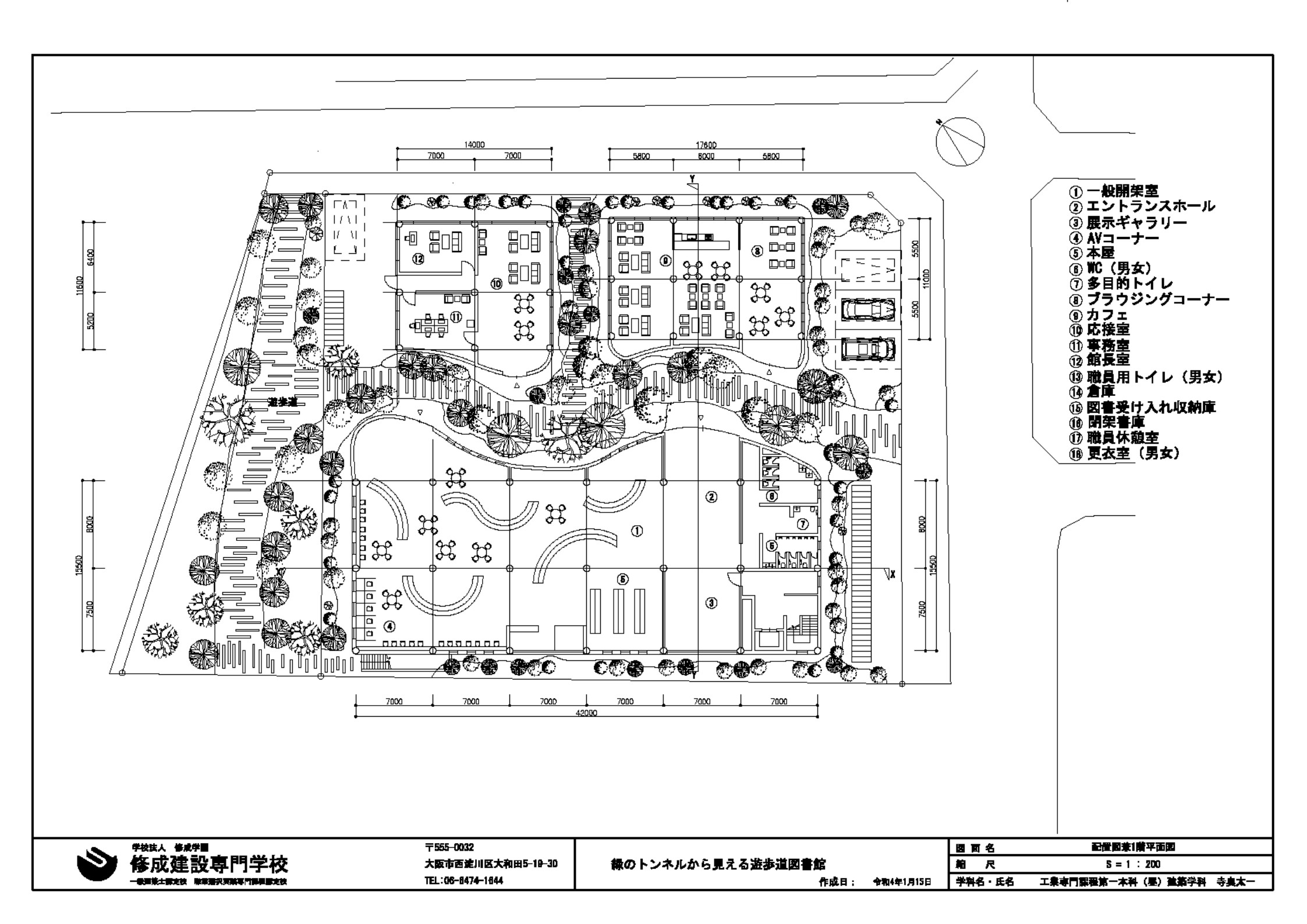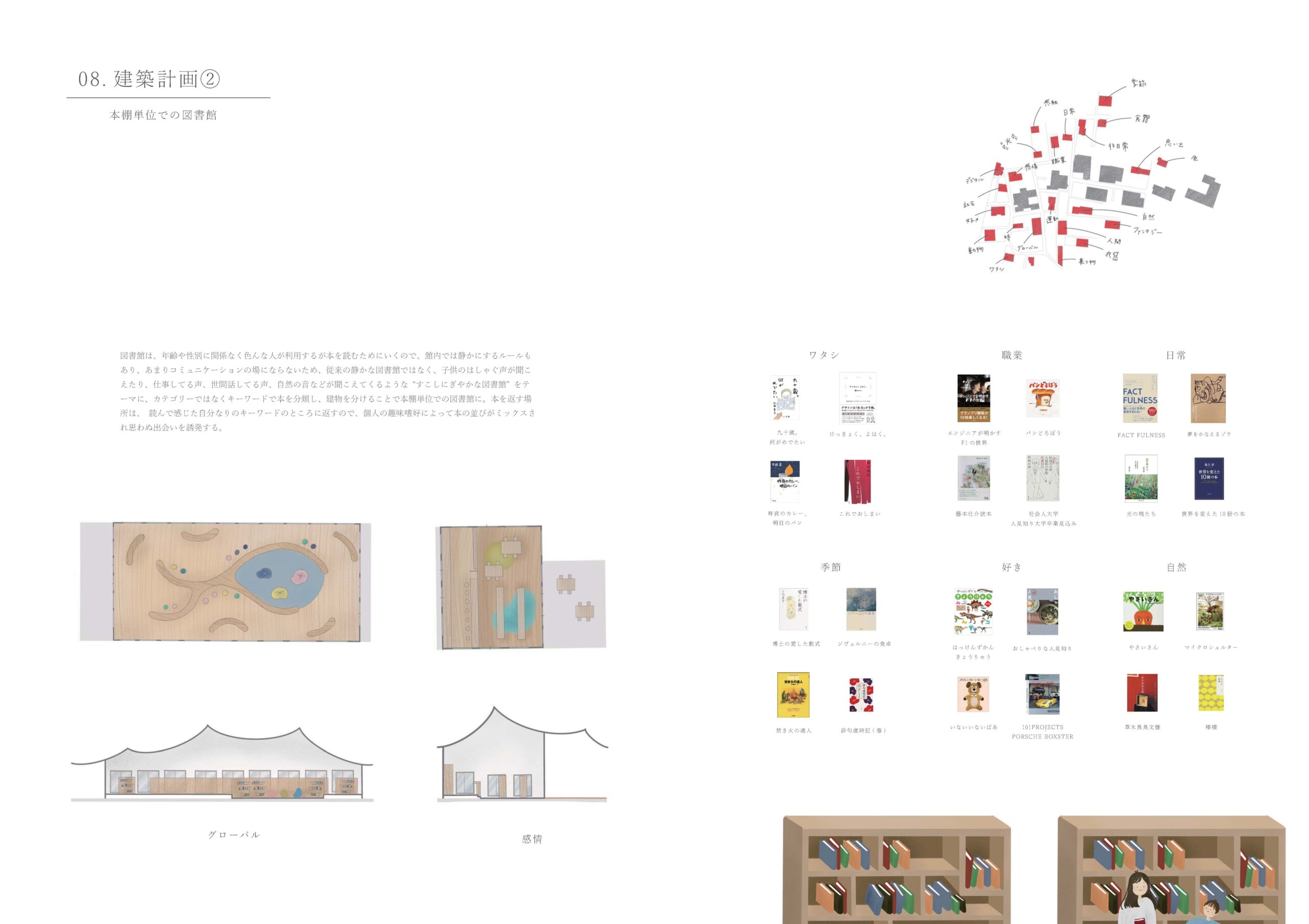 「図書館を中心としたコミュニティーの形成をどのようにするのか?」という問に、彼が出した答えがこの作品である。コミュニティーをどのように形成していくのか、図書館に必要な機能や施設はどのような施設があるのかを、1から自分で調べ形にした。現場で使用される施工図も見やすく描くように気配りをするなど、温厚で親しみやすい彼らしい作品として仕上がっている。今後、現場監督として活躍していく姿に期待したい。 <井上 嘉亮>