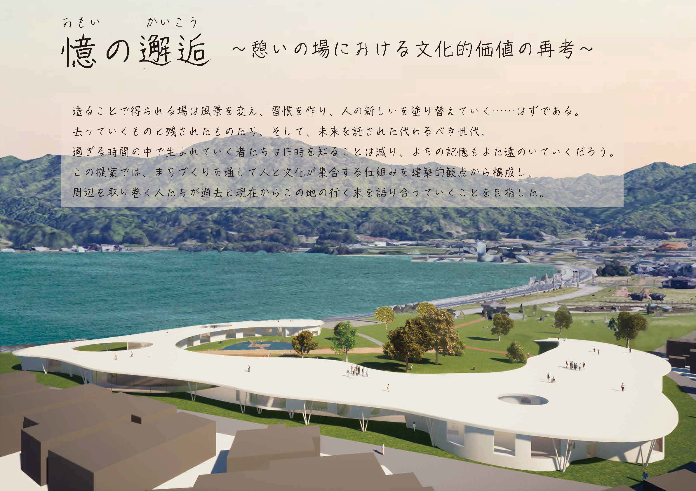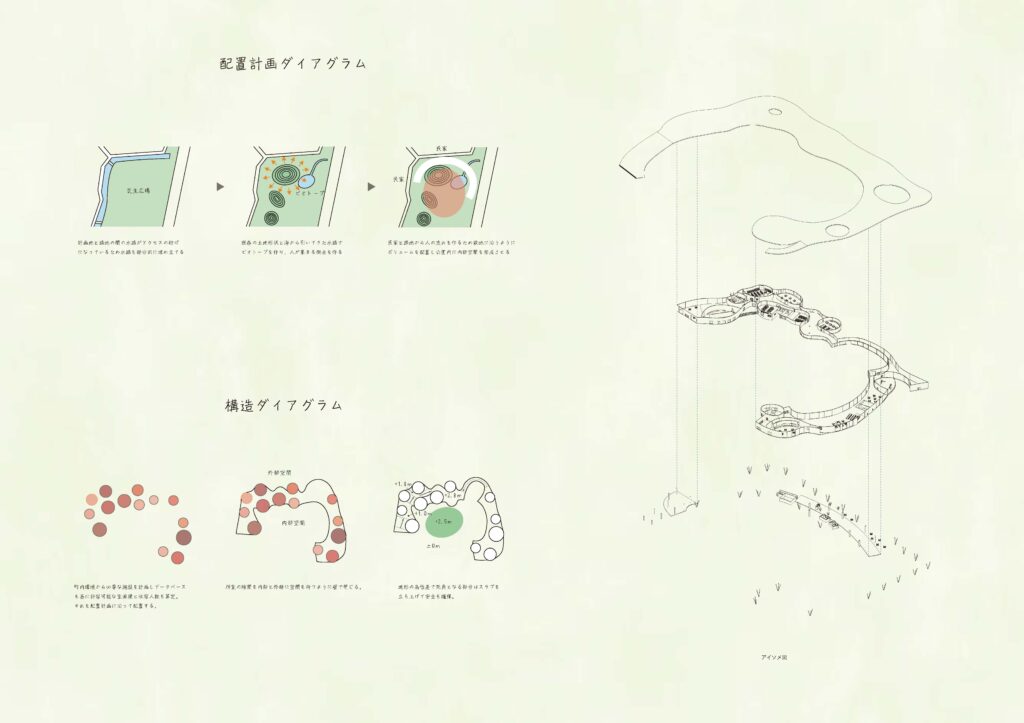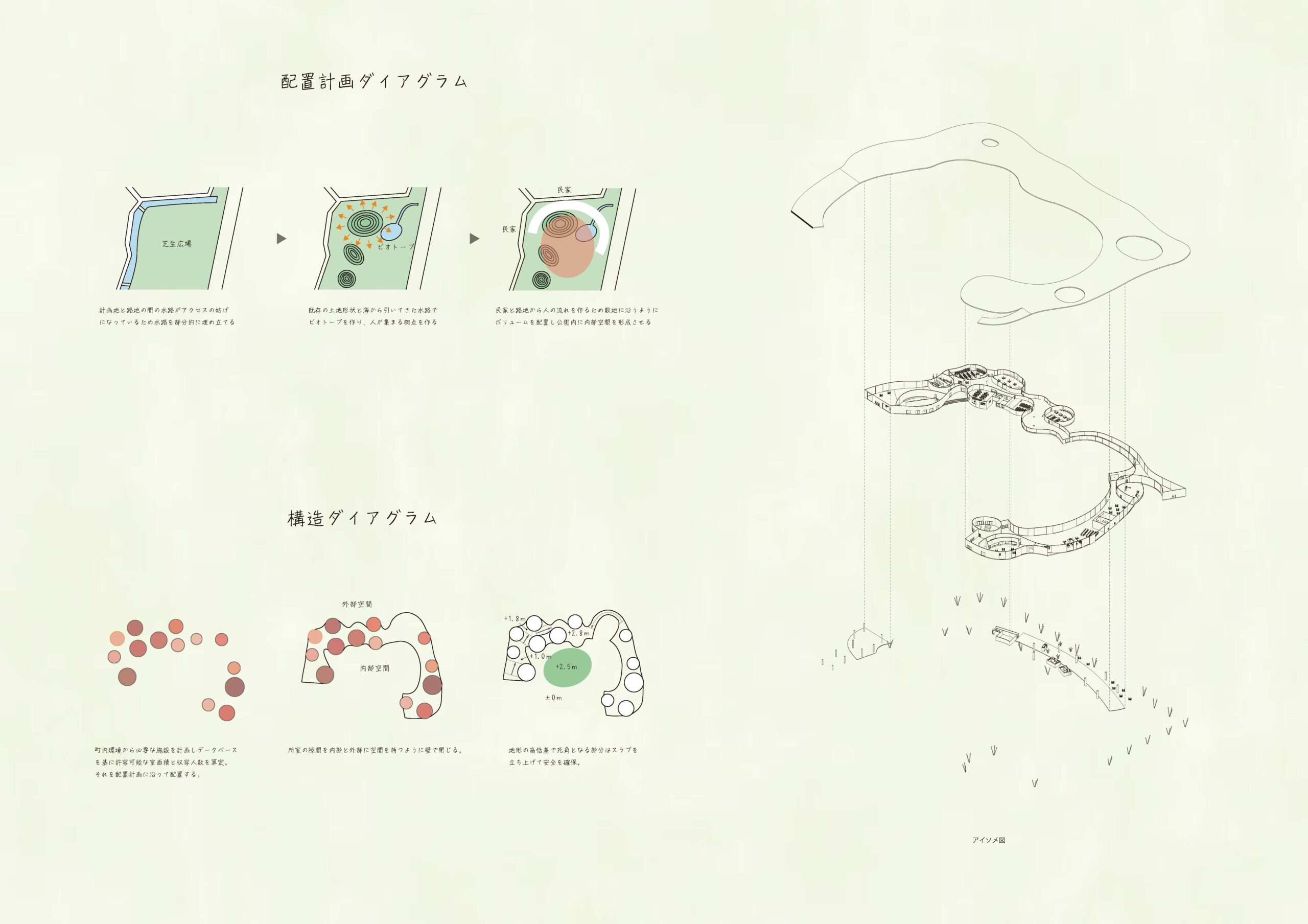 茫洋とした地元の公園に、町役場のマスタープランと自分自身が感じた経験を手掛かりにして、地域の文化的価値を再認識できる複合施設を計画した。町に散らばっている魅力を公園という子供の遊び場に集約することで伝統と発展、過去から未来へと人々の使命感を駆り立てる。これは、観光地化することに町の発展を見出すためのものではなく、住民の快適な暮らしと集いの場所を内側から活性化させていく町おこしである。