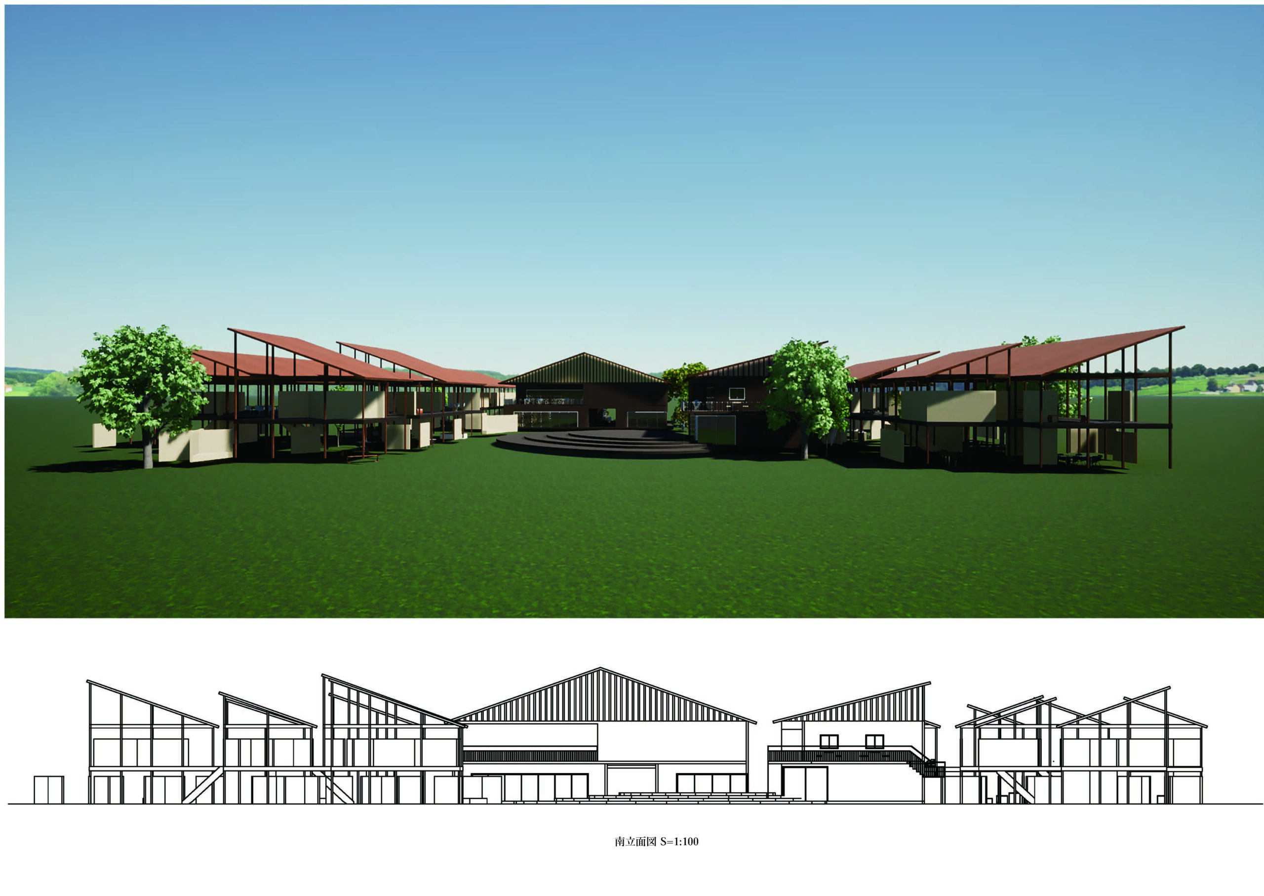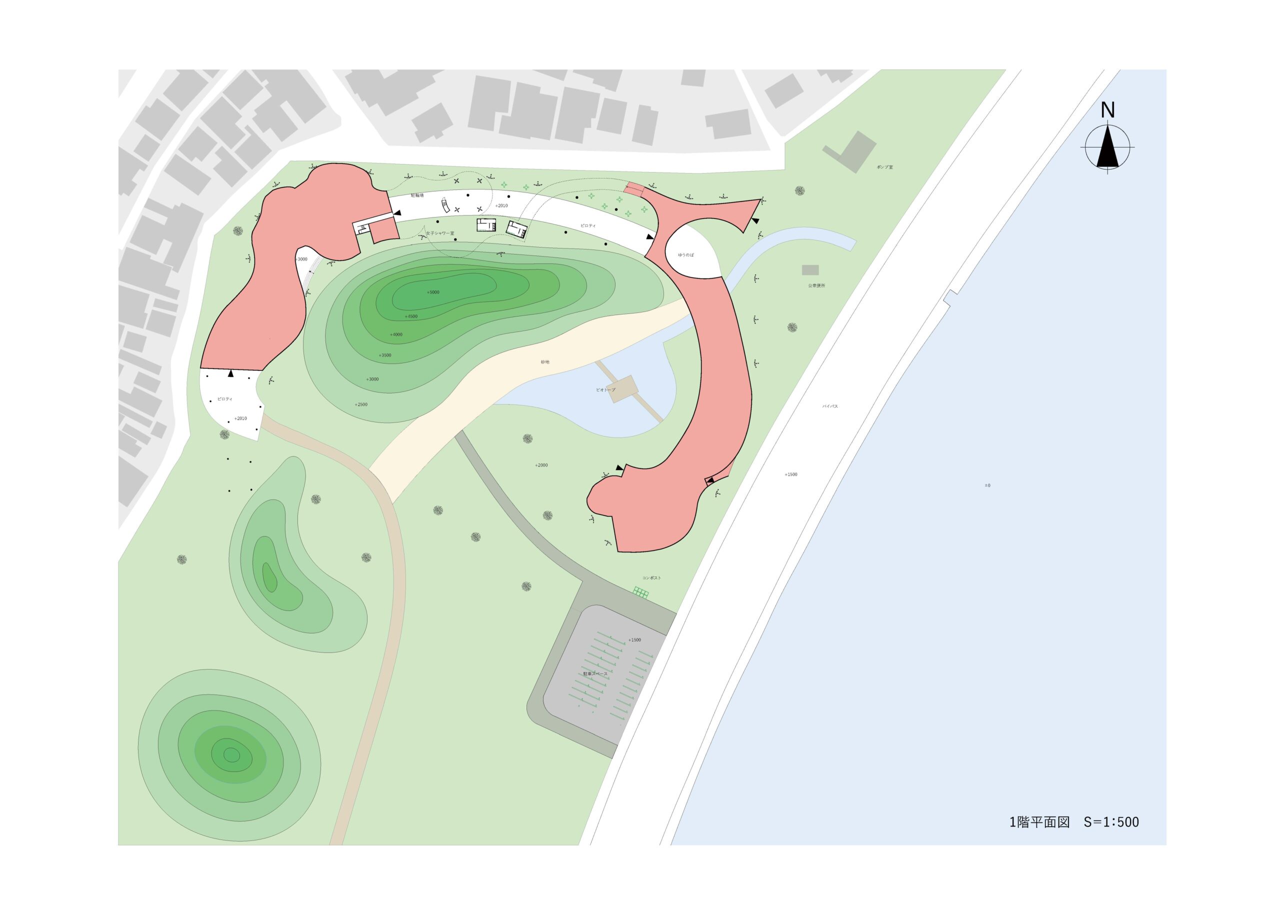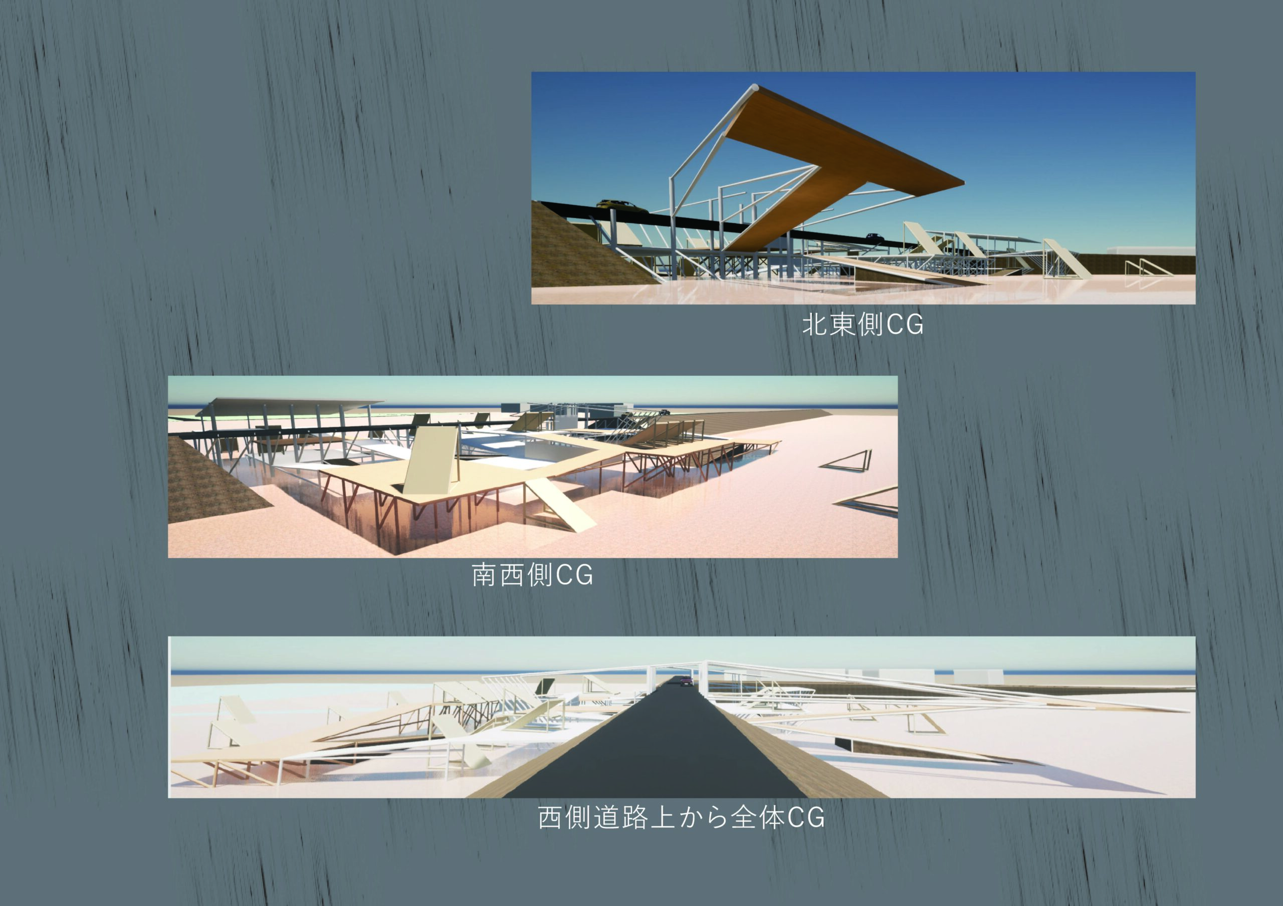 茫洋とした地元の公園に、町役場のマスタープランと自分自身が感じた経験を手掛かりにして、地域の文化的価値を再認識できる複合施設を計画した。町に散らばっている魅力を公園という子供の遊び場に集約することで伝統と発展、過去から未来へと人々の使命感を駆り立てる。これは、観光地化することに町の発展を見出すためのものではなく、住民の快適な暮らしと集いの場所を内側から活性化させていく町おこしである。