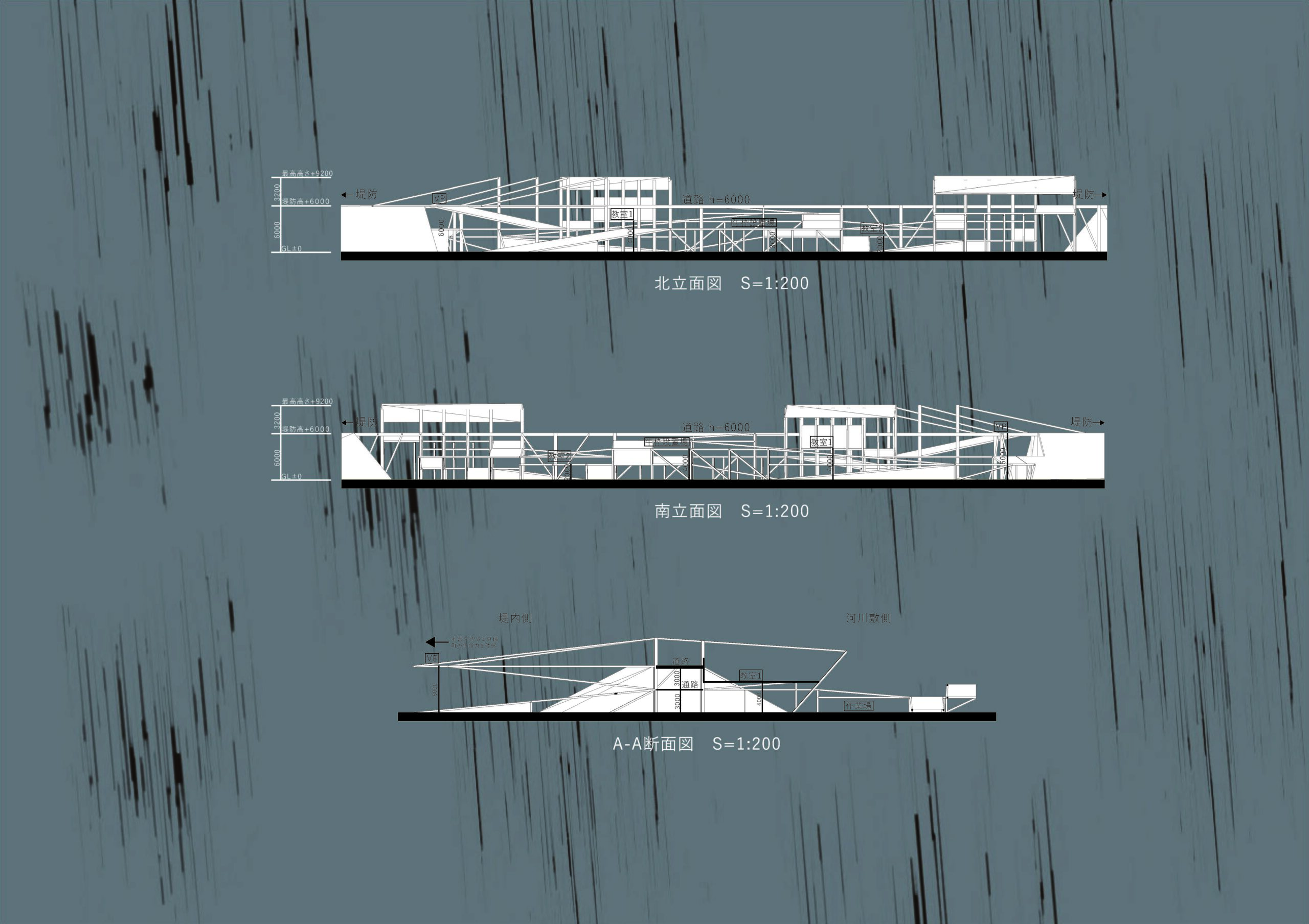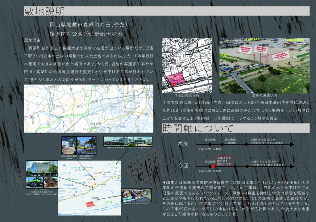 2018年の西日本豪雨で岡山県真備地区の堤防が約100mに渡り決壊し、甚大な被害をもたらした。彼は現在進行しているその復旧土木工事の手法に疑問を持ち、環境をねじ伏せる現代の土木事業と置換可能な建築的手法を探った。まず地域の特性や土木の歴史を調査し、それを地域の人たちが参加する建築行為へと昇華させた。過去に巨大な防潮堤を標的に戦いを挑んで敗れた学生を見てきたが、この敷地は扱いやすい規模であり、無理のない提案に仕上がっている。 <田中 おと吉>"