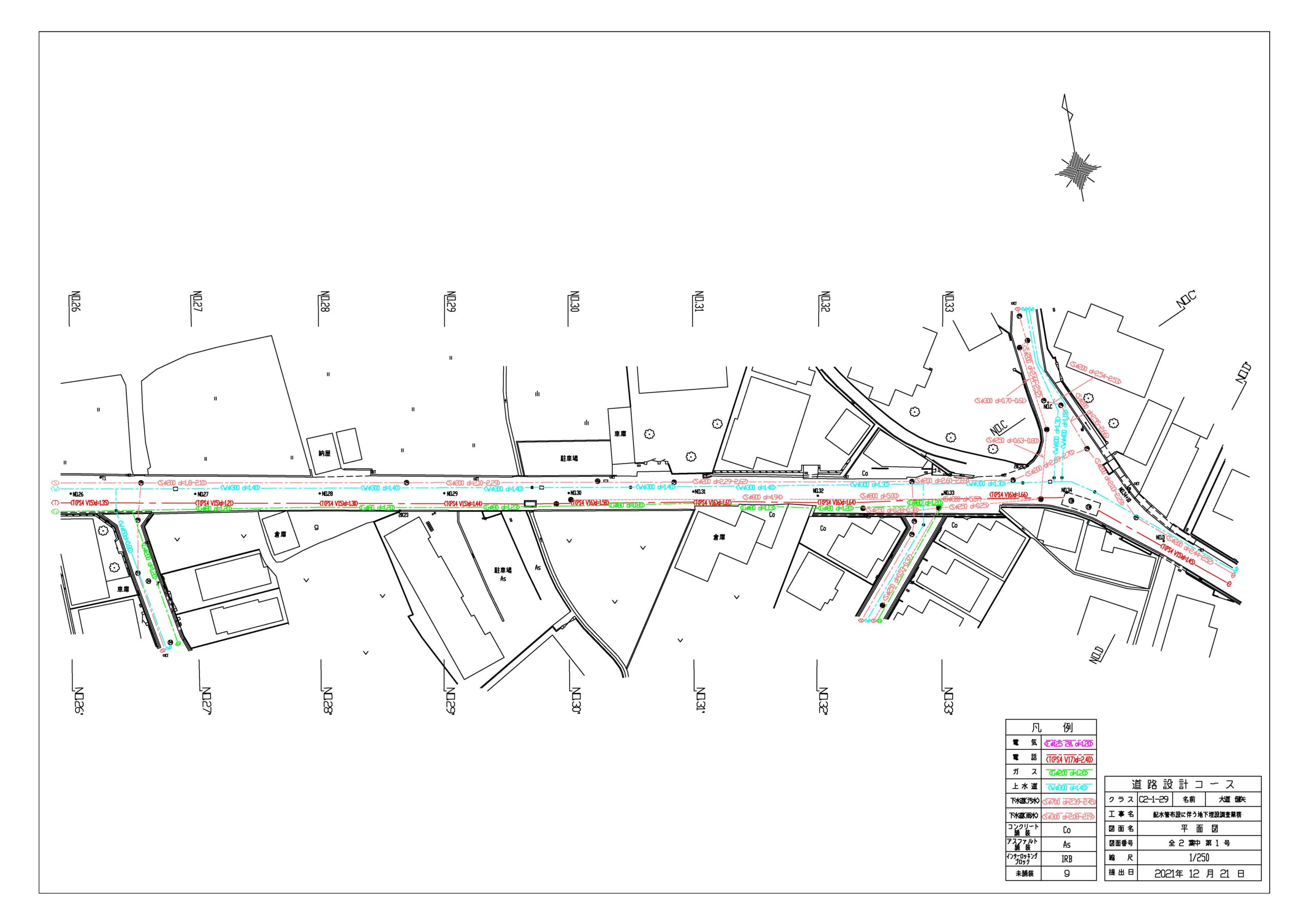 各管理者の資料を一つの図面にまとめるには埋設物の深さと水平位置の計算や専門記号の解読・管径の割出など作業量の多い課題であったが、着実に作業を積み重ね複合図を完成させた。 <川西 幸男>