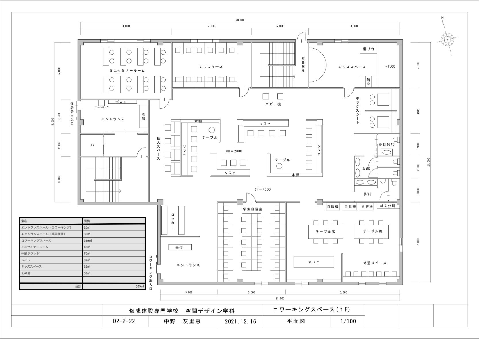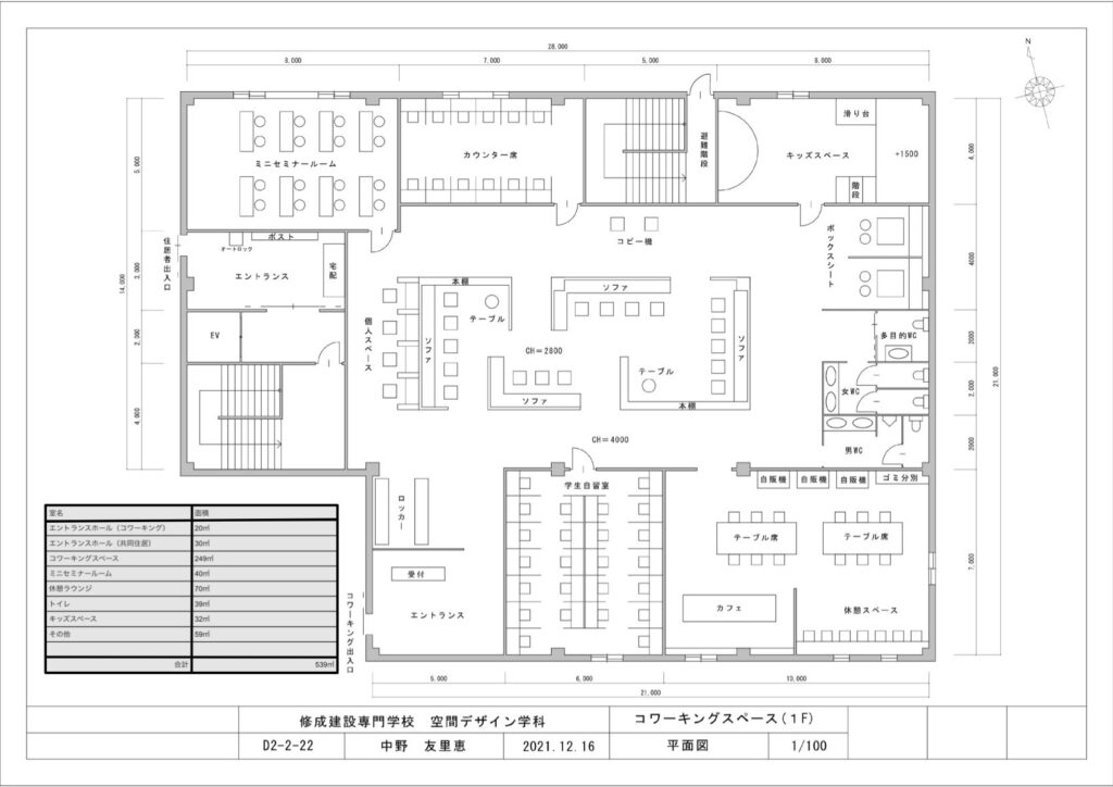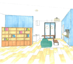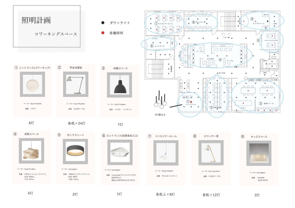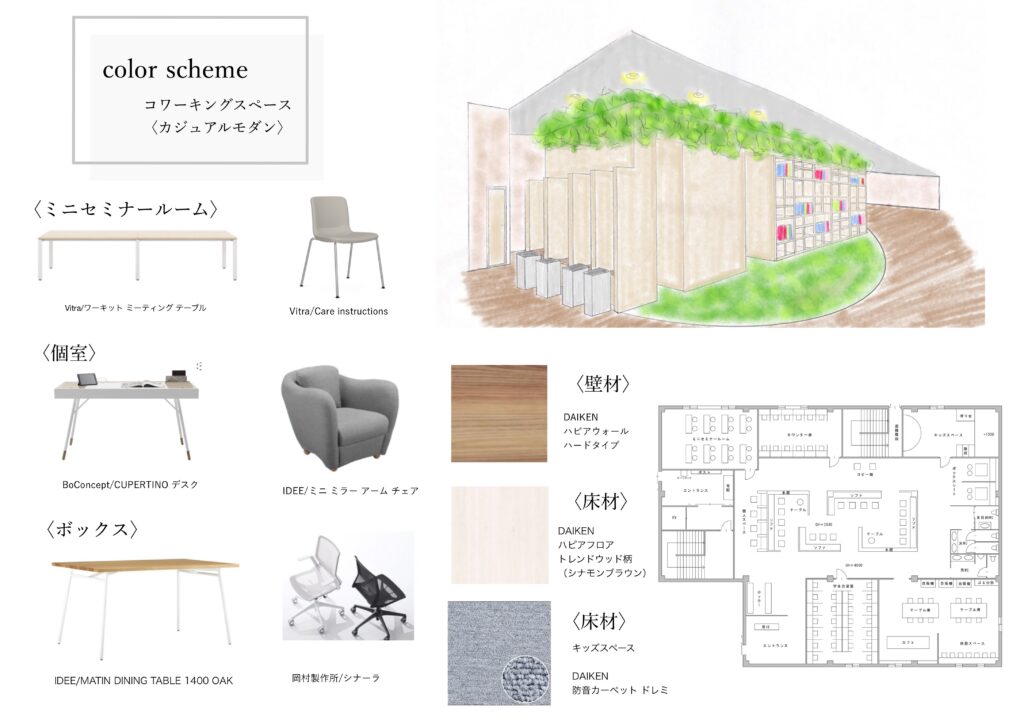 今回私が計画したコワーキングスペースは性別、年齢、人種など関係なく誰もがいつでも利用できることを目的に計画しました。ジェンダー平等を求められる昨今、仕事をしながら子育てをする女性や留学生のために教え合いができるスペースを設けて気軽に利用してもらえるような空間を計画しました。家具や照明選びをするにあたって、自分のイメージするスタイルに近づける楽しさやパースを描くことに時間をかけたので是非見ていただきたいです。