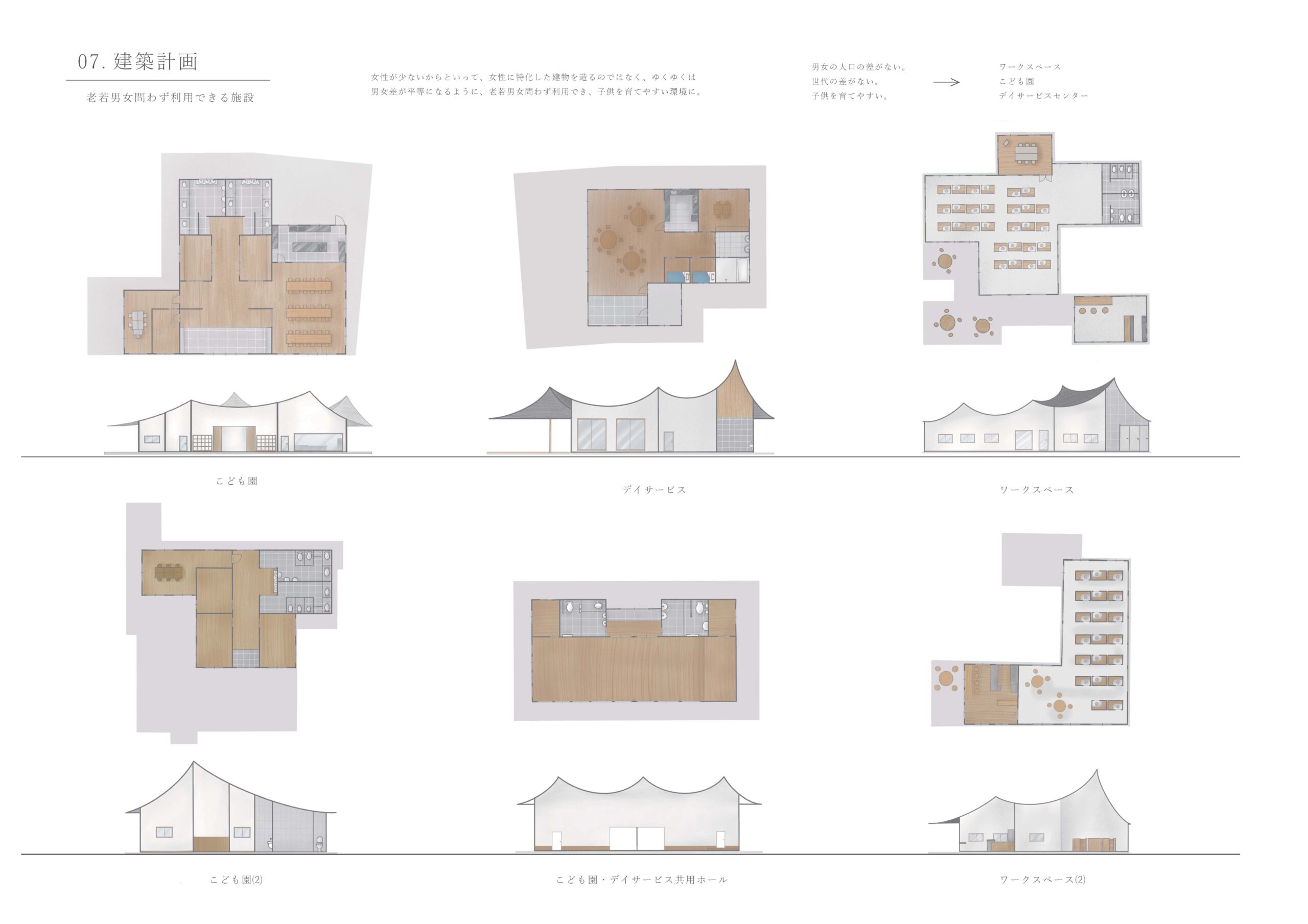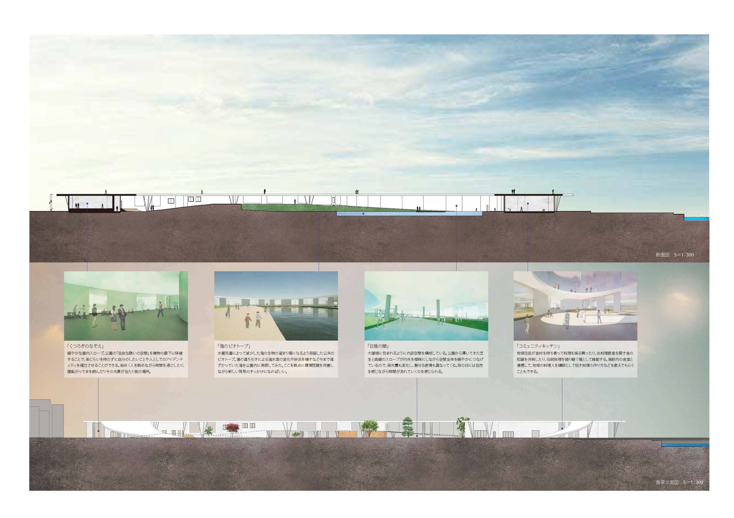町の生活を支えてきた港を埋め立てて出来上がった公園とバイパス道路は街の活力を奪ってしまった。そこを敷地として、そこで生まれ育った地元民の視点で場所の特性を読み解き、住民とともに場所を作り上げるプログラムを組み立てた。コンサル主導の地域開発的な手法から脱却しきってはいないけれども、困難な課題に対してまとまりのある回答にまで達したところは評価に値する。 <田中 おと吉>