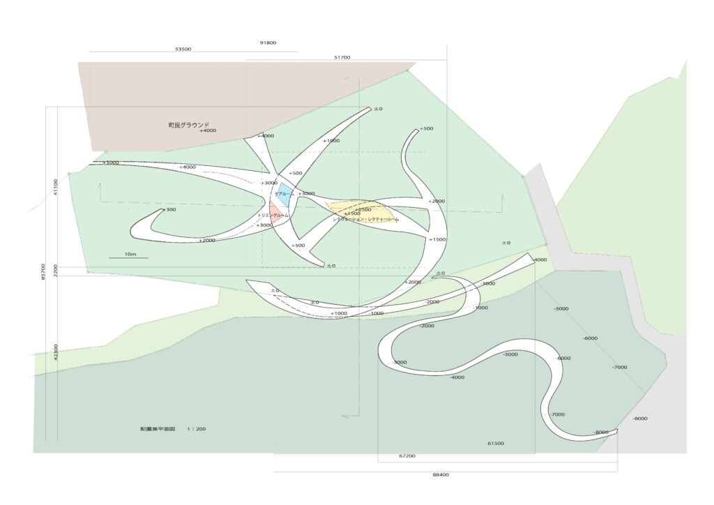 一般的な公共建築特有のひと棟づくりの「大舎化」を避け、「分棟」にしてその建物間を少しうねりながら遊歩道とつなげる平面計画を、高く評価したい作品である。