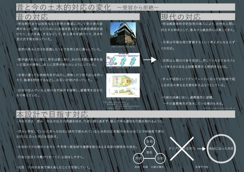 私は「洪水」をテーマに、現代のテンプレート化している画一的で不可逆性の強い土木的施策を続けていいのかを喚起する卒業設計をしました。ここでは現代の土木的機能を取り入れつつも、住民が主体となって参加できる建築的行為によって防災と向き合うことができます。この装置により、ただ洪水を拒絶し抑え込むのではなく、昔のように受容し向き合うきっかけとなる提案としました。