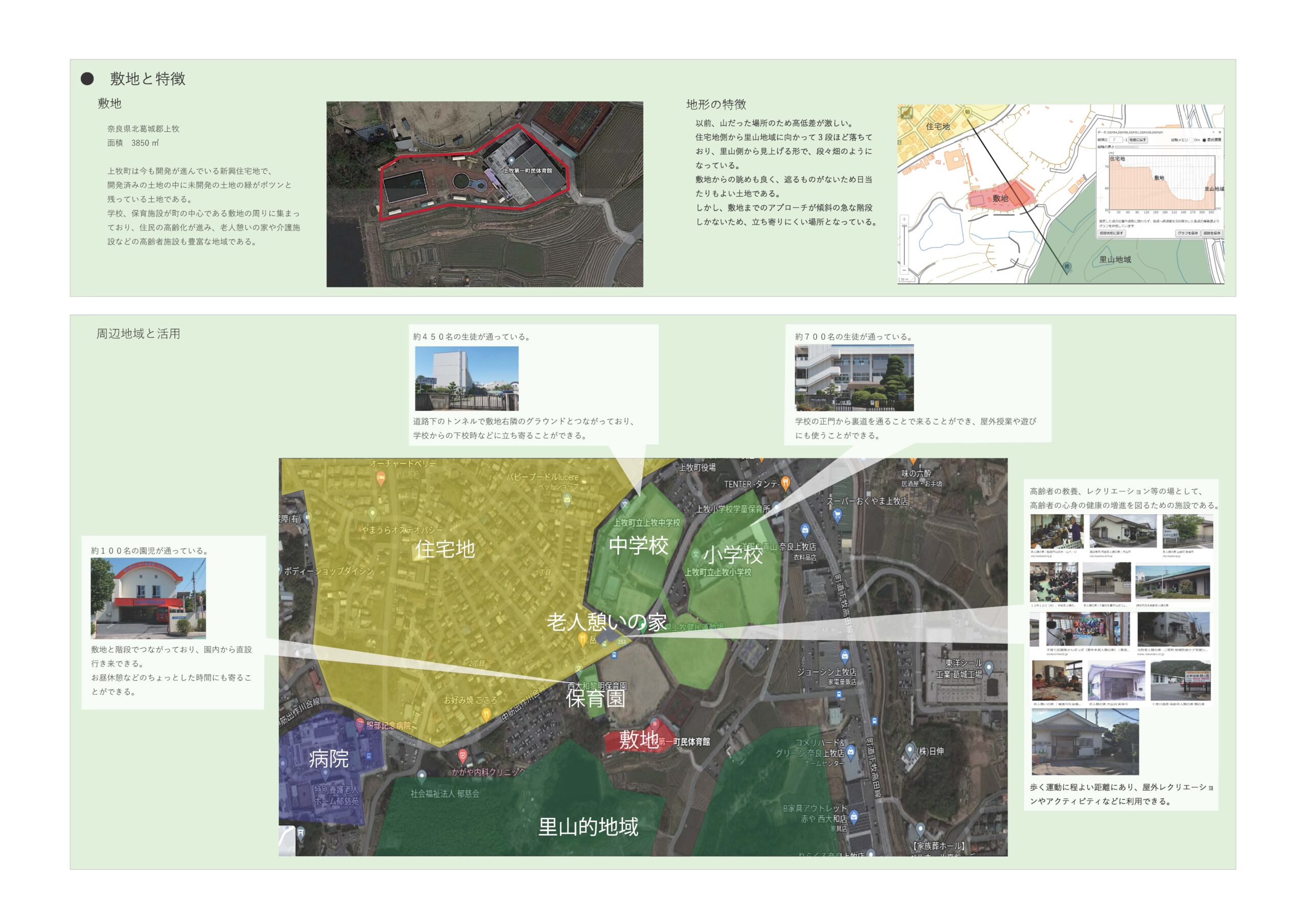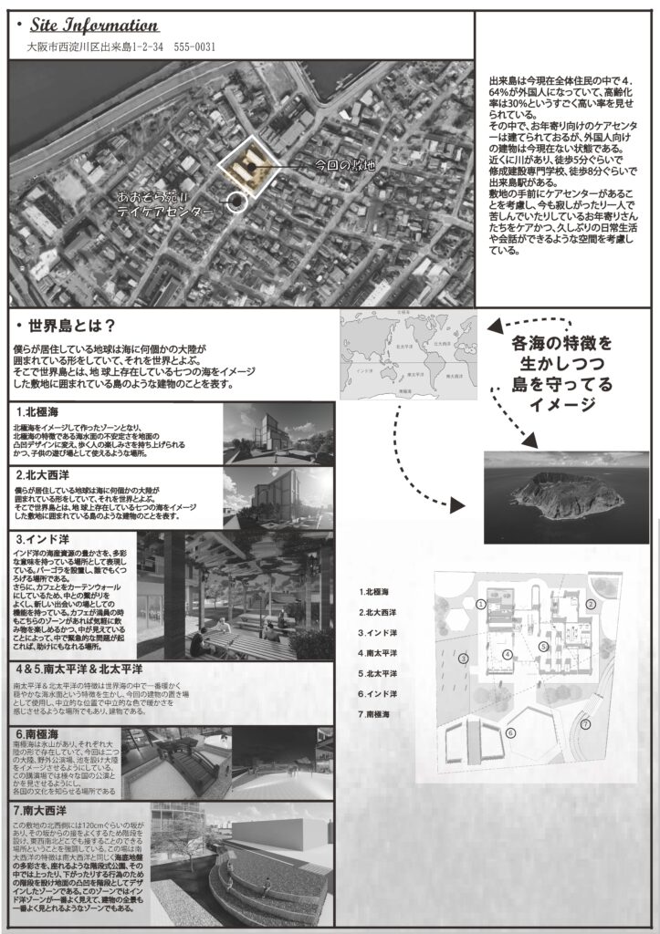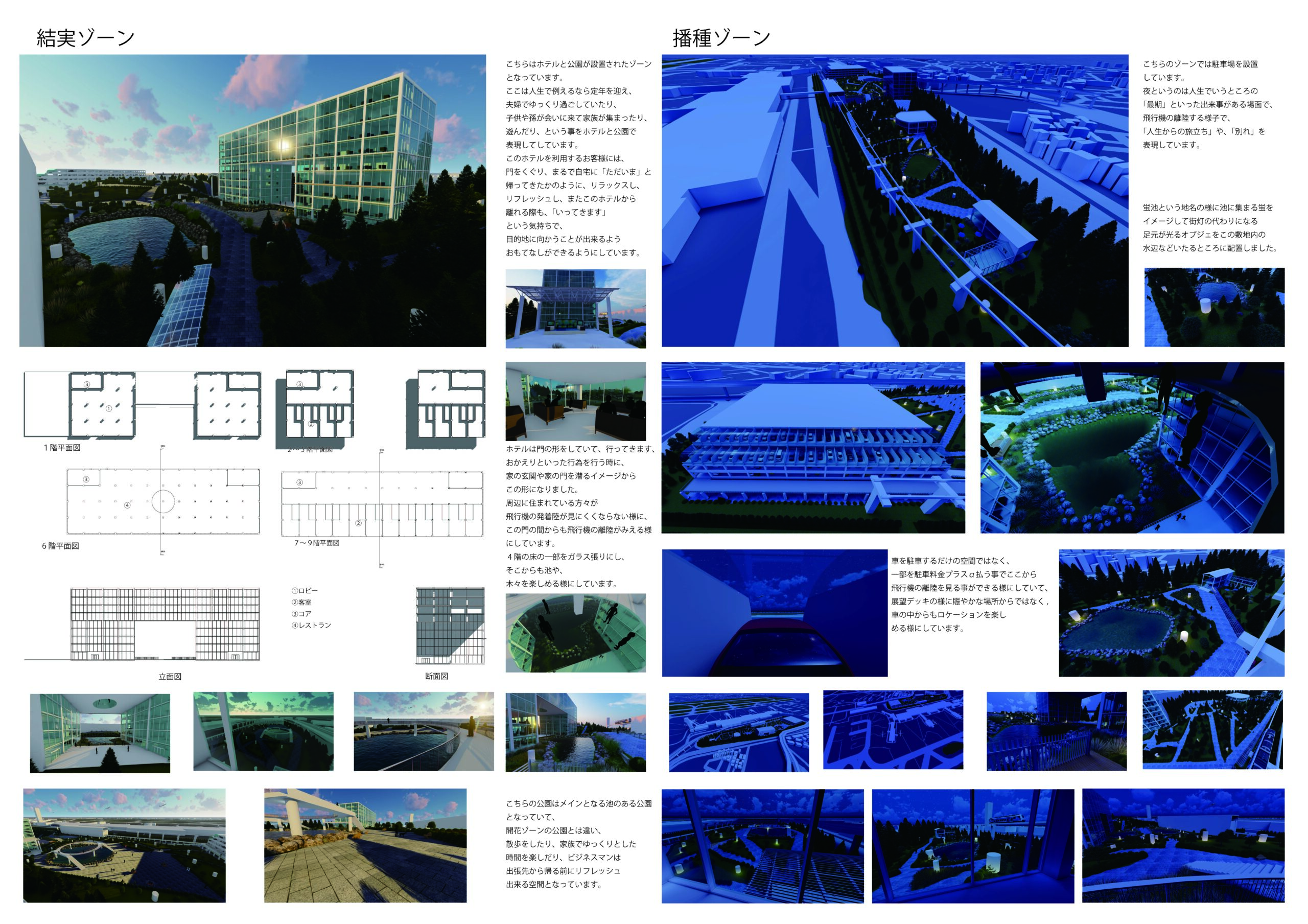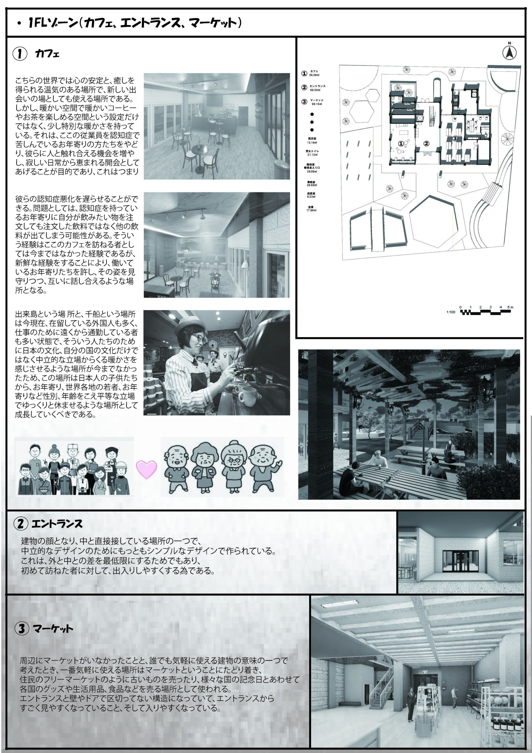 彼自身の経験から感じた少子高齢化社会での問題に対する解決策を卒業設計の課題とした。有り勝ちな発想を個人的視点で見直すことで彼なりの解答を得られた。プレゼンテーションのまとめ方は荒削りで稚拙な面も多く見受けられるが、ドライな彼が普段には見せることのないものづくりへの執着を見せてくれた。彼が指導担当者との対話を通じて、一定程度の結果を見出し、等身大のかたちに結実することが出来た。最後まで粘り強く作品に向き合った成果に称賛を送るものである。 <角野 峰生>