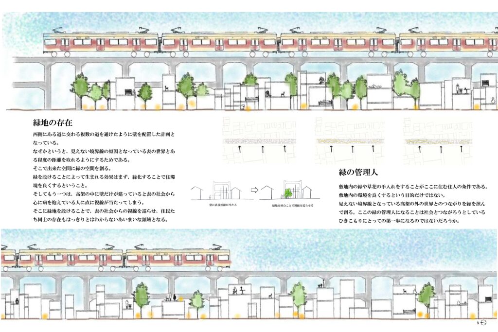 本作品は、今や誰もが普通になり得る“ひきこもり”をどのように社会定着させるか、という感度の高いテーマに取り組む。別人格として隔離してしまうネガティブな発想に留まらず、人類が高速度・高密度を求めて創り出した産物「高架」を都市の未利用地として発見し、逆に緩やかな時間と場所の流れを提供する場「サナトリウム」に変換させ、“ひきこもり”に対する偏見を和らげ、シームレスでほんのり優しい都市空間を魅せている。 <鍵山 昌信>