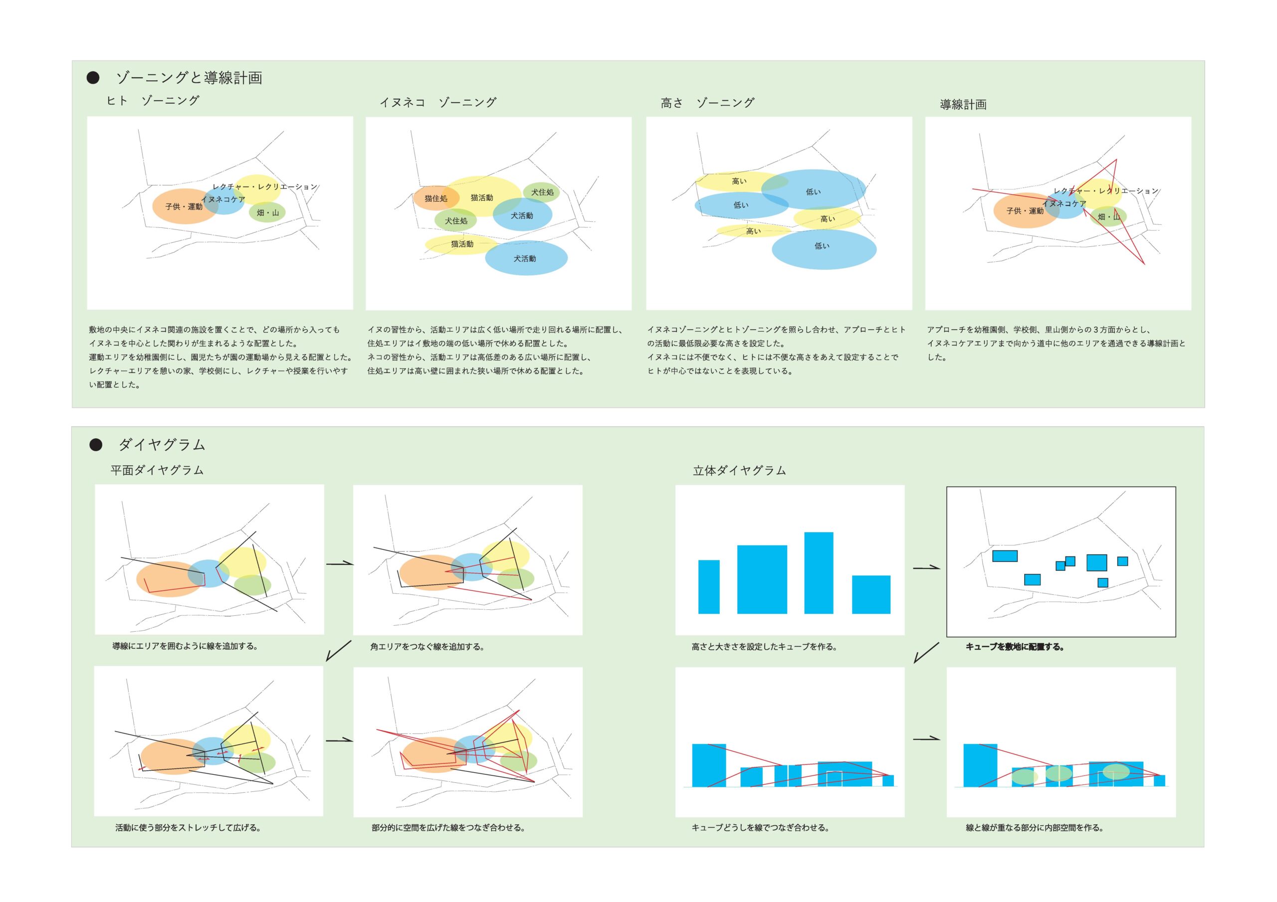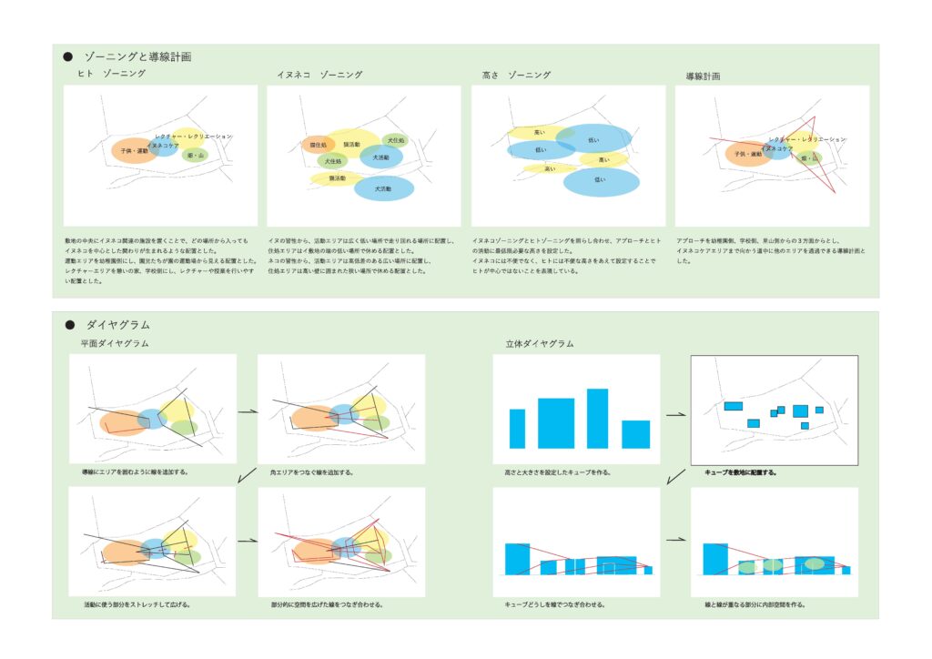 敷地と町をスロープでつなぎ、そのスロープが作るヒトにもイヌネコにもフォーカスをあてた空間が交錯し交流を促す計画をしました。