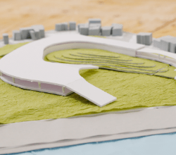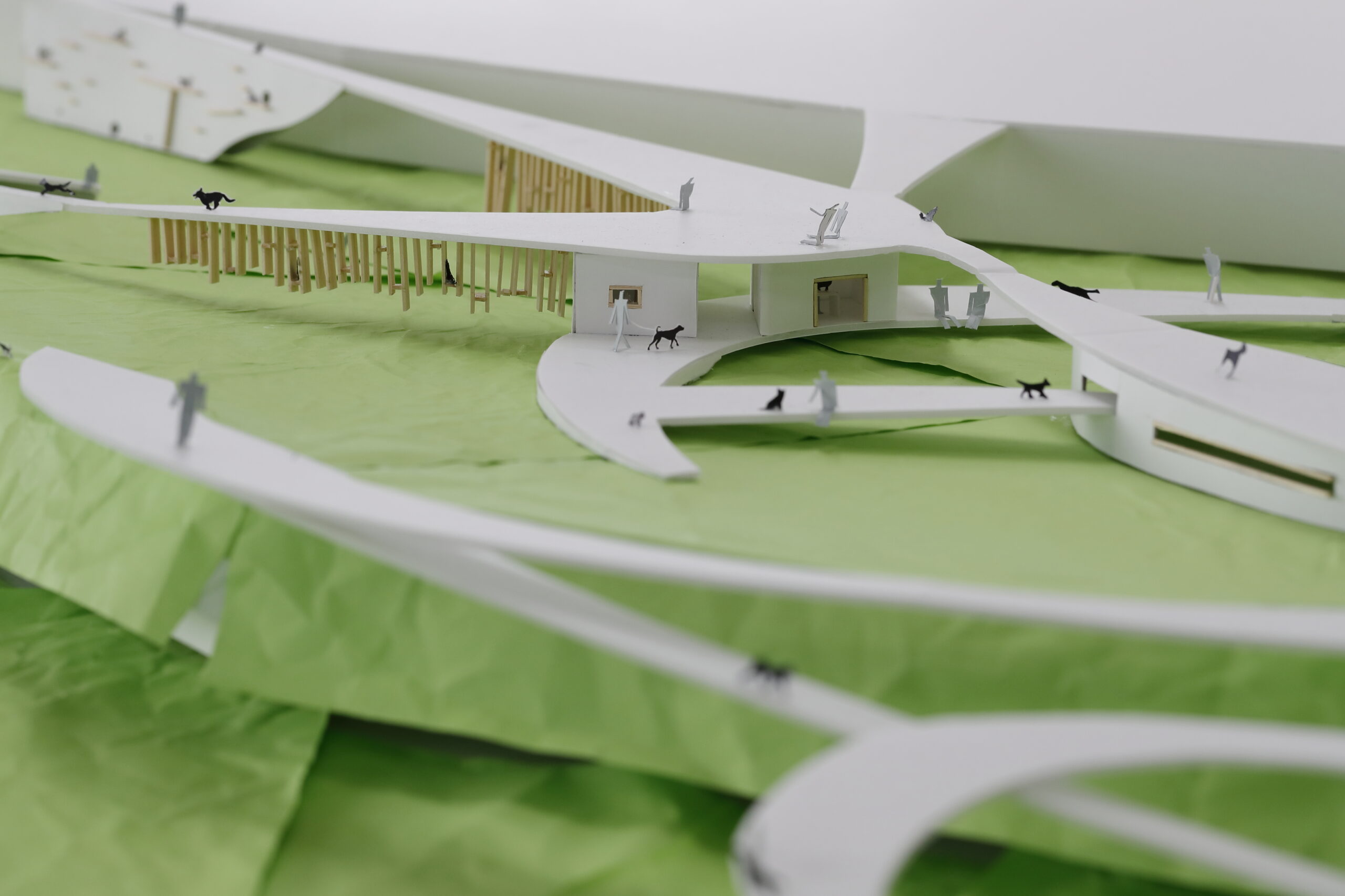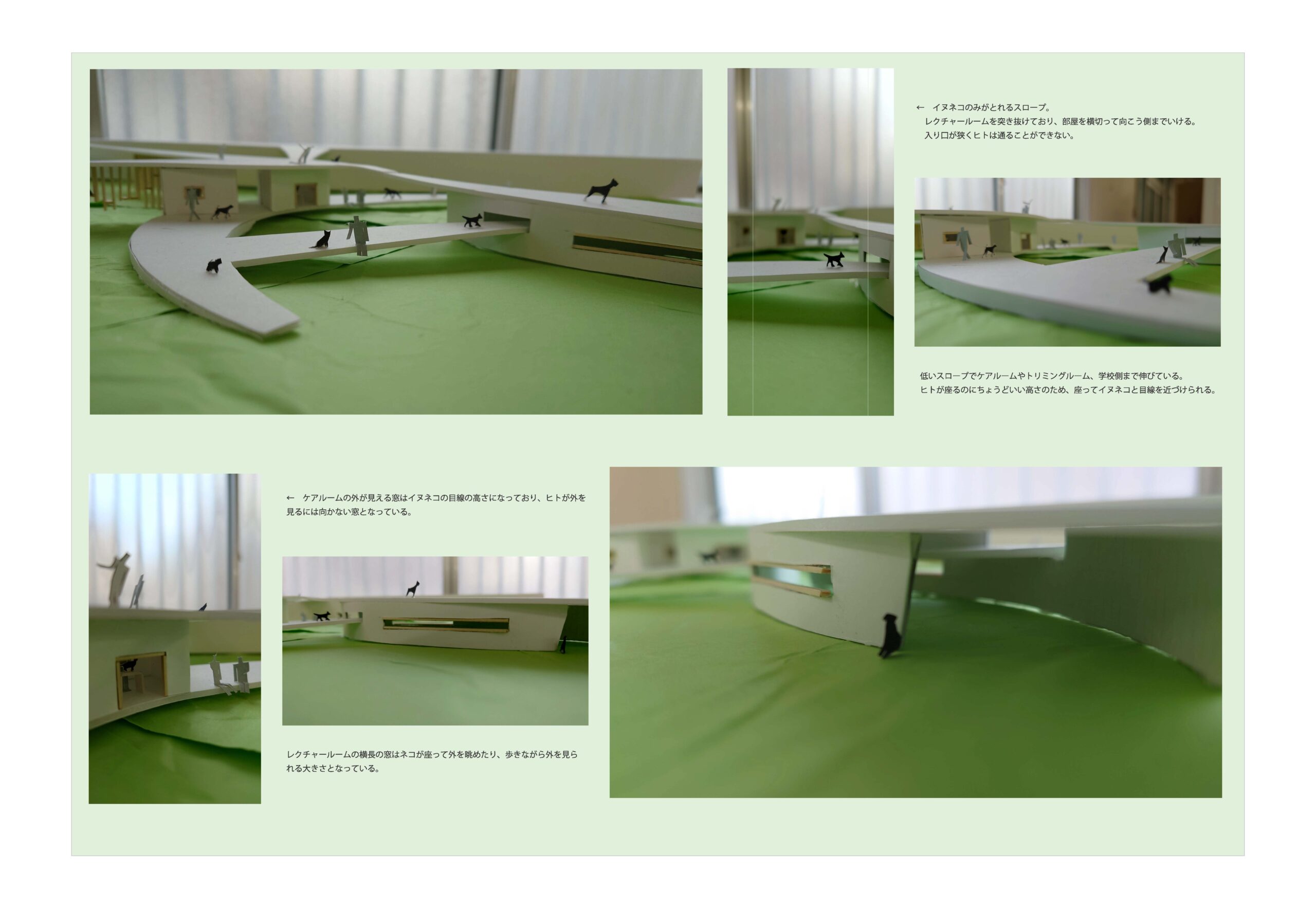 私と学生がそれぞれに飼っている、または飼っていたペットの話からテーマが決まった。敷地は彼女の地元の里山的風景を望む自然と人工の境界地である。この地域から施設とその運営可能とする役割を見つけ出し、それらをつなげることで全体を構成されている。またその「つながり」を「スロープ」として具象化・空間化し、設計している。現時点ではその内容に見合うだけの模型の完成度とは言えず、少し残念。 <田中 おと吉>