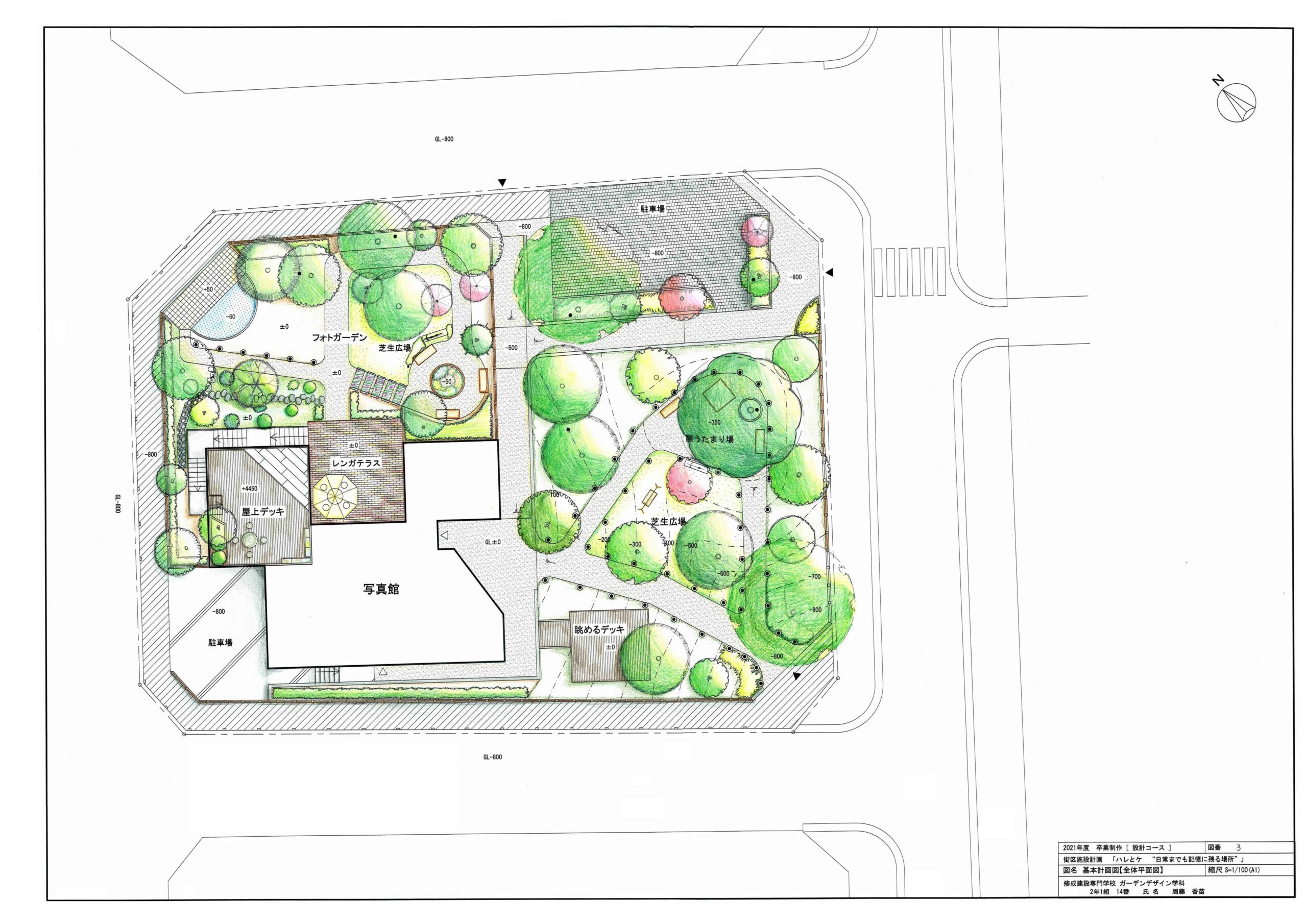 計画地周辺には小中学校があり、民家や集合住宅が多いため、西淀川区とその周辺に住む家族層を主なターゲットとした地域密着型の写真館を計画した。出入り自由な広場と記念撮影のできるフォトガーデンで、日常と特別な日のどちらも記憶に残せるアットホームで居心地の良い空間づくりをした。緑の多いこの写真館は、一度撮影して終わりではなく、何度も撮影に訪れるたびに人も植物も成長を感じられる楽しみがある。