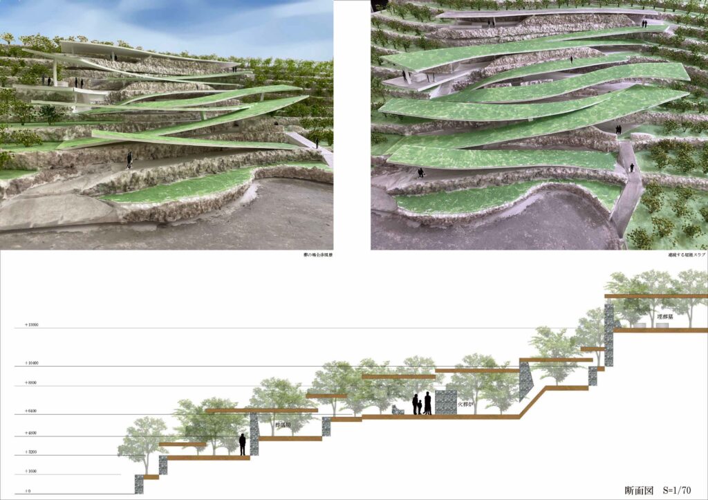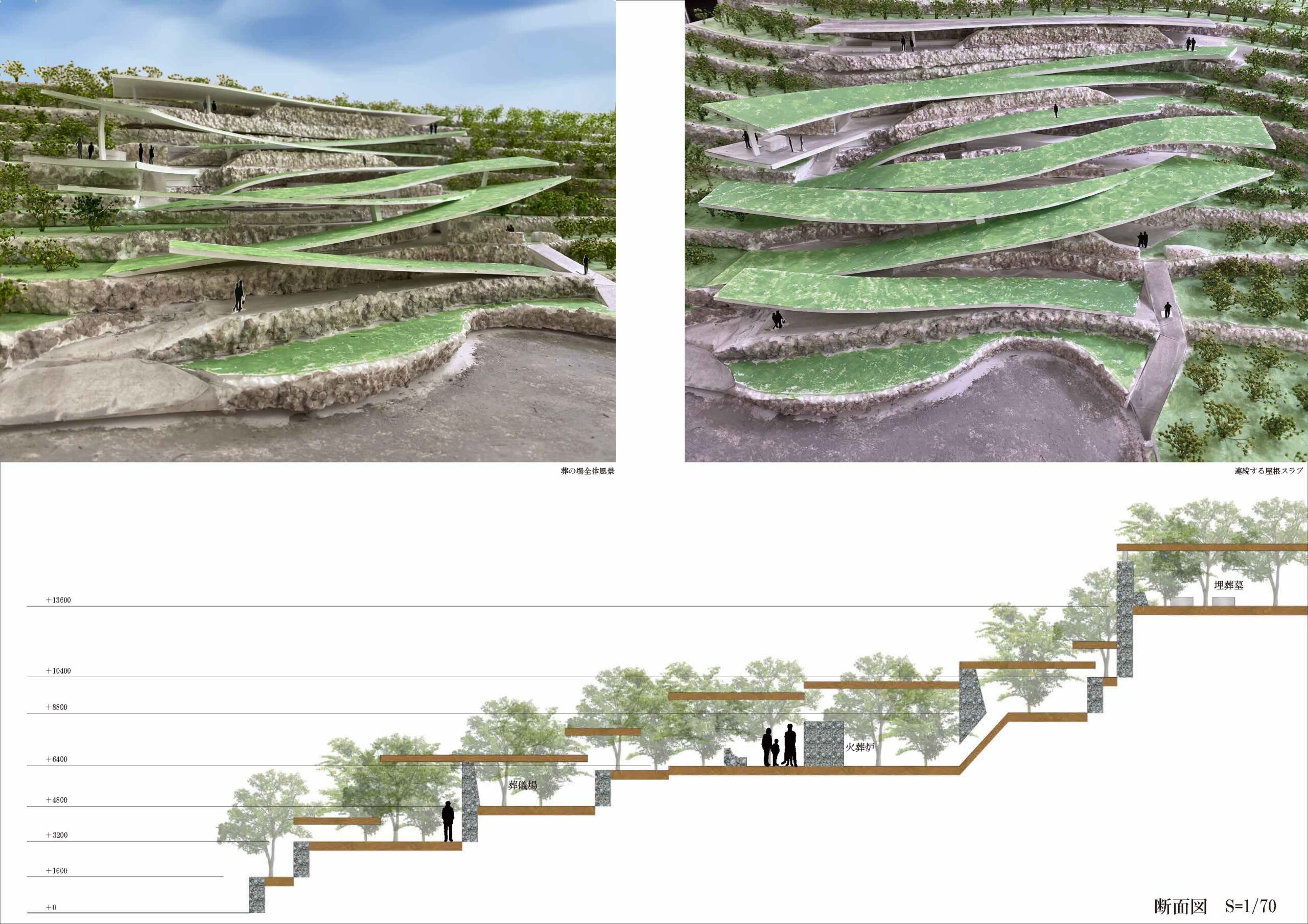 本作品は、地方が抱える若者流出の上、さらに新型コロナで追い打ちをかけられ加速化する「親族間や近隣とのつながりの喪失」に対し、「火葬」というテーマで取り組んだ極めて現代的な視点をもつ。八幡浜という地域特性と独特な地形を入念に調査して生み出された造形は、人を弔う人生の大事な時間・空間を、「ここにしかない」景観と体験に変換することに実現し、「これからの人と人のつながり方」の可能性のひとつを暗示させる。 <鍵山 昌信>