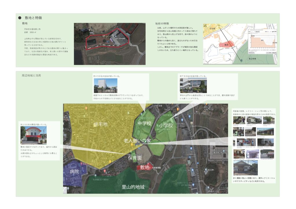 卒業設計を制作する為に、まず敷地を探しながら、自分のコンセプトに合わそうと考えました。敷地は、通学途中にあり、そこは道路が3面あり広大な敷地でした。この場所ならと思い敷地として選びました。