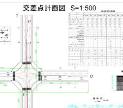 この作品は、私たちが日ごろ頻繁に使用している交差点の設計です。与えられた交通条件をもとに、交差点で渋滞が発生しないよう、信号の長さを調整するなどして計算した上で、交差点の幾何構造を決めました。計算結果を反映させながら内側半径・外側半径・緩和曲線の半径を算出し、それらを組み合わせて平面図の右折・左折導流路を表現したところはかなり苦労しました。是非交差点の真ん中に着目してみてください。