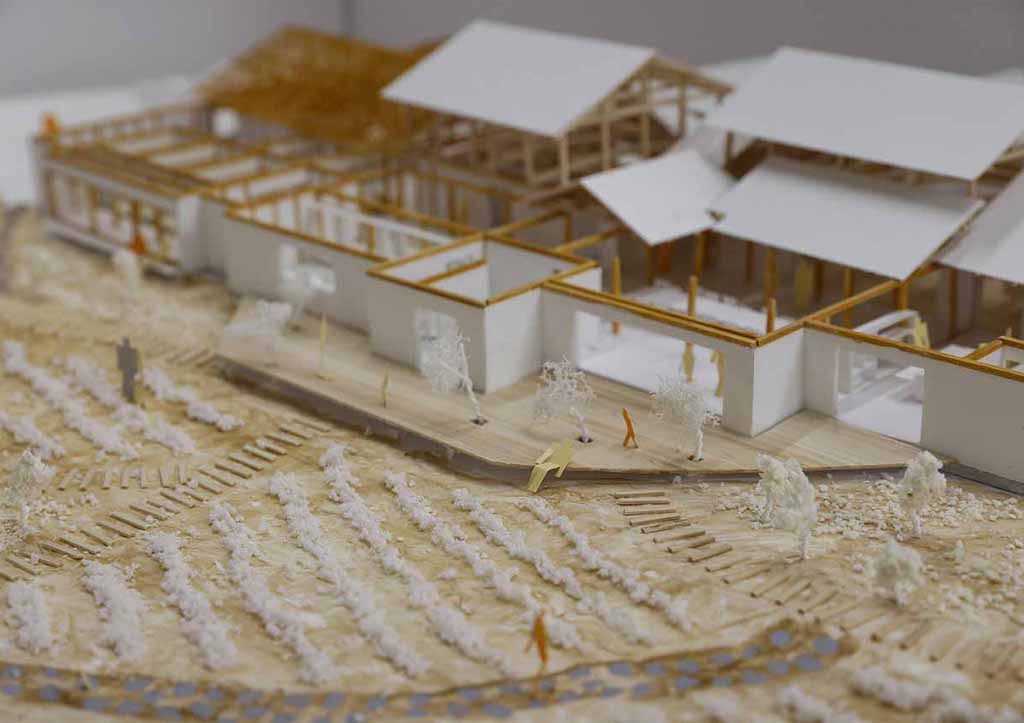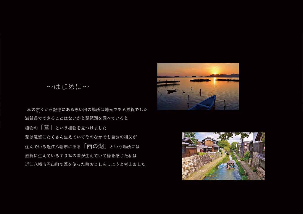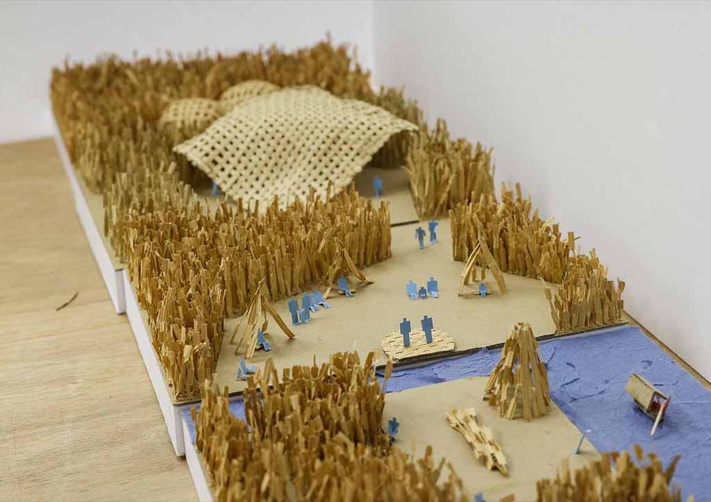 私の地元の滋賀県には「葦」が沢山生えていて、「葦」を刈り込んだり、編んだりすることによってできる空間づくりを体験する機会が日常的にありました。 「葦」という植物に興味を持ち、調べていくうちに「結」という共同体の精神に出会い、新しいものが生まれ、古いものは忘れられるこの時代に私は「結」を思い出し、知ってもらえるような場所を創ろうと思いました。 模型では葦をどう表現するかを試行錯誤しました。模型は後輩達に手伝ってもらい、アイデアはたくさんの先生方にアドバイスをもらいました。私はこの時に「結」の相互扶助の関係を感じました。私の作品を通して「結」を思い出し、知ってもらうのはもちろん章の面白さや魅力を知ってもらえるといいなと思います。