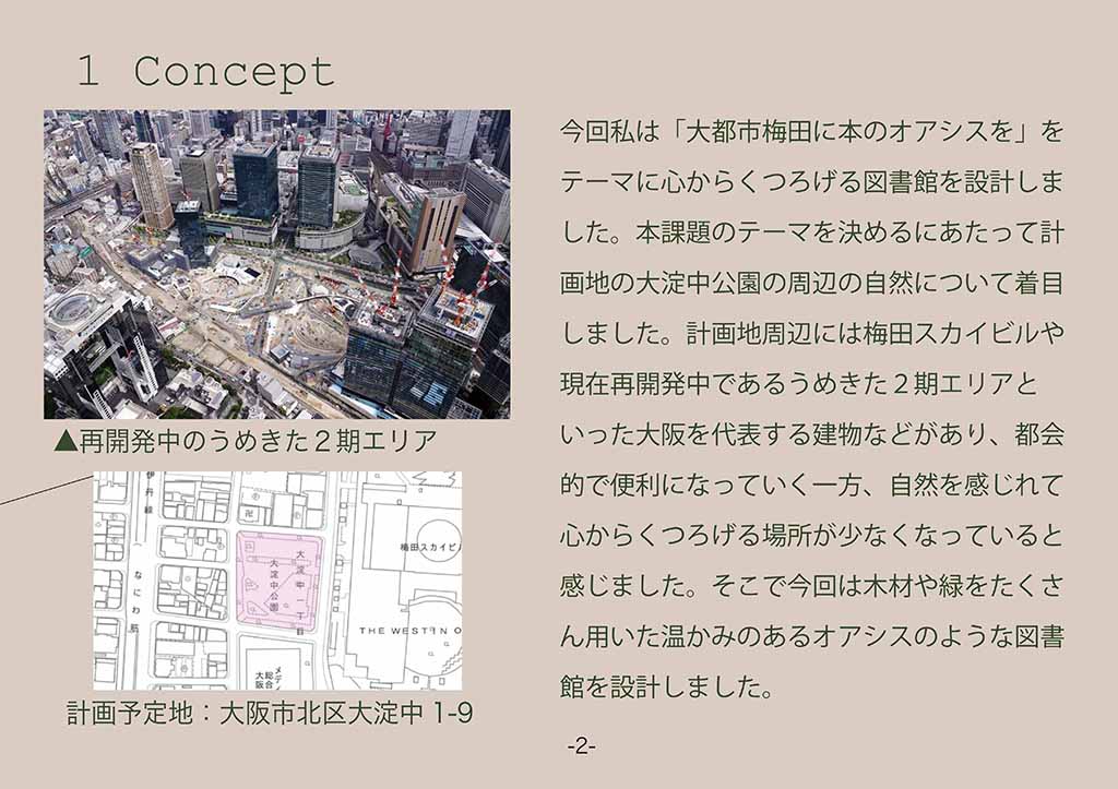 この作品はエリアごとに結婚式場・パン屋・こども園などの施設があり、この地域にはない新たな魅力が生み出されると共に多世代がこの公園に集まり明るく温かい街になってほしいと願う彼女の優しさが詰まった構成である。利用者の立場となって考え植栽・エリア全て1つ1つに緻密な仕掛けとこだわりがみられる。周囲を明るく照らし愛され者である、まさに『ひだまり森』のような作者本人を存分に表現した作品となっている。 <窪田 彩音>