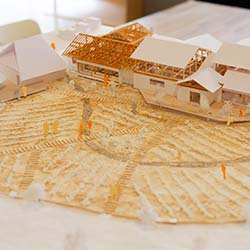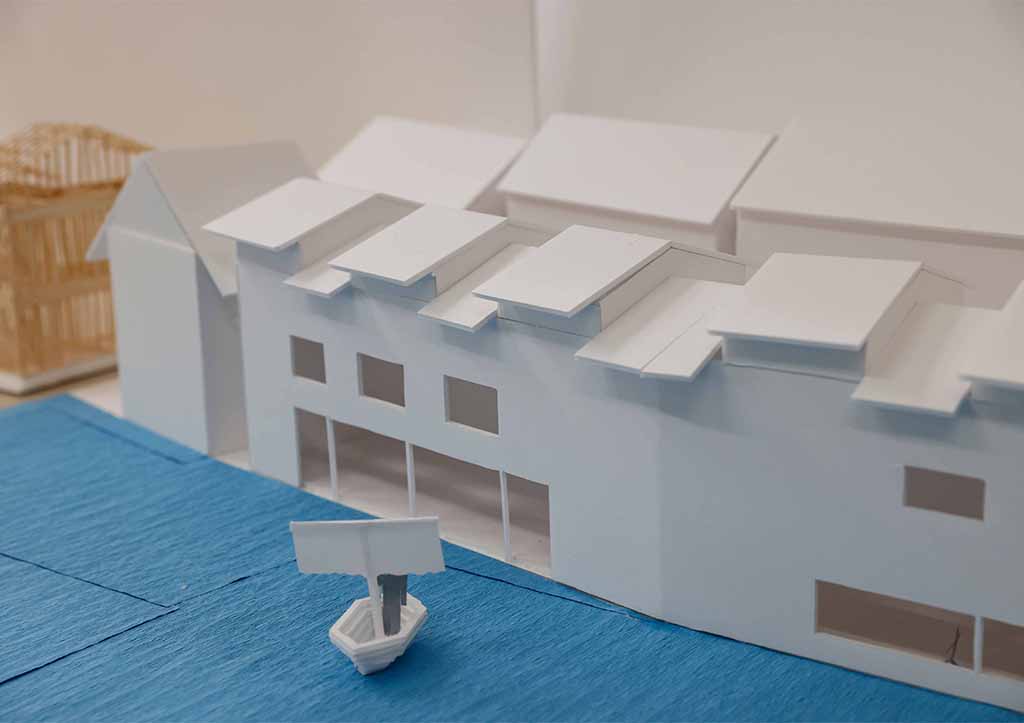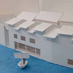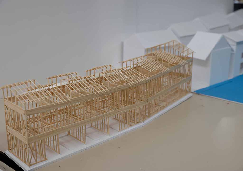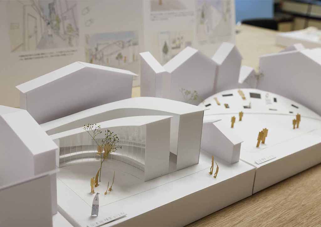 初めは舟屋についての理解が浅く、単純に幻想的な景色で綺麗な所だと感じて卒業設計の計画地としましたが、調査を重ねて形をつくっていく過程でだんだんと舟屋の雰囲気やデザインの理解が深まっていく実感を持つことができました。苦労した点は模型作りで、細かい部分の取り扱いや接着、組み立てを正確にするところが難しかったですが、小さな部品の作成や複雑な箇所の組立ての時は時間を忘れて作業に集中できました。屋根の形に変化をつけて特徴を持たせた部分が一番大変だったところです。初めての計画だったので、とにかくやってみると言う気持ちで進み続けて、最後までやり遂げた事に自分自身の成長を感じられ、完成したときにとても達成感がありました。