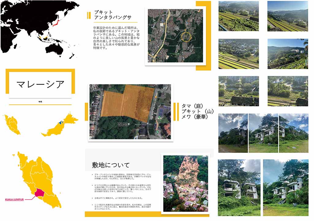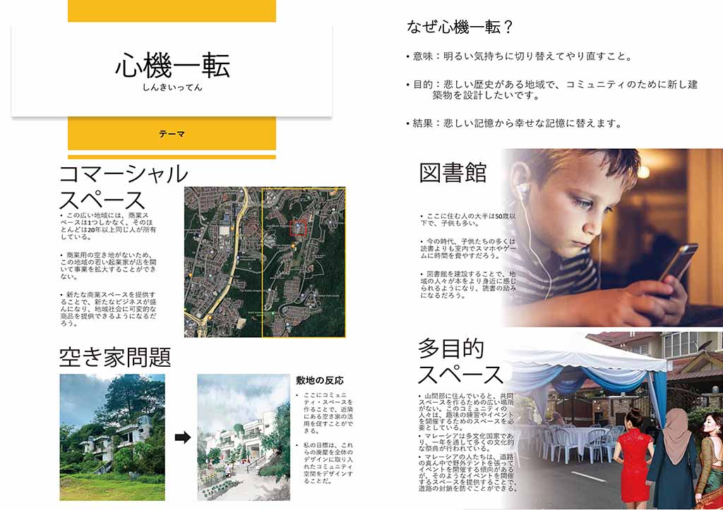 私の好きな日本語に「心機一転」という言葉があります。意味は明るい気持ちに切り替えてやり直すことです。私は悲しい歴史がある地域で、コミュニティのための新しい建築物を設計したいです。結果は悲しい記憶から幸せな記憶に替えます。2008年12月6日に私の故郷であるマレーシア、ブキ・アンタラバンサ地区で発生した地すべり事故は、 14棟の住宅が倒壊したほか、4 人が死亡、15 人が負傷しました。この場所は現在では一部の廃墟を残すままで、何も利用されていない斜面地が広がっています。この場所をポジティブな場所として利用することで、集団的進歩の感覚を育める場所を考えました。 地域のニーズに応え、地元の起業家が店を構えるスペース、地域の人が利用できる空きスペース、人々が読書や勉強をするための快適な図書館などのコミュニティ複合施設の提案をします。