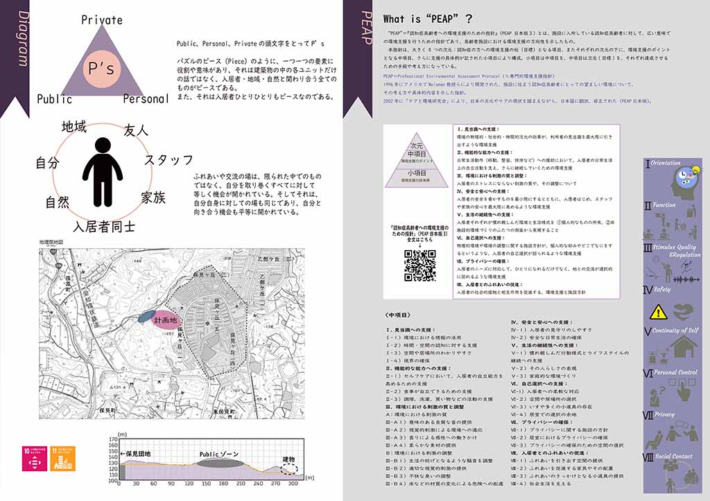 入管法の改正以来、日本国内の在留外国人は増加傾向にある。長期滞在する中で自国ではなく日本を終の棲家として選んだ外国人高齢者の、特に外国人の認知症に着目した。認知症の発症の予防・進行の抑制にフォーカスを当て、かつ建築的側面からアプローチする上でPEAPという環境指針を採用した。