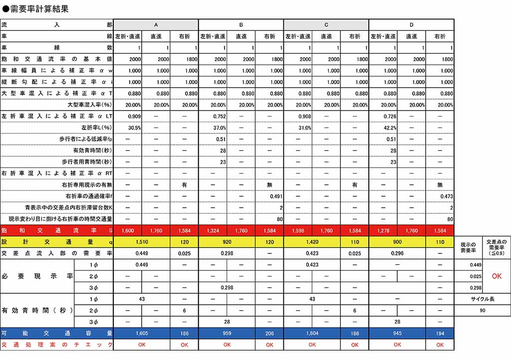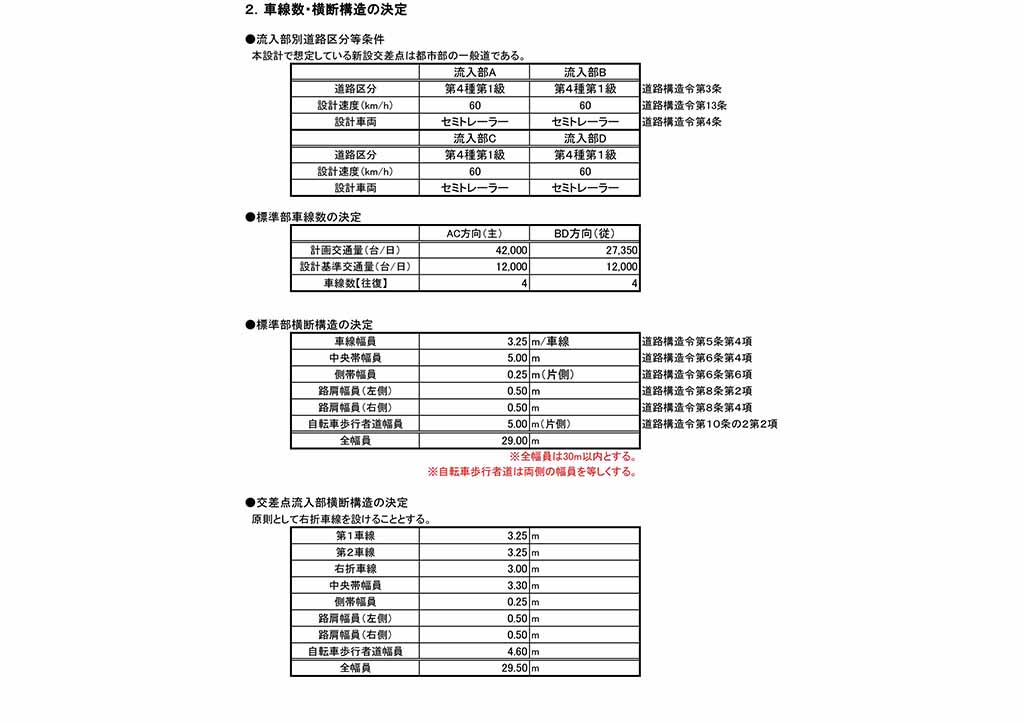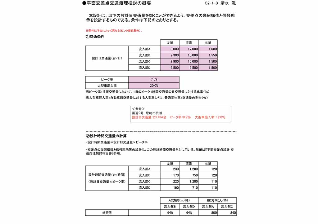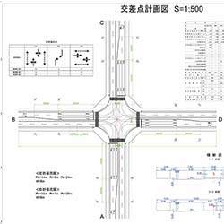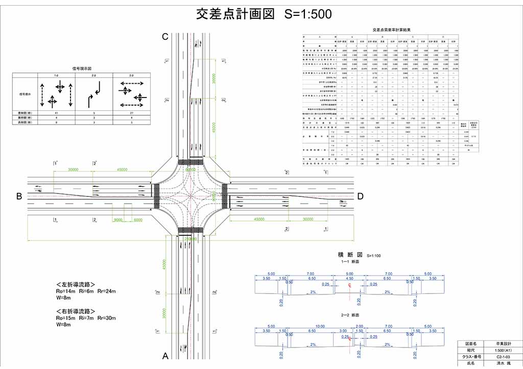 この作品は、ある想定の交通流を捌くことができる交差点を設計するという、土木のソフト面である「交通工学」をメインとしたものである。信号現示を調整し、需要率を下げて交通流を捌くことができる交差点が設計されている。ハード面についても、道路構造令に準拠した幾何構造で、苦労した導流路も正確に描かれている。ハード面とソフト面の両方が考慮された、現実の設計に近い作品であった。 <広瀬 一樹>