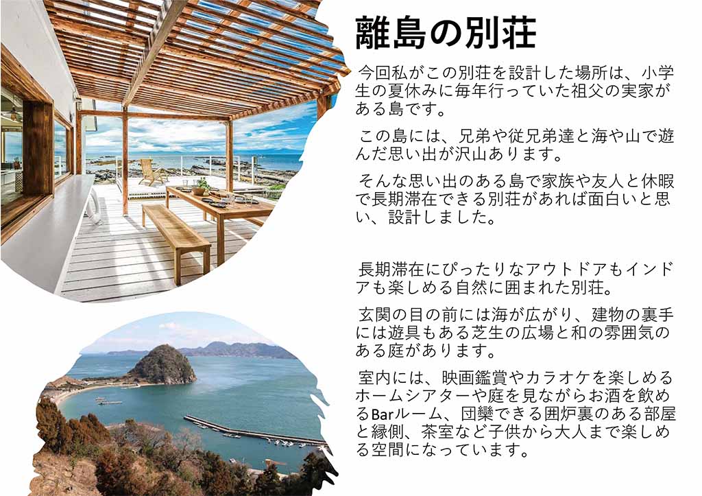 私が今回卒業設計で計画した場所は、私が小学生の夏休みに毎年行っていた祖父の実家のある島にしました。私にとって毎年通った思い出深い場所です。この場所で理想的な別荘を建設する事を計画しました。この別荘のコンセプトは、アウトドアとインドアの両方を楽しめ、自然に囲まれた別荘です。玄関の目の前には海が広がり、すぐに海に飛び込めます。建物の裏手には芝生の広場と建物の雰囲気にあった日本庭園、室内では映画鑑賞やカラオケを楽しめるホームシアター、庭を眺めながらのBarルーム、団欒できる囲炉裏部屋、縁側と子供から大人まで楽しめる空間に盛り込みました。卒業設計を進めていく中で、普段の授業では学び切れない木造軸組工法の構造についての知識を得ることができました。模型製作では、図面を読みながら立体的に組み上げていく過程は、難しさもありましたが、楽しくもあり、ものづくりの楽しさを改めて感じられた卒業設計でした。