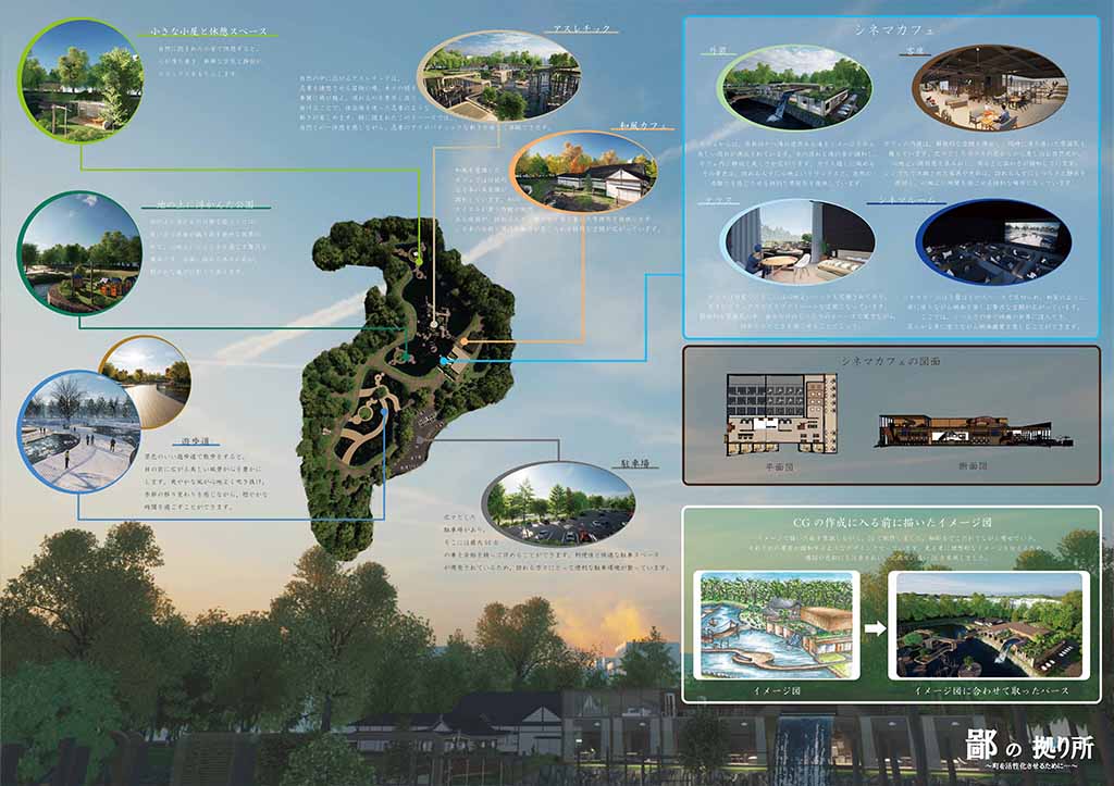 三重県名張市の観光地不足や知名度の低さという地域特有の課題に対し、創造的かつ具体的な解決策を提案している。施設のデザインにおいては、SNSや若者文化との連動を意識し、映える要素を取り入れることで、広範な層に訴求する魅力的な場所を構築している。
