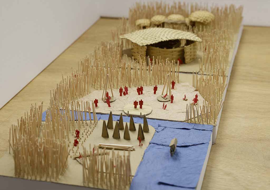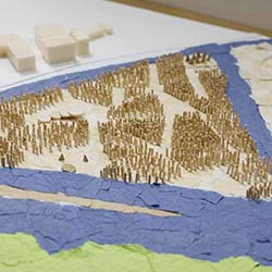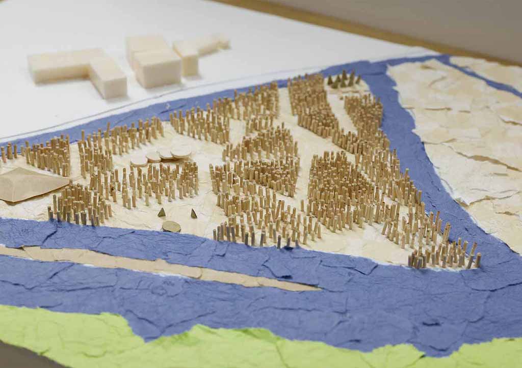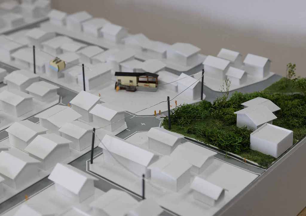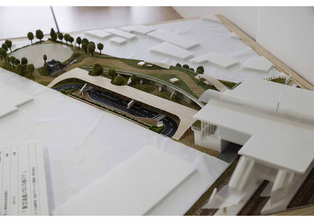 この模型の見どころは、素材にこだわりました。たとえば多目的広場。実際に作るのであれば、コンクリートを使用する仕様なので、模型ではモルタルを使用し作成。他にも木の幹は、木製の爪楊枝を使用しました。そうすることで実物に似た質感を得ることができ、よりリアルに表現できるからです。ぜひよく目を凝らして見てみてください。