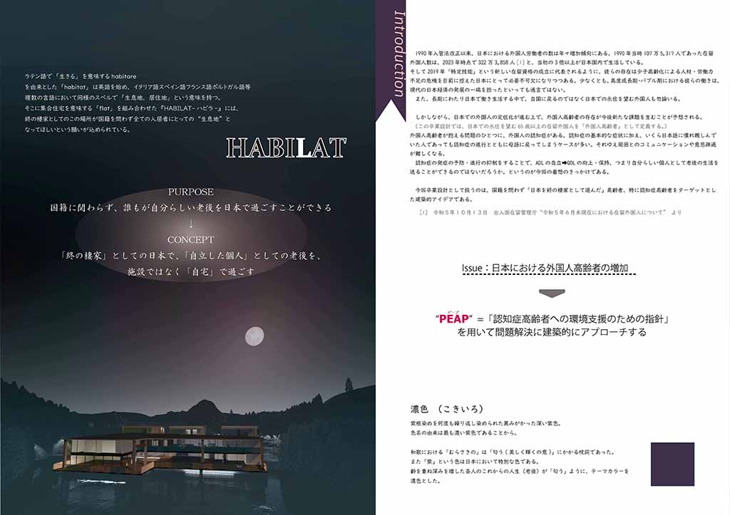 この計画は、日本における在留外国人の高齢化に対する重要な課題に焦点を当て、その解決に向けた革新的なアプローチを提示している。PEAPという環境指針を採用することで、認知症の予防や進行の抑制に焦点を当て、建築的にその指針を形作ることに取り組んでいる点が高く評価される。在留外国人が日本を終の棲家として選択する際の新たな選択肢としての役割を果たすという視点は、地域社会における多様性と包摂性を促進し、在留外国人が日本社会においてより自立した個人として生きることを支援する取り組みとなる。今後もこのような社会的課題に対する建築の役割を模索し、積極的に取り組んでいくことを期待する。 <見邨 佳朗>